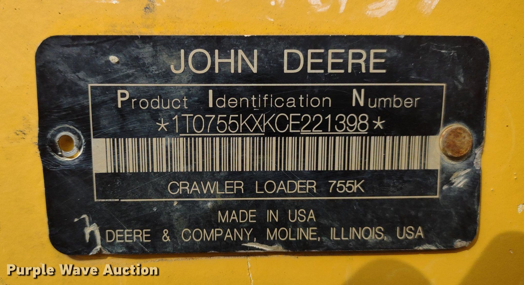 Purple Wave is selling a used Crawler Loader in Kansas. This item is a 2012 John Deere 755k track loader with the following: Hours: 7,209 on meter, Serial: 1T0755KXKCE221398, Unit #: 14.708