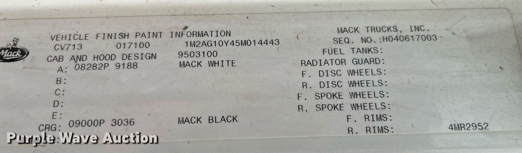 2005 Mack CV713 dump truck. Miles: 602,383 on odometer, Hours: 28,547 on meter, VIN: 1M2AG10Y45M014443, Unit #: 5-408. Engine Mack AMI, Displacement: 12.0L, Cylinders: 6, Fuel type: Diesel. Transmission Mack Maxitorque ES, Manual, Speed: 10. Chassis Axles: Triple, Pusher axle, Differential lock: Inter-axle, Suspension: Camelback, Brakes: Air, PTO. Interior AC, Heat, Heated mirrors, Cruise control, Brake controller. Features Dump bed Ox Bodies 16FT15-17YDS, 16' L x 8' W, Side height: 45", Side board height: 16", Bed type: Steel, Roll tarp, Ram: Single , End gate: Air operated. Tires Front: 425/65R22.5, Rear: 11R24.5, Lift axle: 11R22.5. Notes Dash warning indicator: ABS, Engine issues. Missouri title. Title distribution may be delayed up to 30 days from verification of funds. Emery Sapp. 6739 Co Rd 423. Palmyra, MO 63461