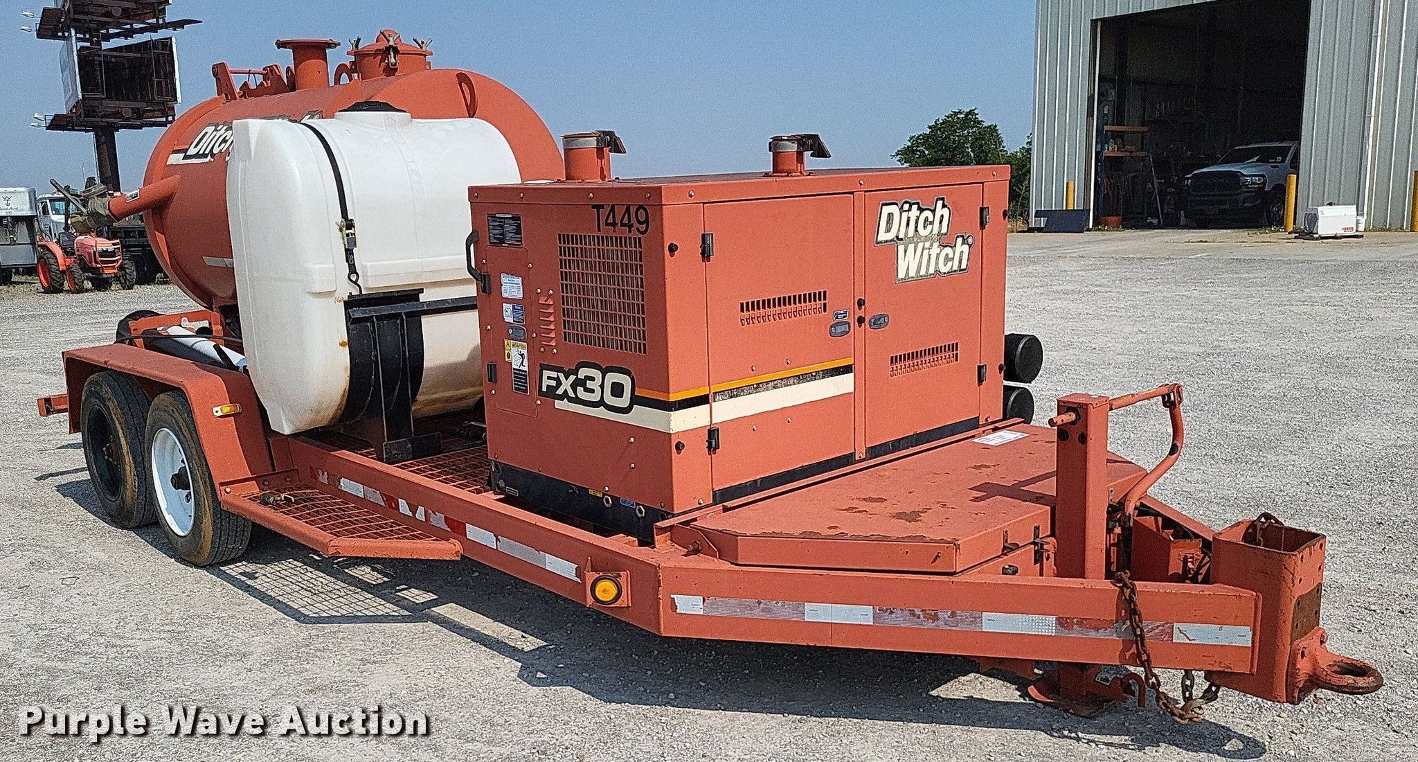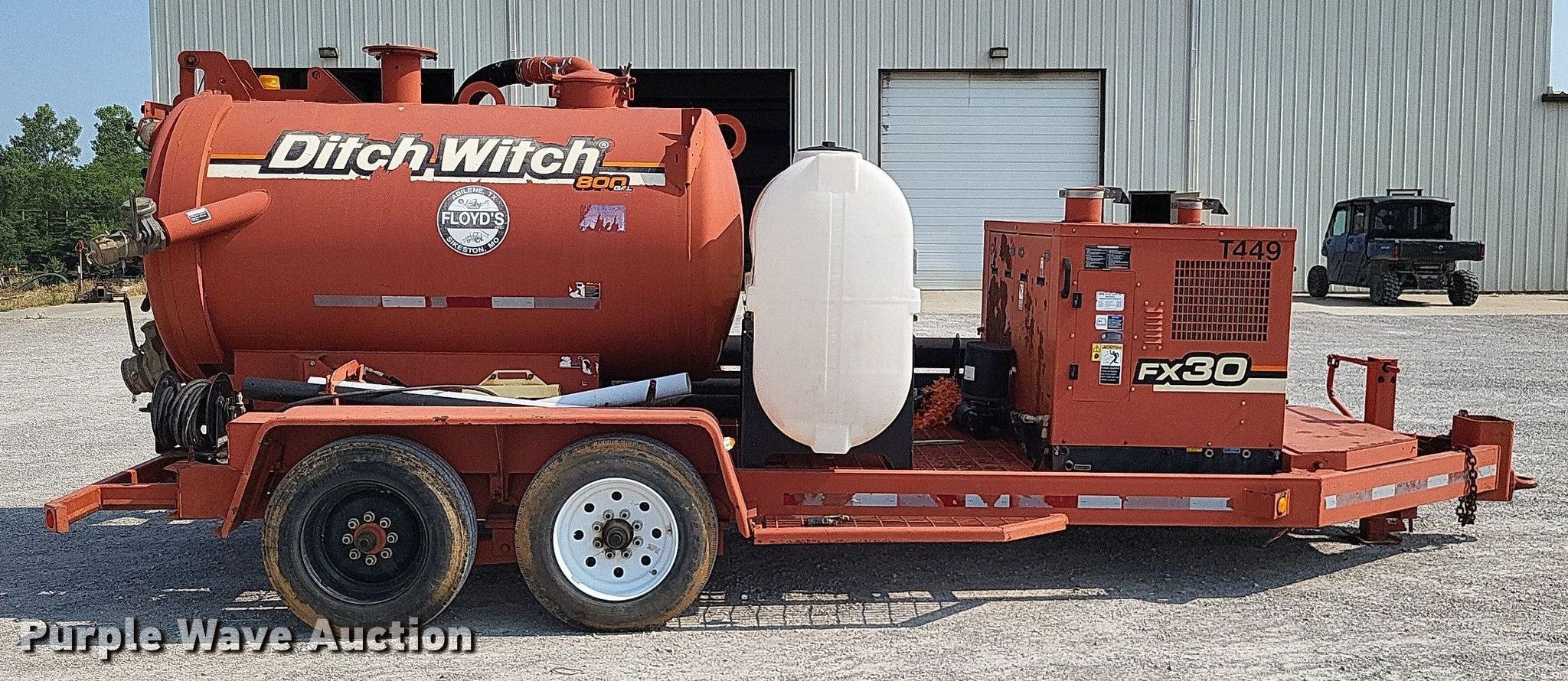2011 Ditch Witch FX30 vacuum excavator. Hours: 746 on meter, VIN: CMWFX30XAB0001061, Unit #: T449. Engine Kubota D1105-T-E3B-DWCH-1, Cylinders: 3, Fuel type: Diesel. Features Spoils tank Capacity: 800 gallons, Water tank Capacity: 200 gallons, Water pump, Vacuum pump Inlet valve size: 4", Outlet valve size: 6". Trailer 2010, 21' L x 102" W, Suspension: Spring, Brakes: Electric, Axles: Tandem, GAWR: 8,000 lbs. This is worksite support equipment and will not come with a title. Transfer of ownership documentation will be a bill of sale. Floyd's Inc.. 225 N Interstate Dr. Sikeston, MO 63801