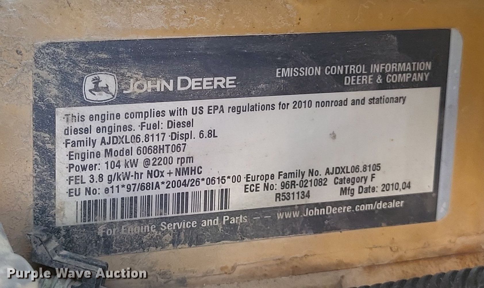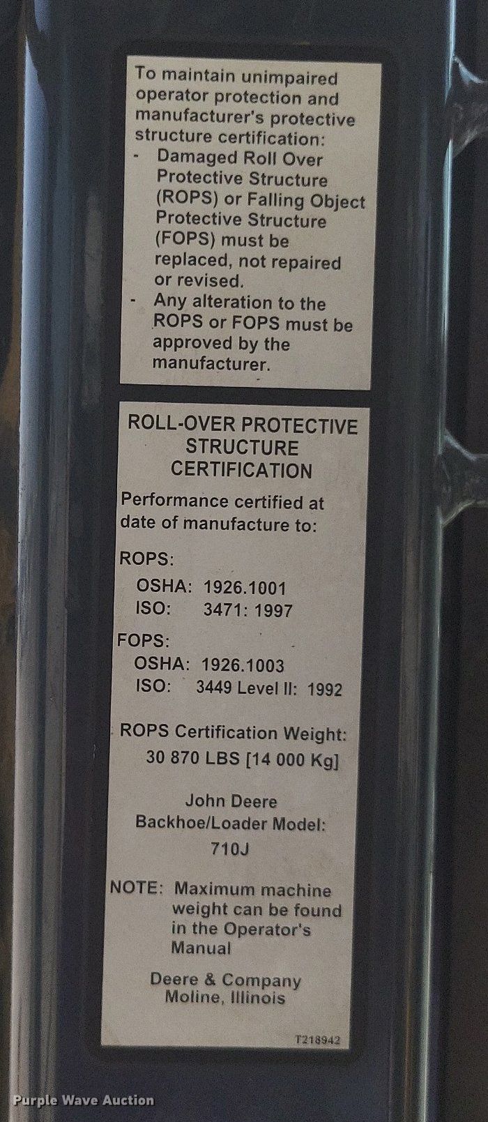 2010 John Deere 710J backhoe. Hours: 2,225 on meter, Serial: 1T0710JXHA0187045. Engine John Deere 6068HT067, Displacement: 6.8L, Cylinders: 6, Fuel type: Diesel. Transmission Powershift, 4F - 3R. Chassis Four wheel drive, Differential lock. Operators station EROPS, AC, Heat, Backhoe controls: Pilot control. Features Loader Quick coupler: Manual, Bucket Width: 95", Cutting edge: Bolt-on, Backhoe Extendable stick, Quick coupler: Manual, Auxiliary hydraulics, Bucket Width: 23", Cutting edge: Weld-on, Teeth: 5.. Tires Front: 15-19.5, Rear: 20.5-25 L2. Floyd's Inc.. 225 N Interstate Dr. Sikeston, MO 63801
