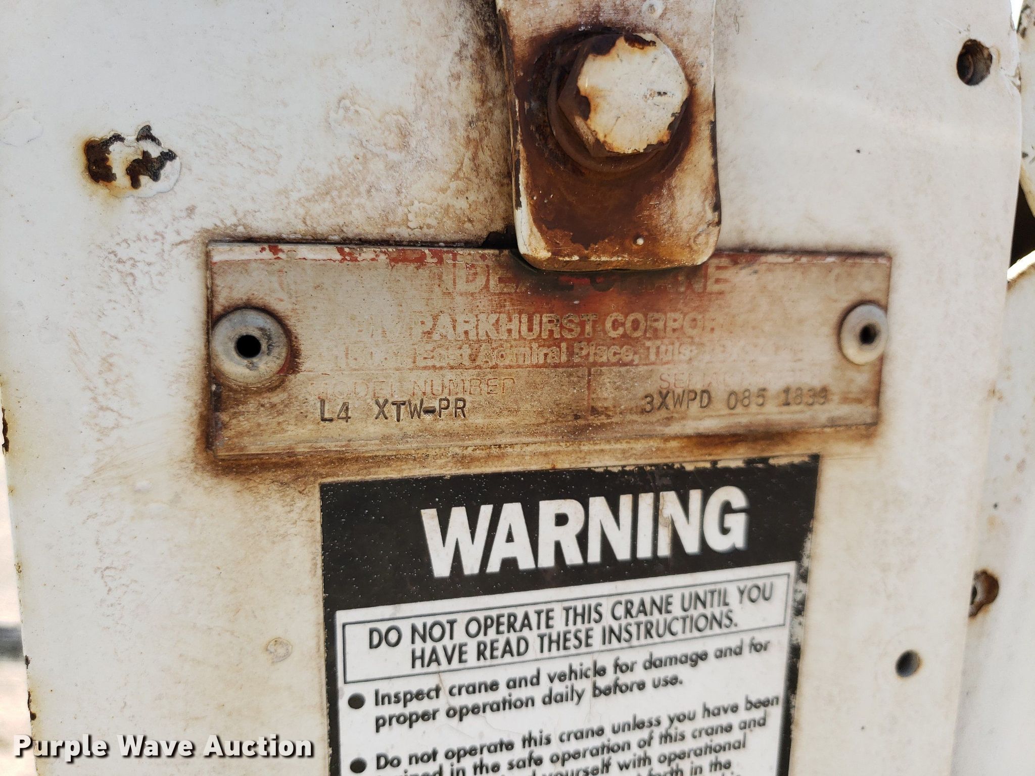 2000 International 4700 utility / service truck. Miles: 335,579 on odometer, Hours: 15,570 on meter, VIN: 1HTSCAAL0YH313855. Engine Displacement: 7.6L, Cylinders: 6, Fuel type: Diesel. Transmission Automatic. Chassis Axles: Single, Suspension: Air, Brakes: Air. Interior AC, Heat, Heated mirrors, Cruise control. Features Bed 14' 6" L x 96" W, Oil/lube system Reservoirs Hydraulic fluid, Crane Parkhurst L4 XTW-PR. Tires Size: 295/75R22.5. Notes Non-operational crane. Kansas title. Title distribution may be delayed up to 14 days from verification of funds. Pearson Construction, LLC. 2901 North Mead Street. Wichita, KS 67219