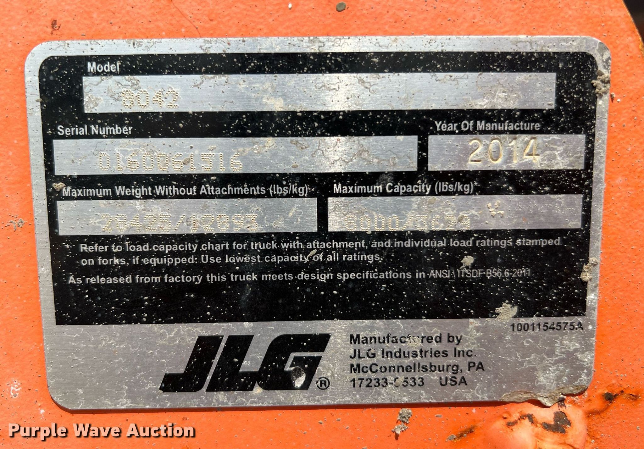 Purple Wave is selling a used Telehandler in Texas. This item is a 2014 JLG Skytrack 8042 telehandler with the following: Hours: 3,092 on meter, Serial: 709264018414