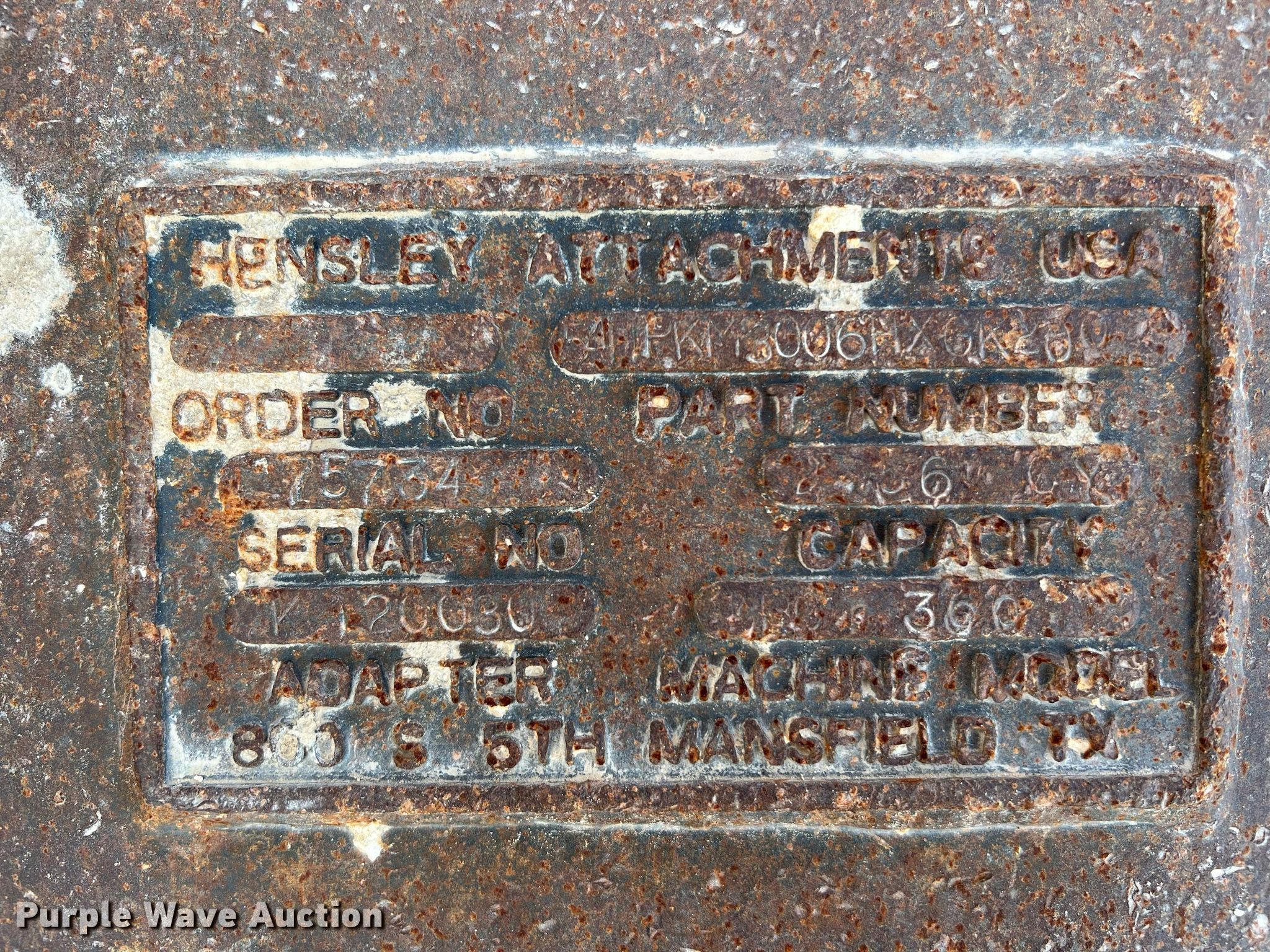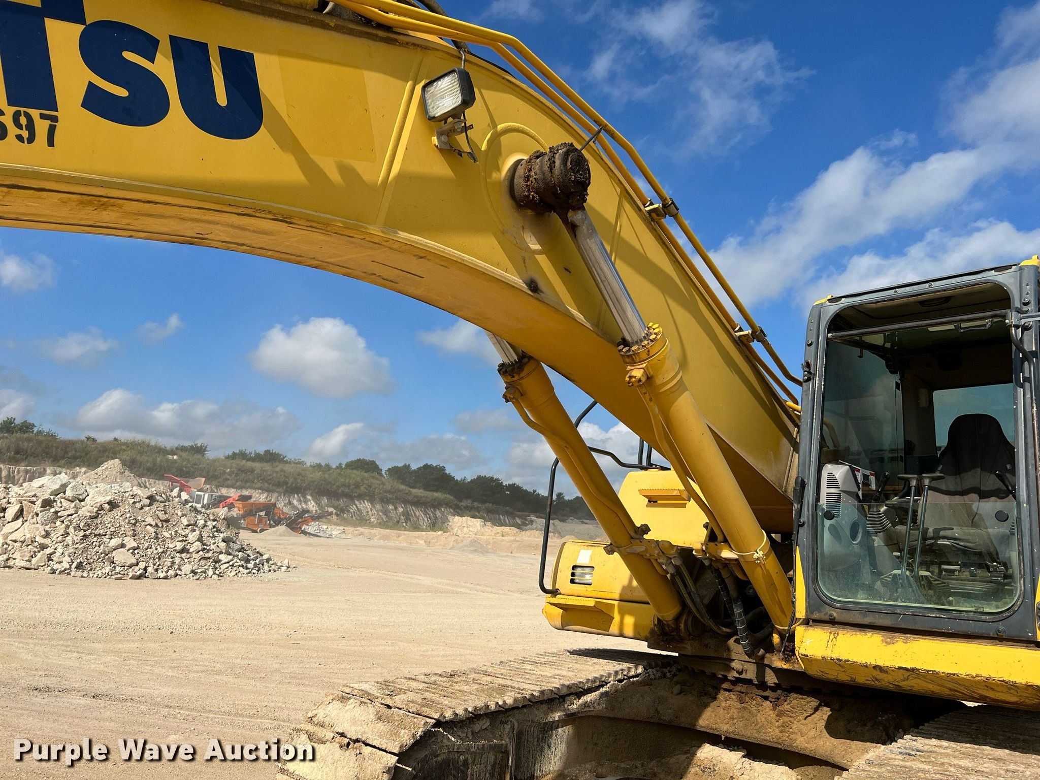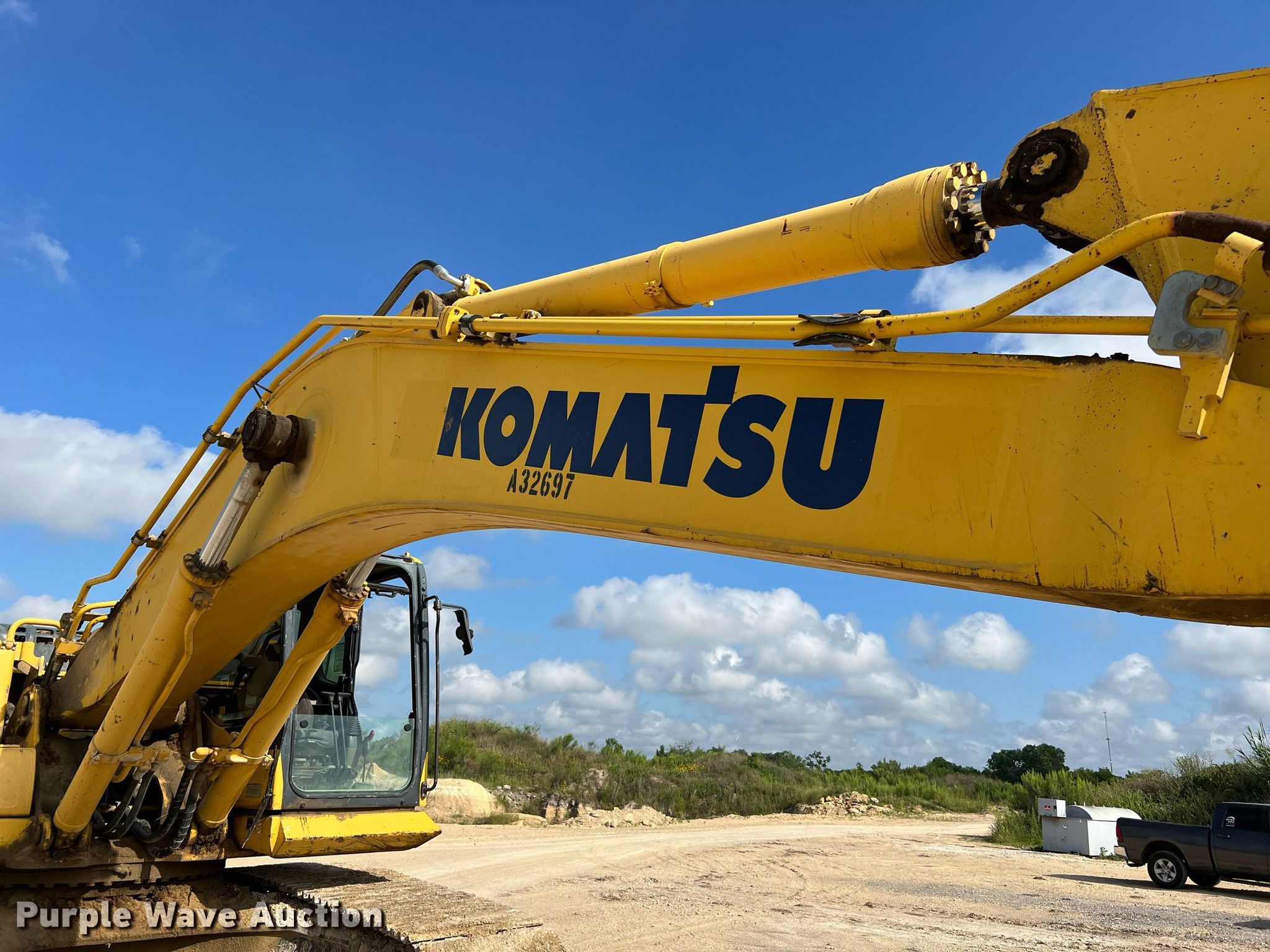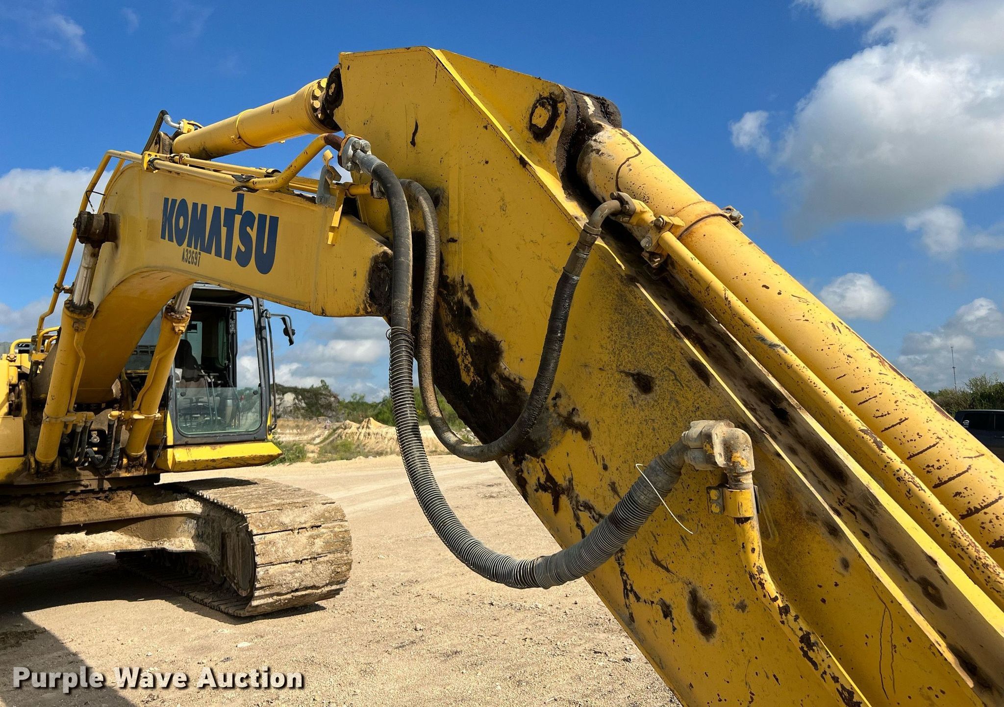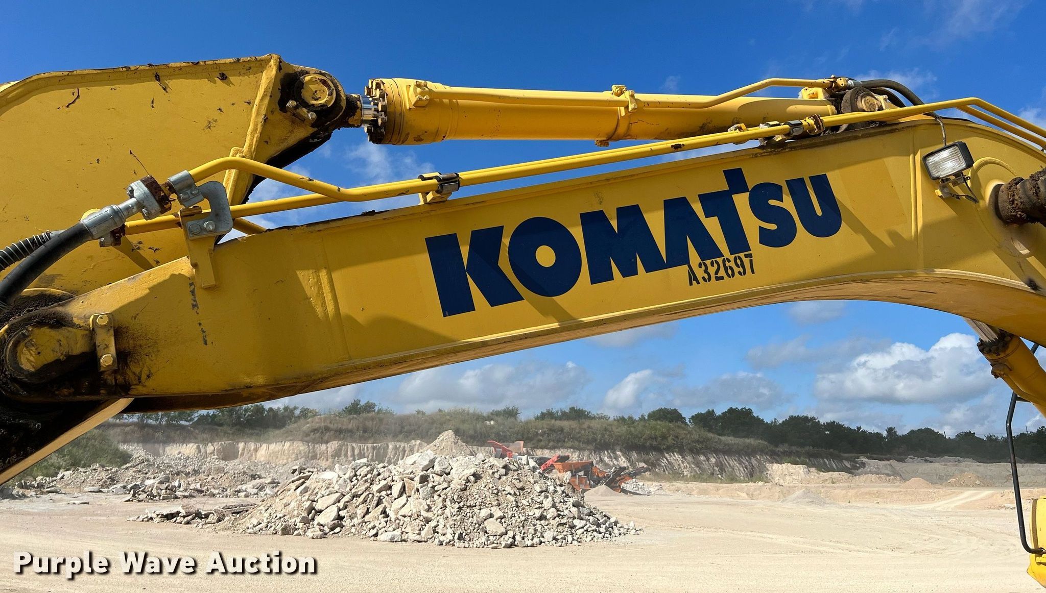 2012 Komatsu PC360LC-10 excavator. Hours: 11,143 on meter, Serial: KMTPC242C54A32697. Engine Komatsu, Displacement: 8.9L, Cylinders: 6, Fuel type: Diesel. Transmission Hydrostatic, Three speed travel. Operators station EROPS, AC, Heat. Features Boom Standard, Stick Stick length: 13' 10", Bucket Hensley, Width: 55", Cutting edge: Weld-on, Teeth: 6. Tracks Width: 34", Steel, Grouser pads: Triple. Notes Glass cracked, DPF deleted, Front glass does not close, Non-operational climate controls. Duran Gravel Co.. 1325 Lovers Lane. Lockhart, TX 78644