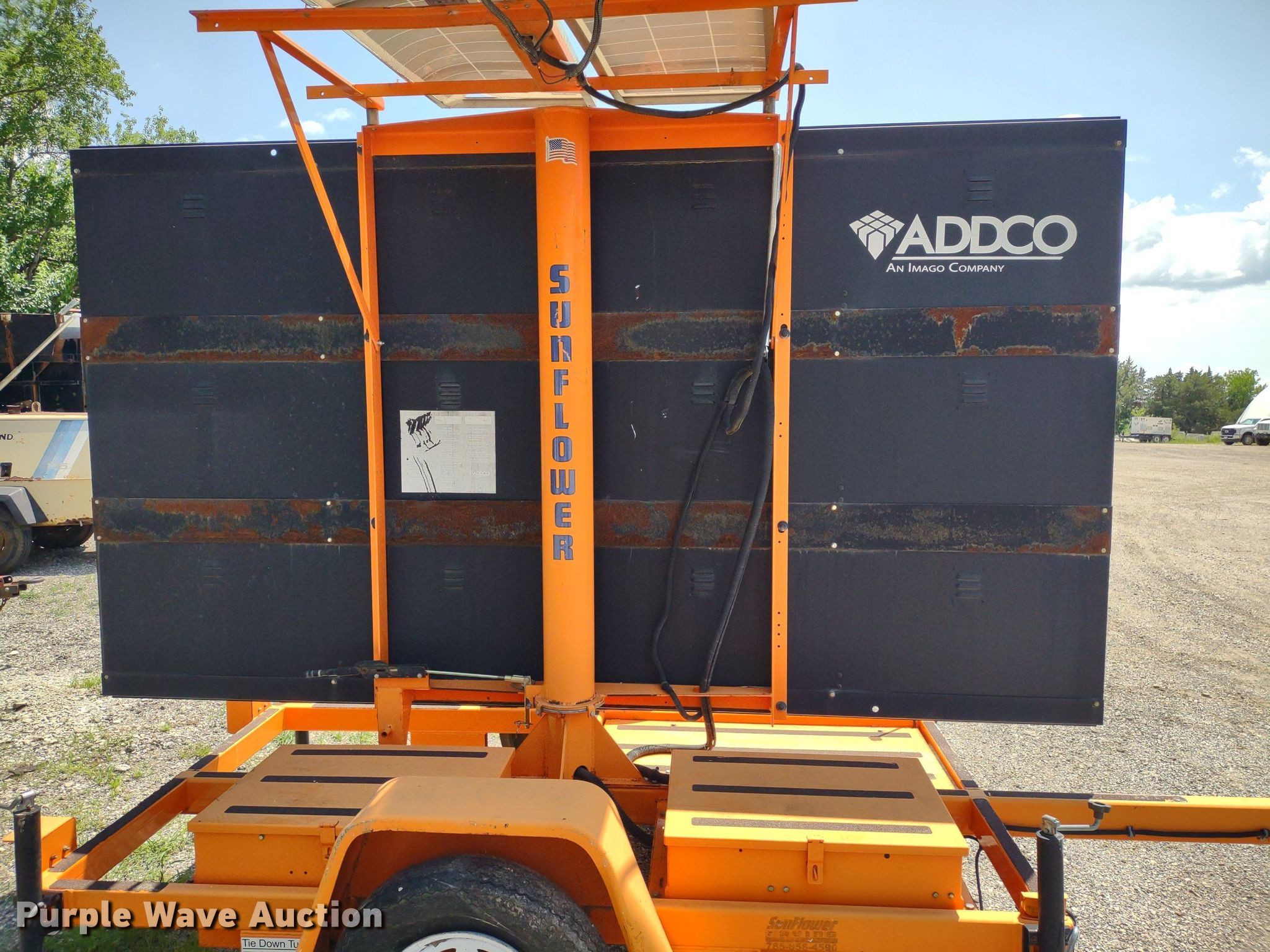 2012 Addco message board trailer. VIN: 4SEPN1611CM4SE625, Serial: 591831, Unit #: 9393. Tires Size: 205/75D15. Notes Solar panel damaged, may need replaced, Flat tire. This is worksite support equipment and will not come with a title. Transfer of ownership documentation will be a bill of sale. Sunflower Paving Inc./RD Johnson Excavating. 3701 East 23rd Street. Lawrence, KS 66046
