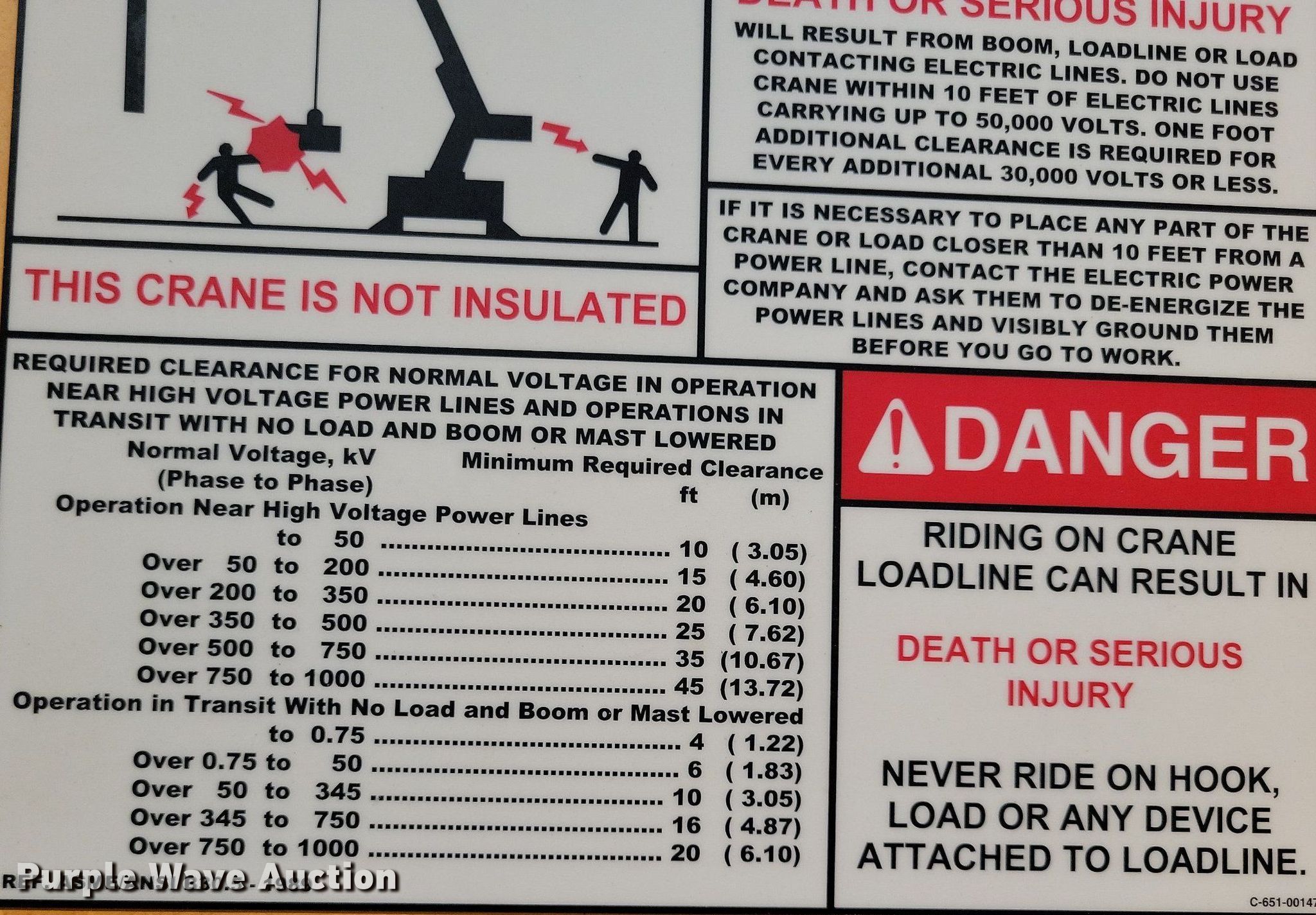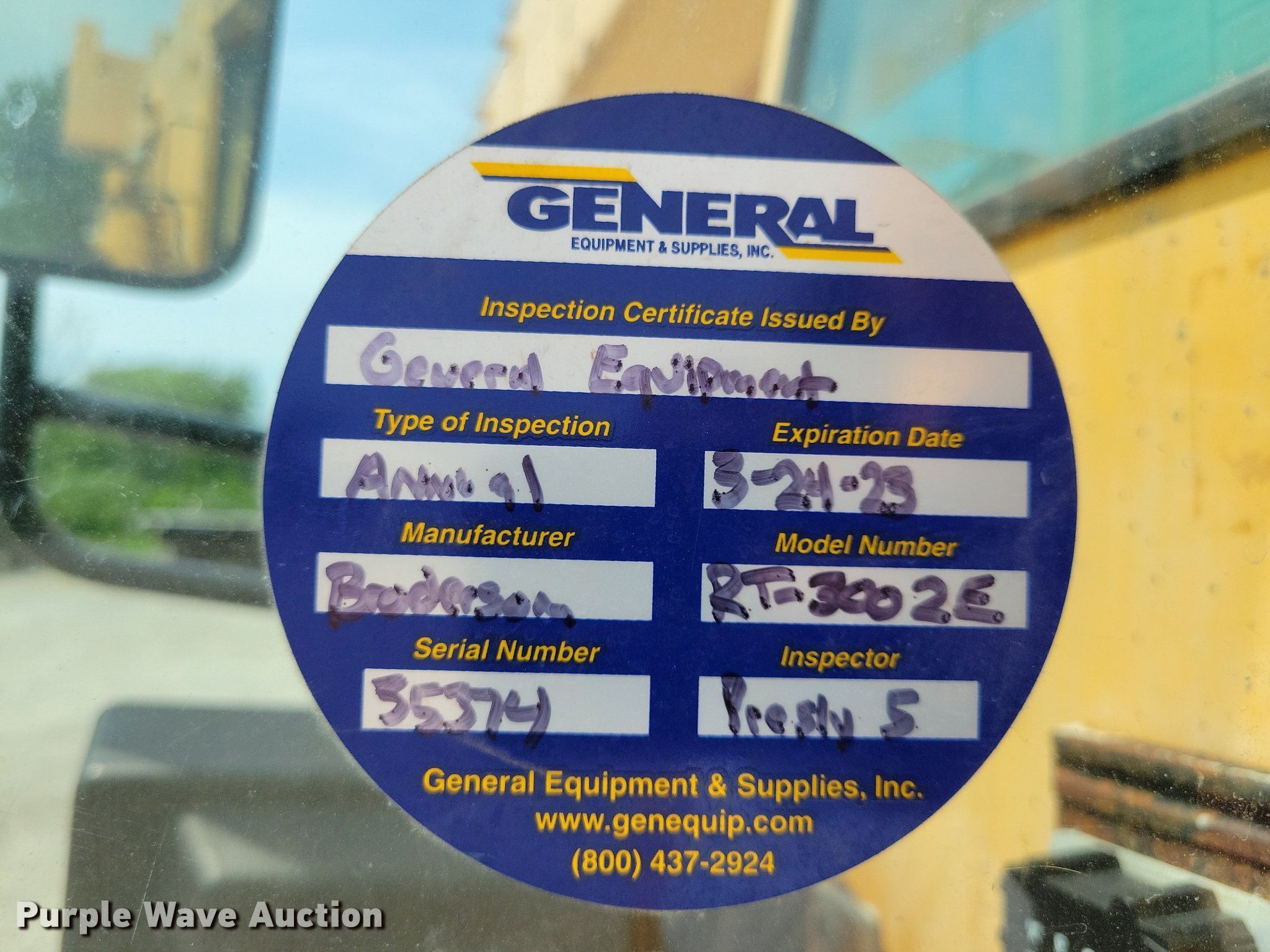 2009 Broderson RT-300-2E crane. Hours: 6,044 on meter, Serial: 35374. Engine Cummins QSB4.5, Serial: 46911072, Displacement: 4.5L, Cylinders: 4, Fuel type: Diesel. Transmission Powershift, 6F - 3R. Chassis Brakes: Hydraulic. Operators station Enclosed cab, AC, Heat, Crane controls: Stick. Features Boom Telescopic, Maximum boom length: 60' Sections: 4, Maximum lift capacity: 30,000 lbs, Maximum lift height: 88', Jib: 20', Stabilizers: 4, Boom controls In-cab, Winches: 1, Removable counter weight, Crane block Sheaves: 2, Crane ball & hook, Greer MG586 LMI weight system, Certification valid through: March '23, Lift chart. Tires Size: 17.5-25. BC Murphy Enterprises, LLC. 1299 White Pole Road. Anita, IA 50020