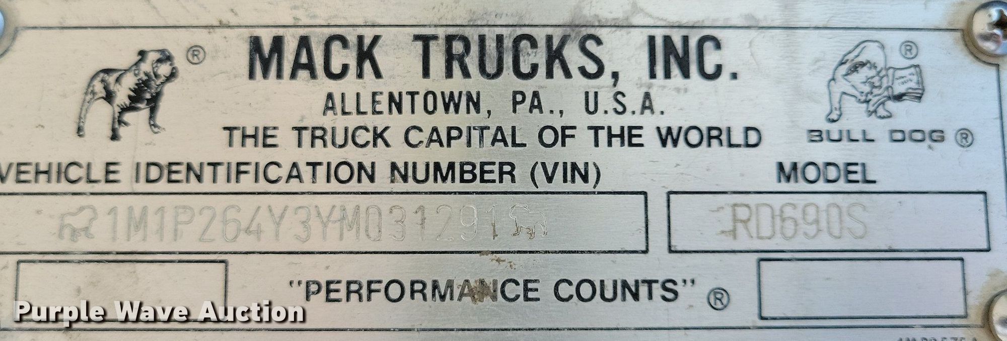 Purple Wave is selling a used Truck Tractor in Iowa. This item is a 2000 Mack RD690S semi truck with the following: Miles: 15,526 on odometer, Hours: 3,227 on meter, VIN: 1M1P264Y3YM031291