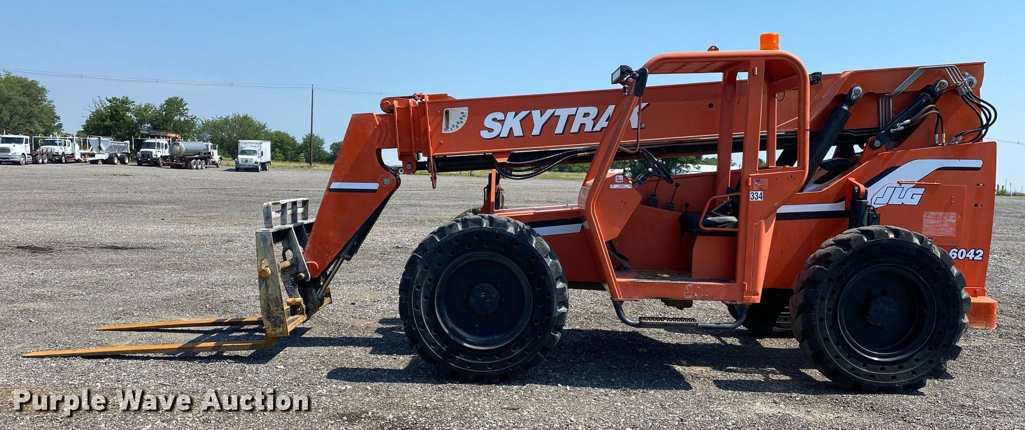 2005 SkyTrak 6042 telehandler. Hours: 4,673 on meter, Serial: 0160008334. Engine Cummins B4.5, Serial: 46433587, Cylinders: 4, Fuel type: Diesel. Transmission Powershift, 4F - 4R, Four wheel drive. Operators station Canopy, Steering: Crab, Four wheel. Features Maximum lift capacity: 6,000 lbs, Maximum lift height: 42', Boom stages: 3, Fork length: 72", Tilt carriage. Tires Size: 13.00-24/8.5, Solid. 15600 N 145th E. AVE. Collinsville, OK 74021