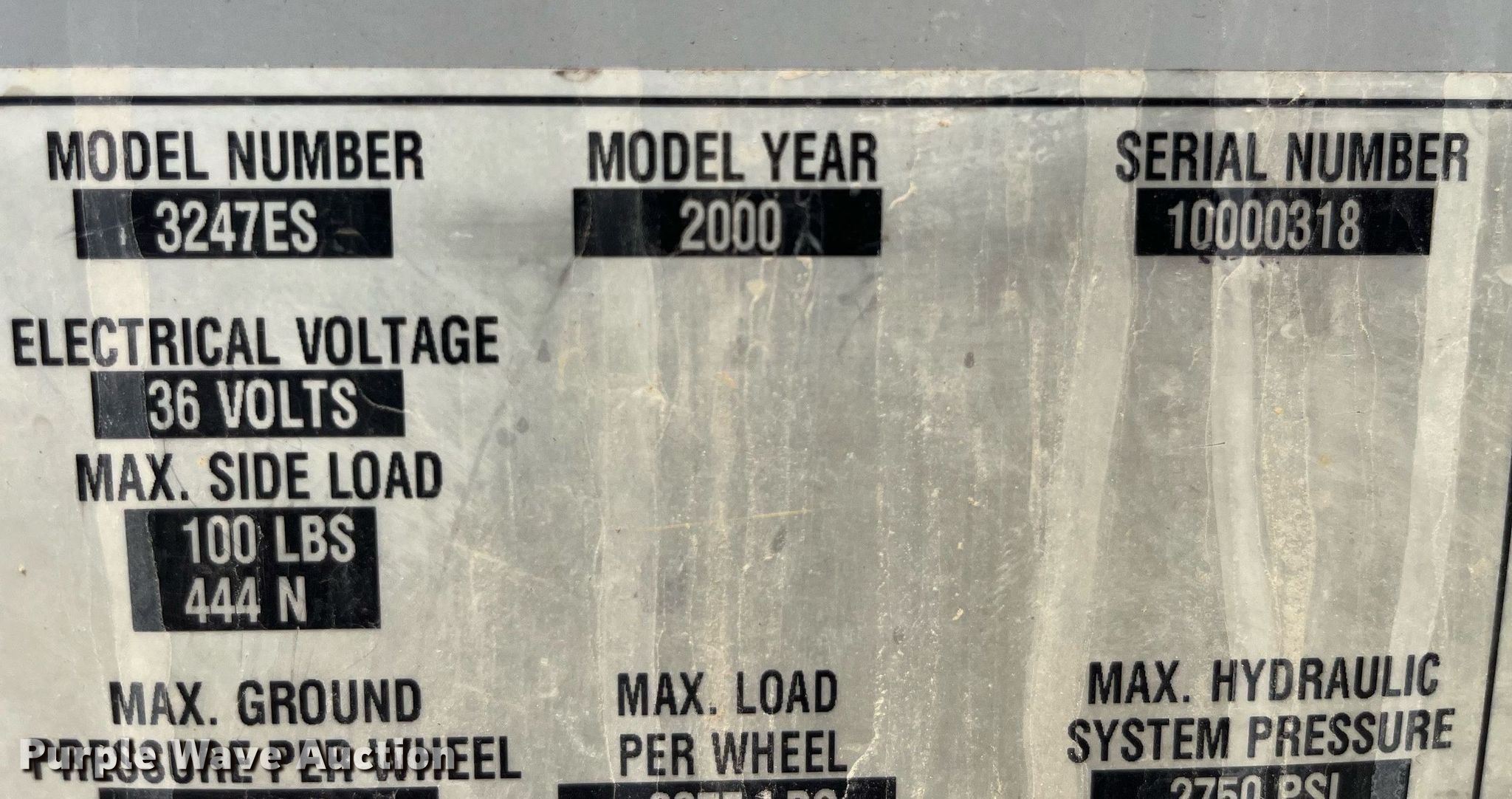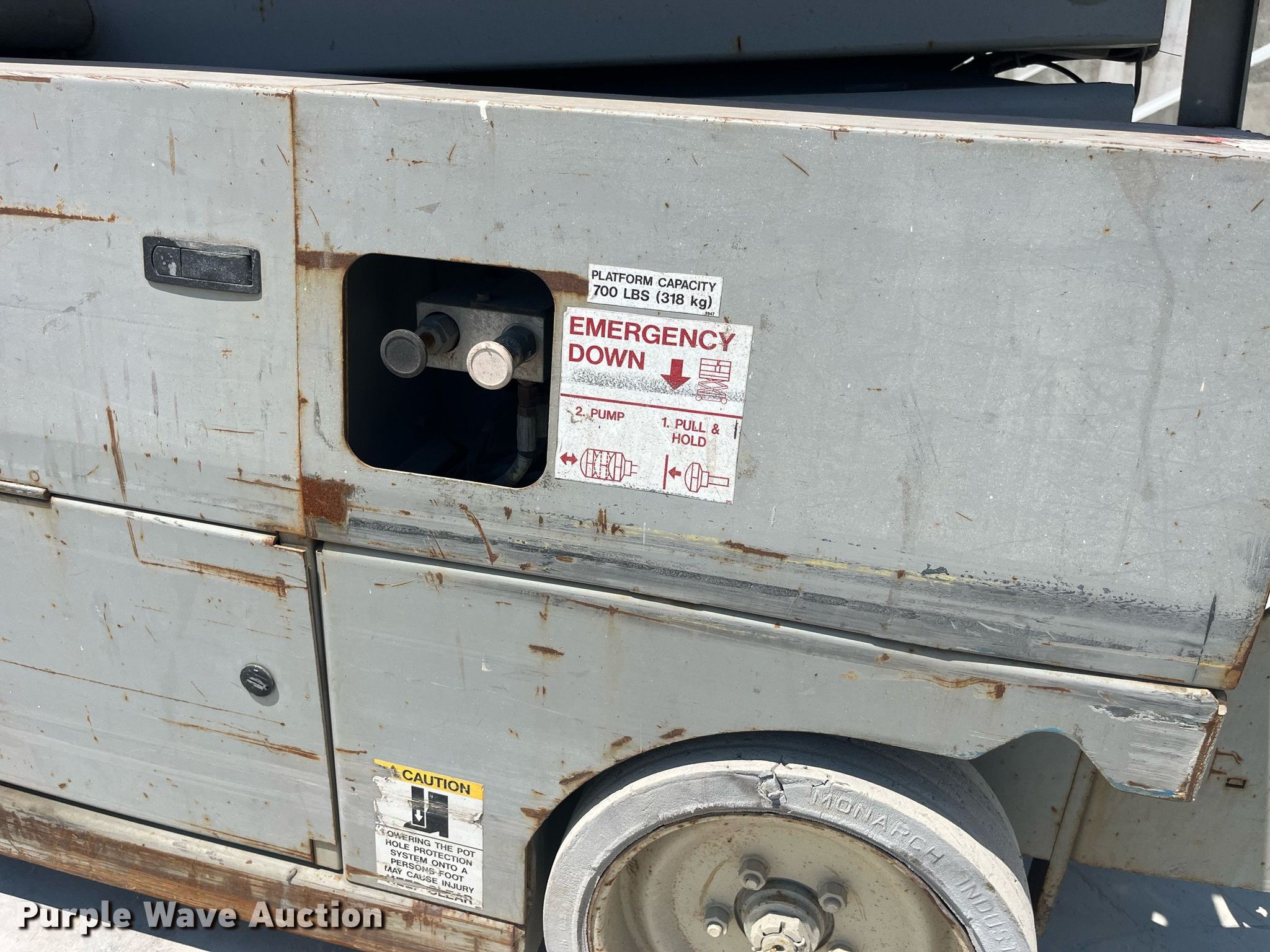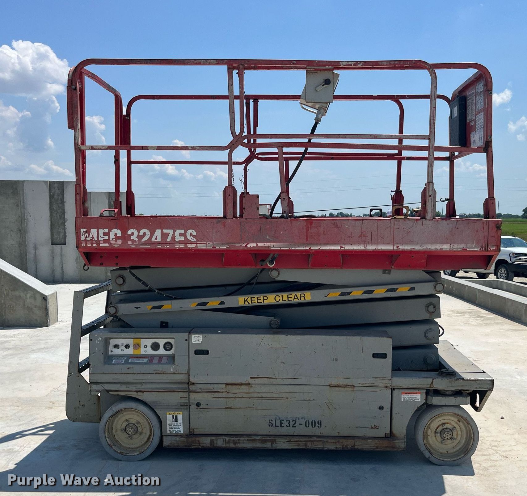 Purple Wave is selling a used Scissor or Vertical Lift in Missouri. This item is a 2000 Mec 3247ES scissor lift with the following: Hours: 1,147 on meter, Miles or hours may vary, unit still in use, Serial: 10000318