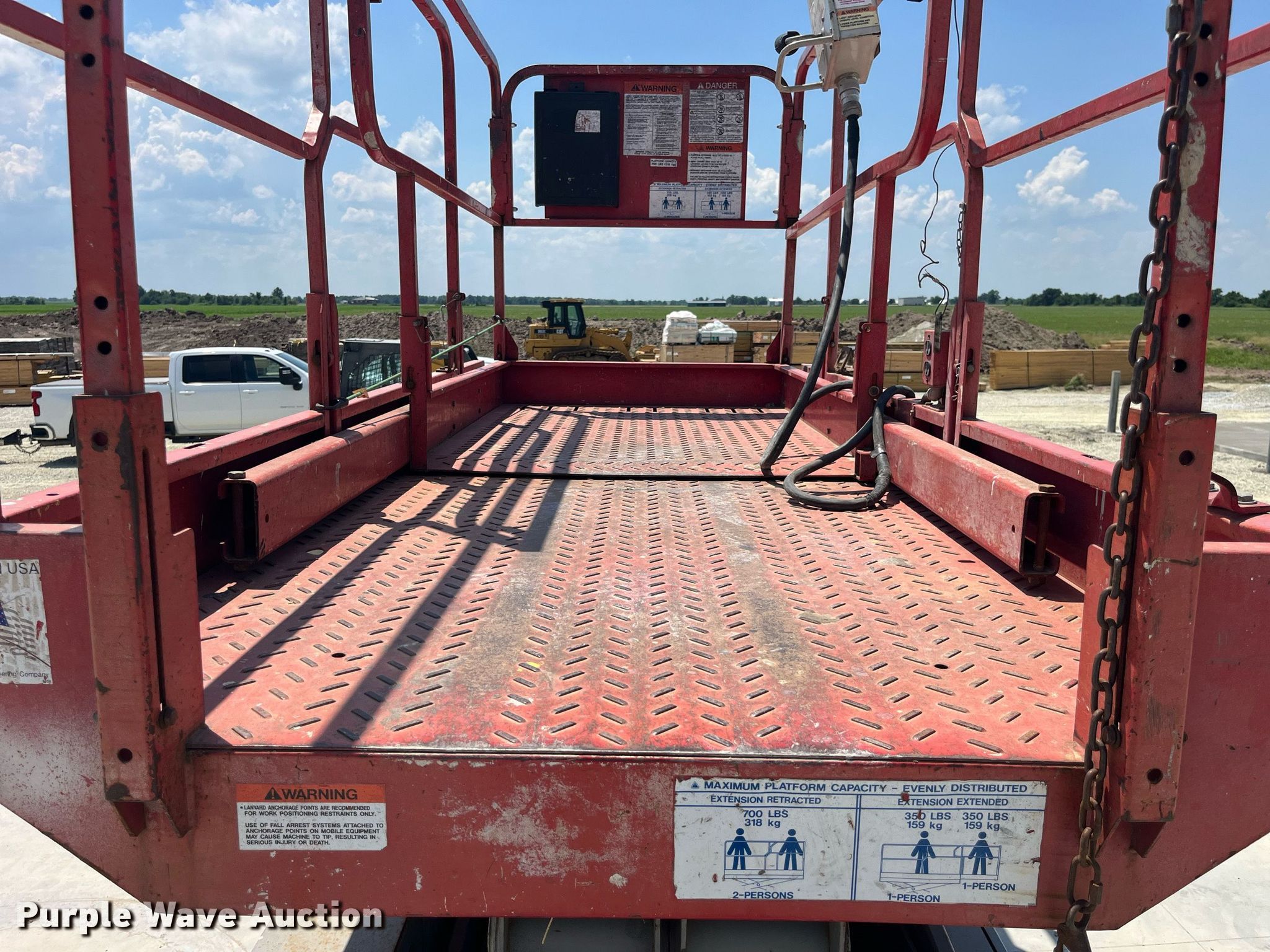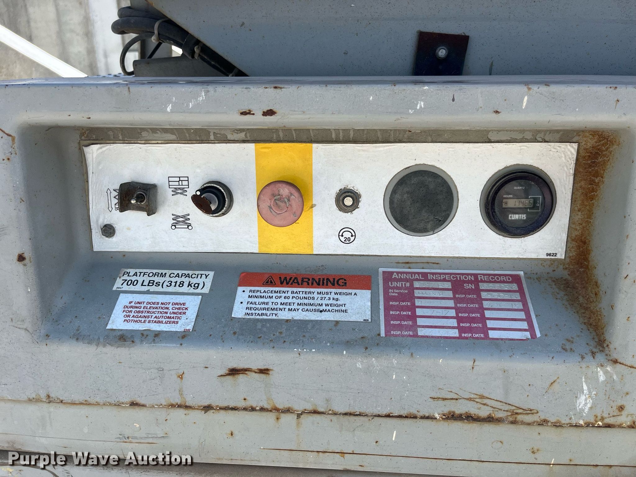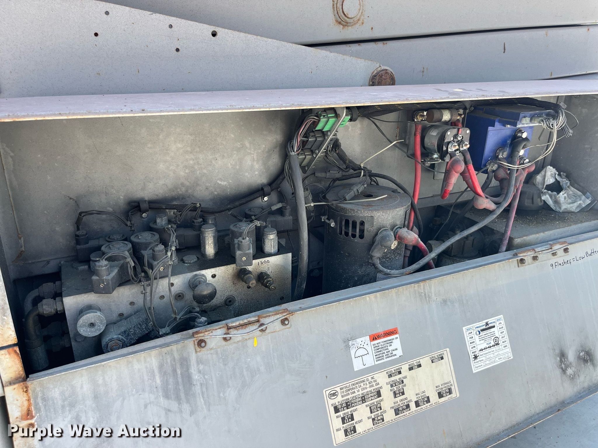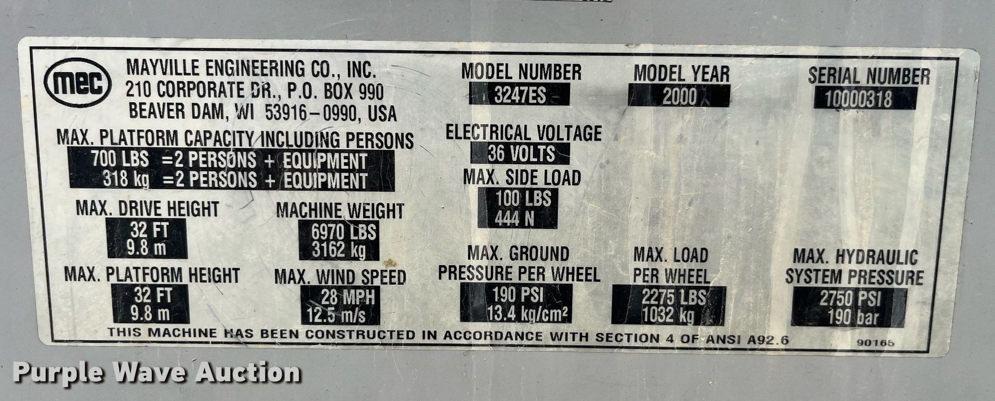 Purple Wave is selling a used Scissor or Vertical Lift in Missouri. This item is a 2000 Mec 3247ES scissor lift with the following: Hours: 1,147 on meter, Miles or hours may vary, unit still in use, Serial: 10000318