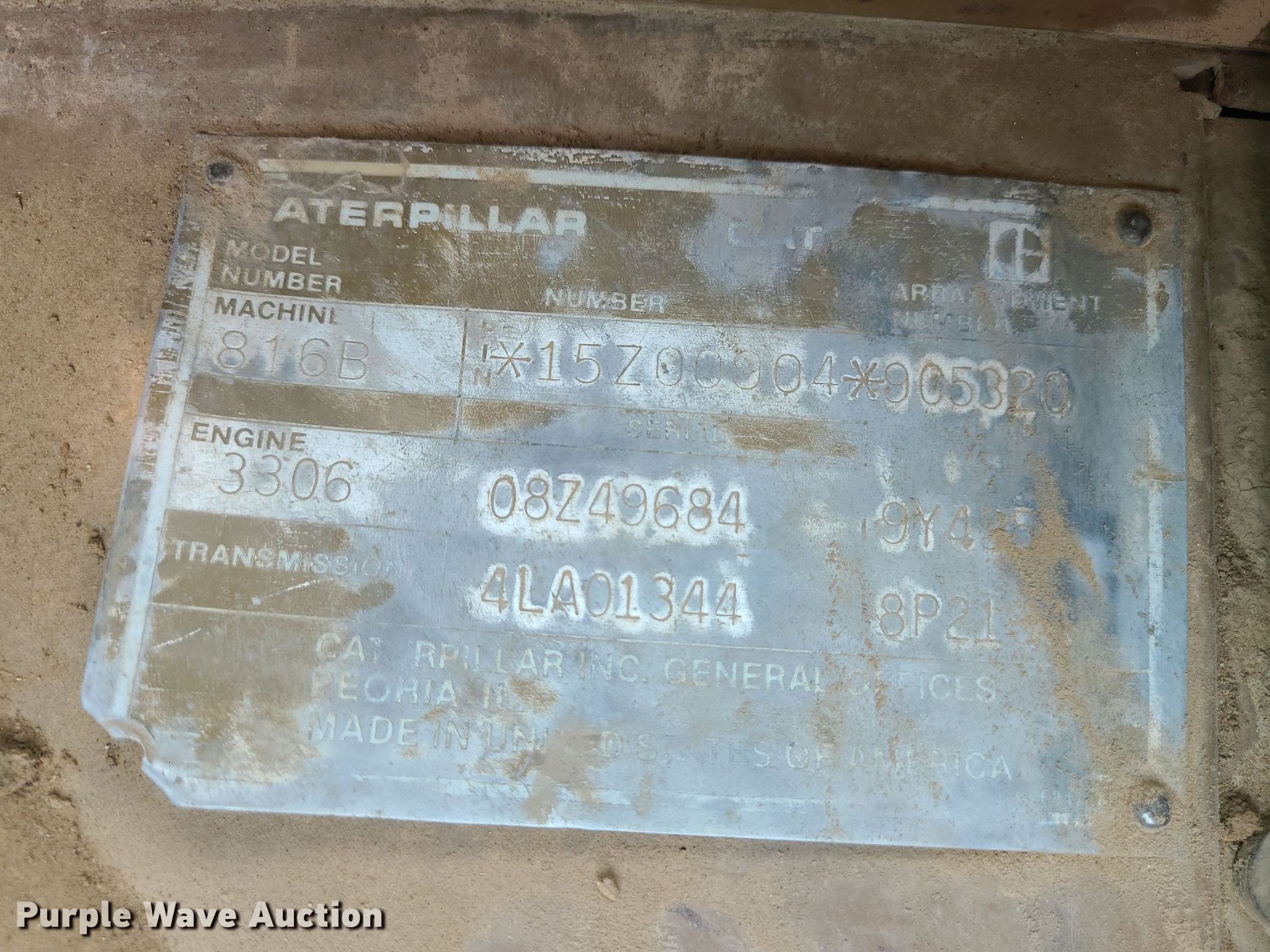 1989 Caterpillar 816B soil compactor. Hours: 14,606 on meter, Serial: 15Z00904. Engine Caterpillar 3306, Cylinders: 6, Fuel type: Diesel. Transmission Powershift, 4F - 4R. Operators station Enclosed cab, AC. Features Drum: Padfoot, Front drum Width: 40", Diameter: 56", Rear drum Width: 40", Diameter: 56", Drum scrapers: Front, Rear, Front blade width: 144". Notes Non-operational AC. Larry Brown Excavating Inc.. 2112 Kara Court. Liberty, MO 64068