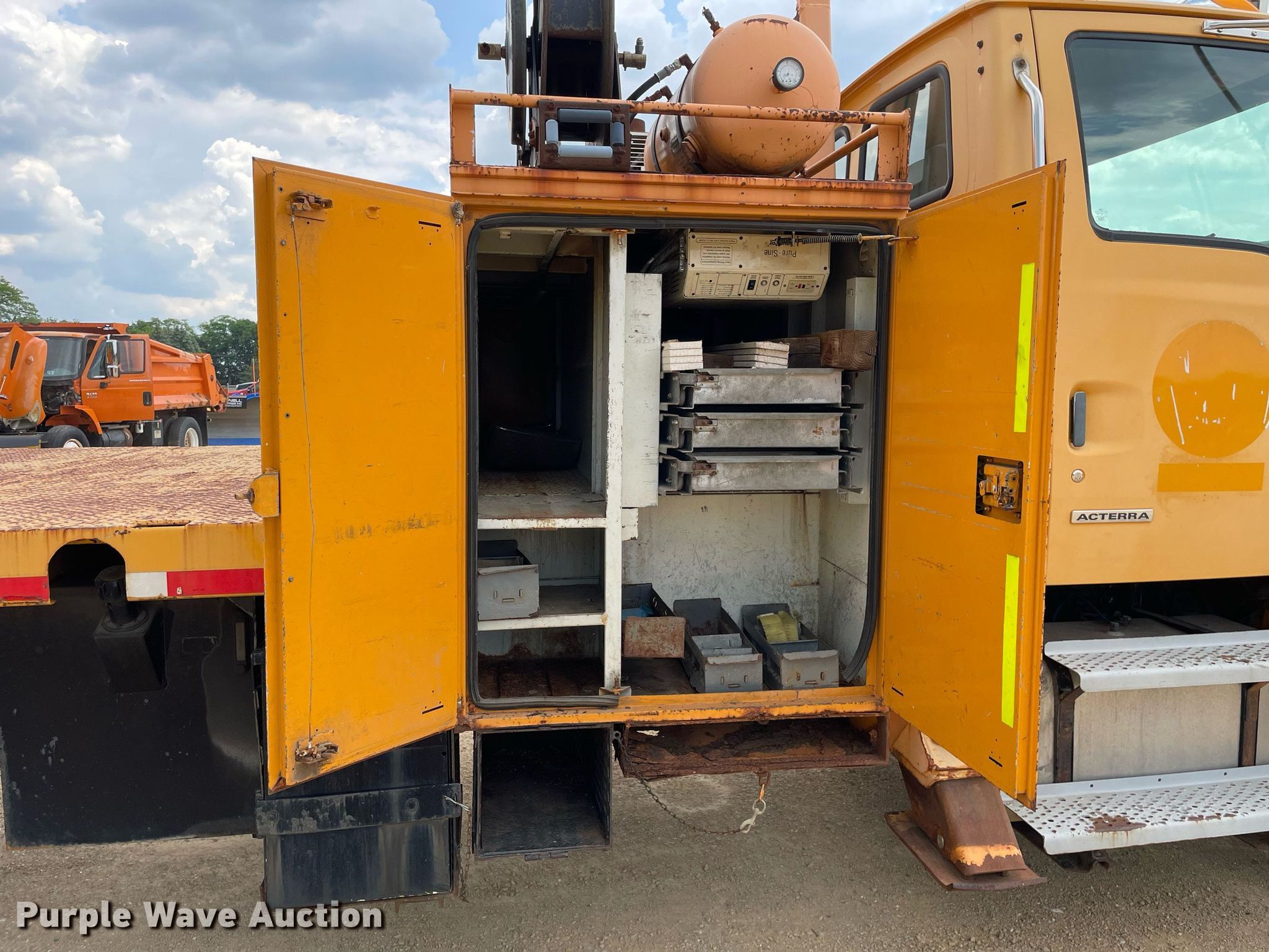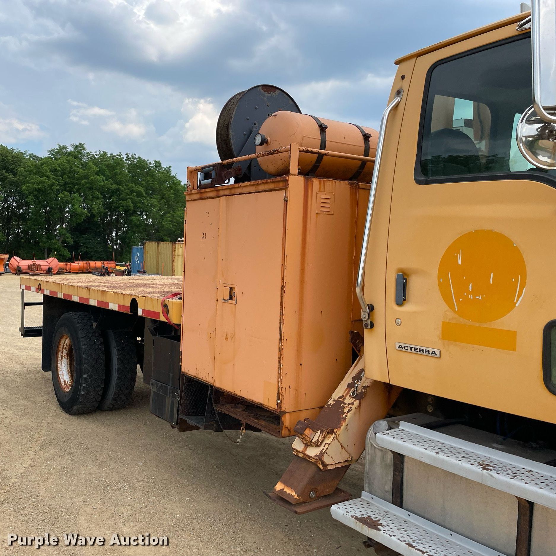 2004 Sterling Acterra flatbed truck. Miles: 91,171 on odometer, Hours: 7,449 on meter, VIN: 2FZACHAK94AM87139. Engine Caterpillar 3126, Displacement: 7.2L , Cylinders: 6, Fuel type: Diesel. Transmission Automatic. Chassis Axles: Single, Suspension: Spring, Brakes: Air, PTO, GVWR: 37,000 lbs. Interior AC, Heat, Cruise control, Auxiliary controls, Brake controller. Features Flatbed 13' 6" L x 96" W, Vanair air compressor, Hose reel. Tires Front: 12R22.5 , Rear: 11R22.5. Notes Dead battery. Illinois title. Seller is an Illinois licensed motor vehicle dealer. The buyer may be required to pay sales tax and/or registration fees to the dealer prior to taking possession. Title will be assigned and distributed by the dealer. Please contact the seller for distribution questions. 1385 Franklin Grove Road. Dixon, IL 61021