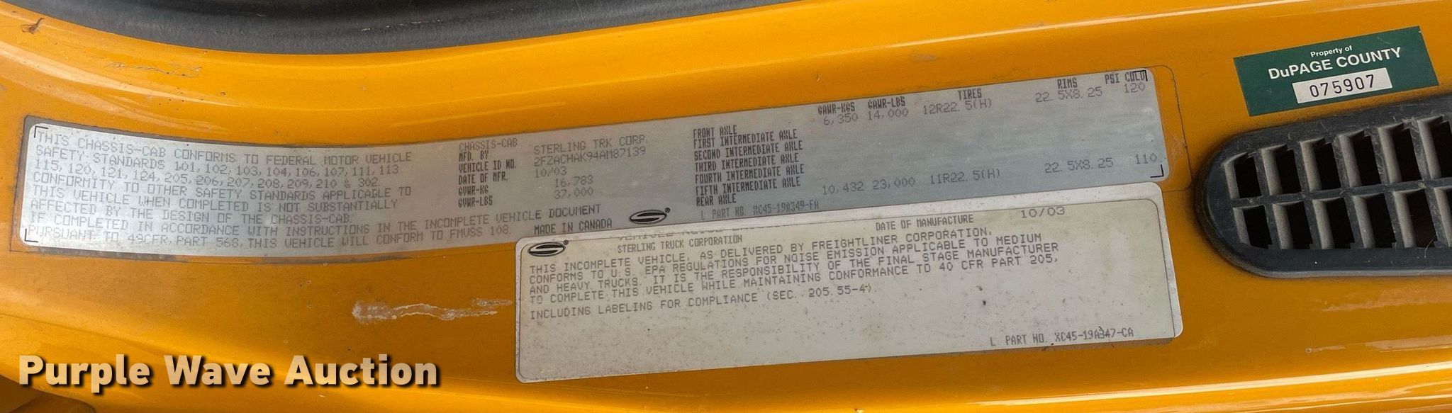 Purple Wave is selling a used Flat Bed Truck in Illinois. This item is a 2004 Sterling Acterra flatbed truck with the following: Miles: 91,171 on odometer, Hours: 7,449 on meter, VIN: 2FZACHAK94AM87139