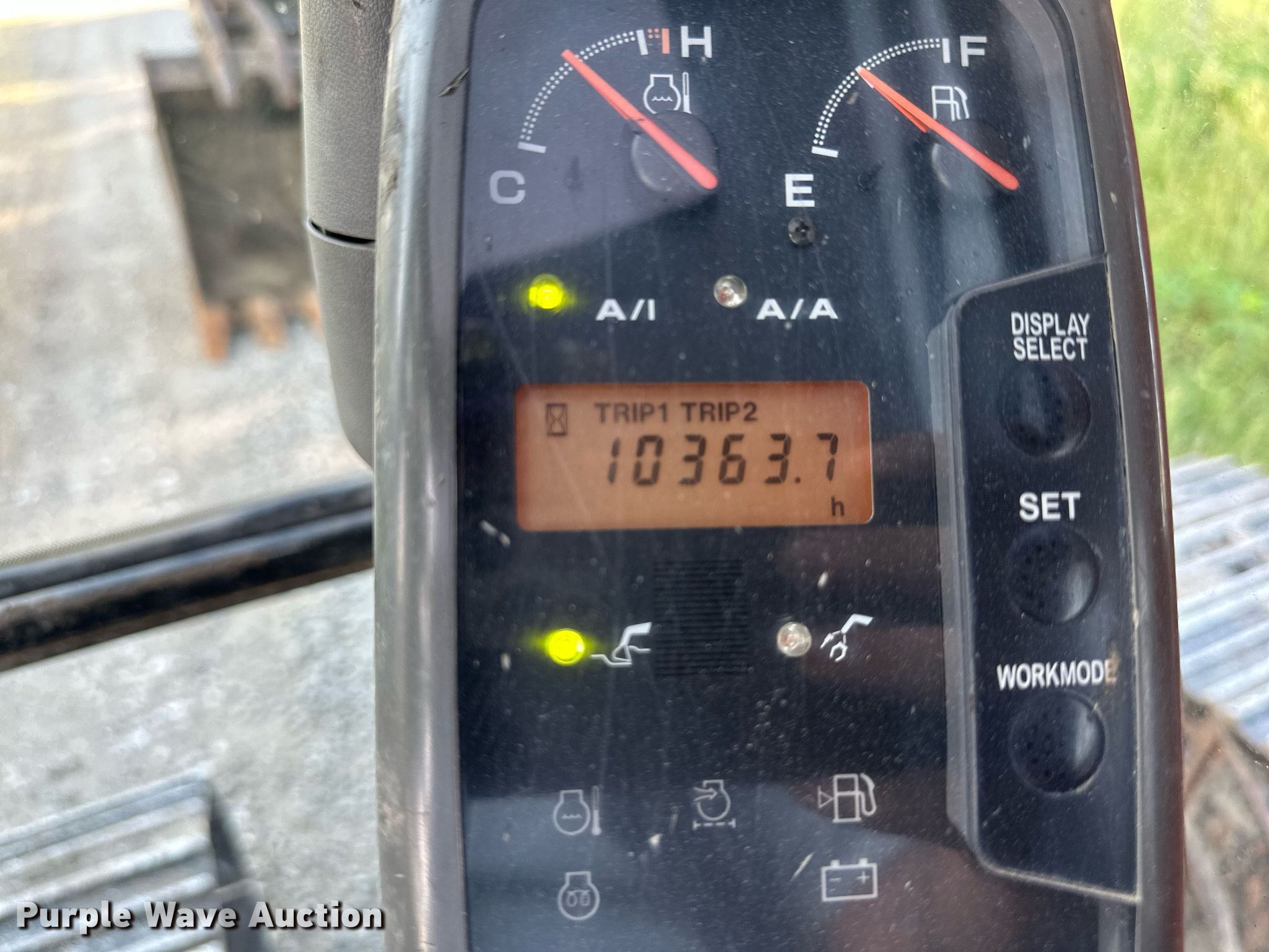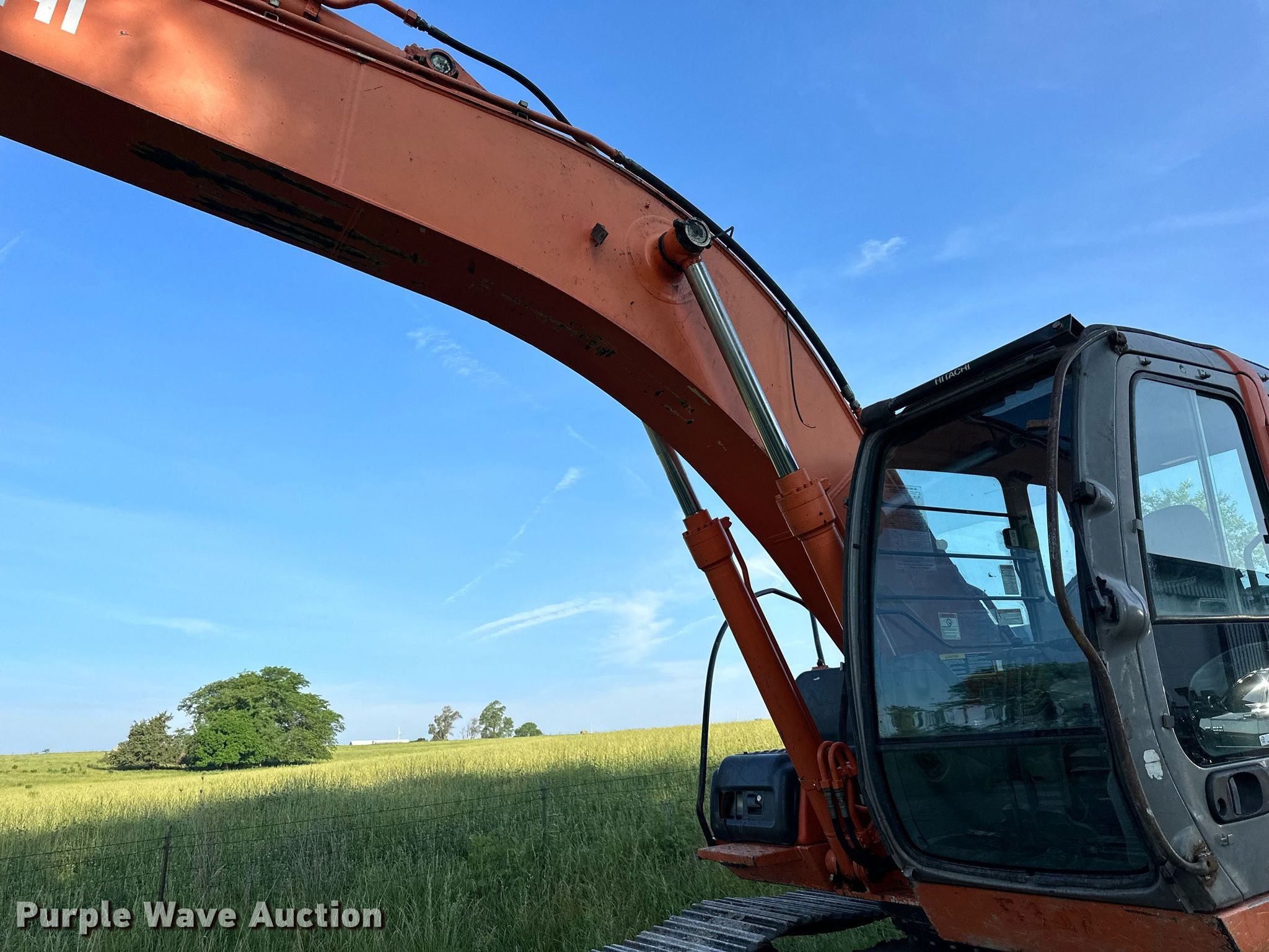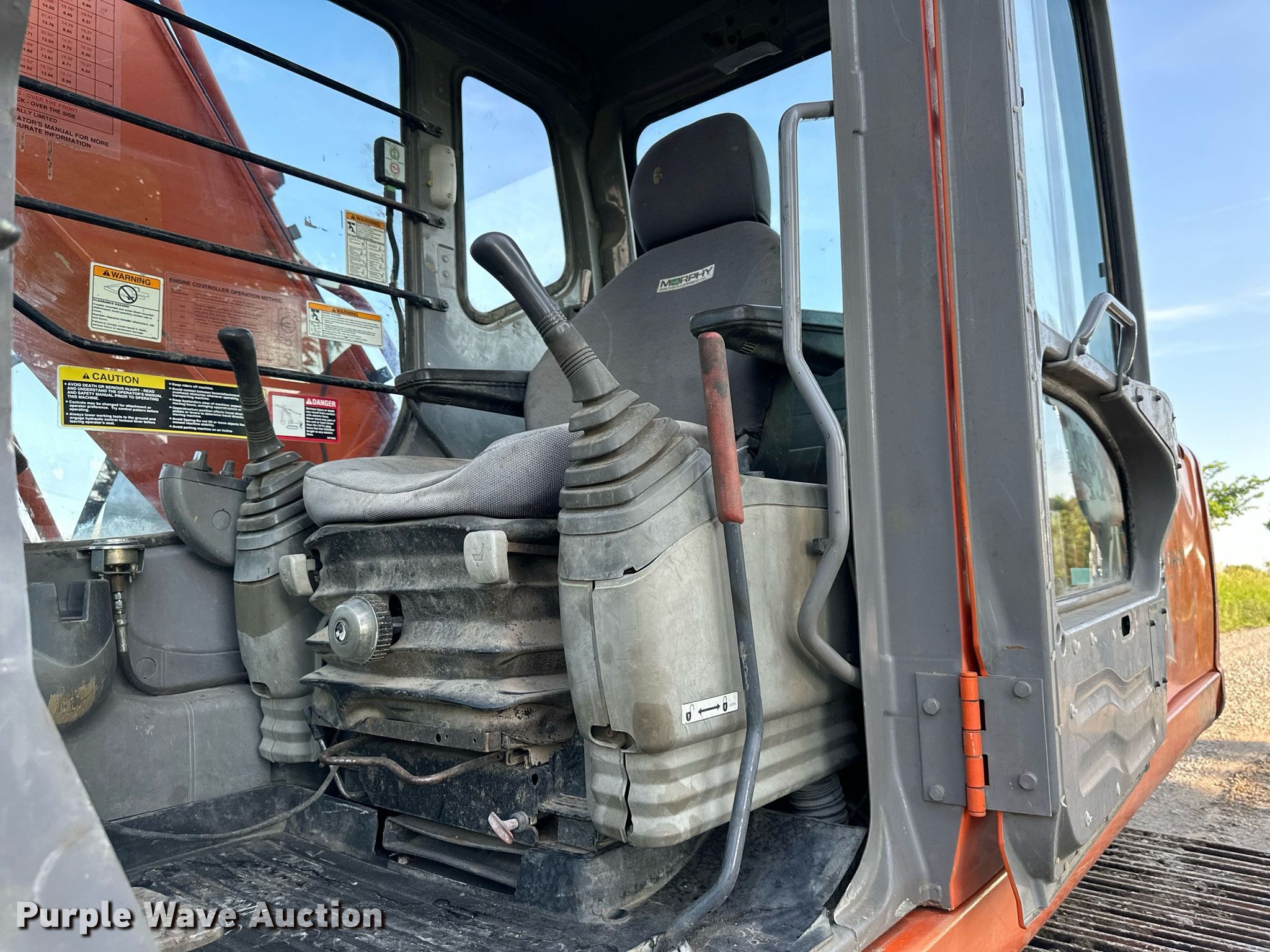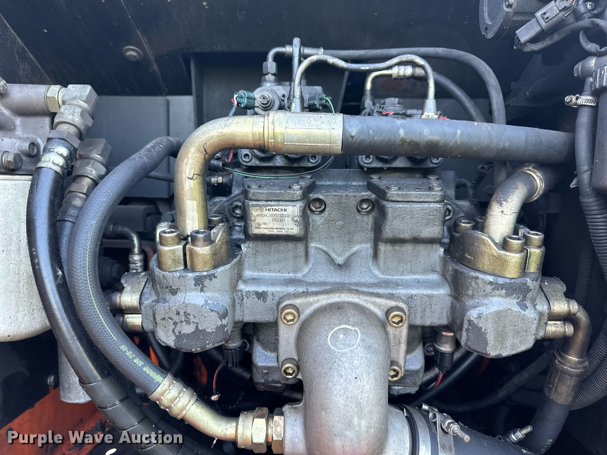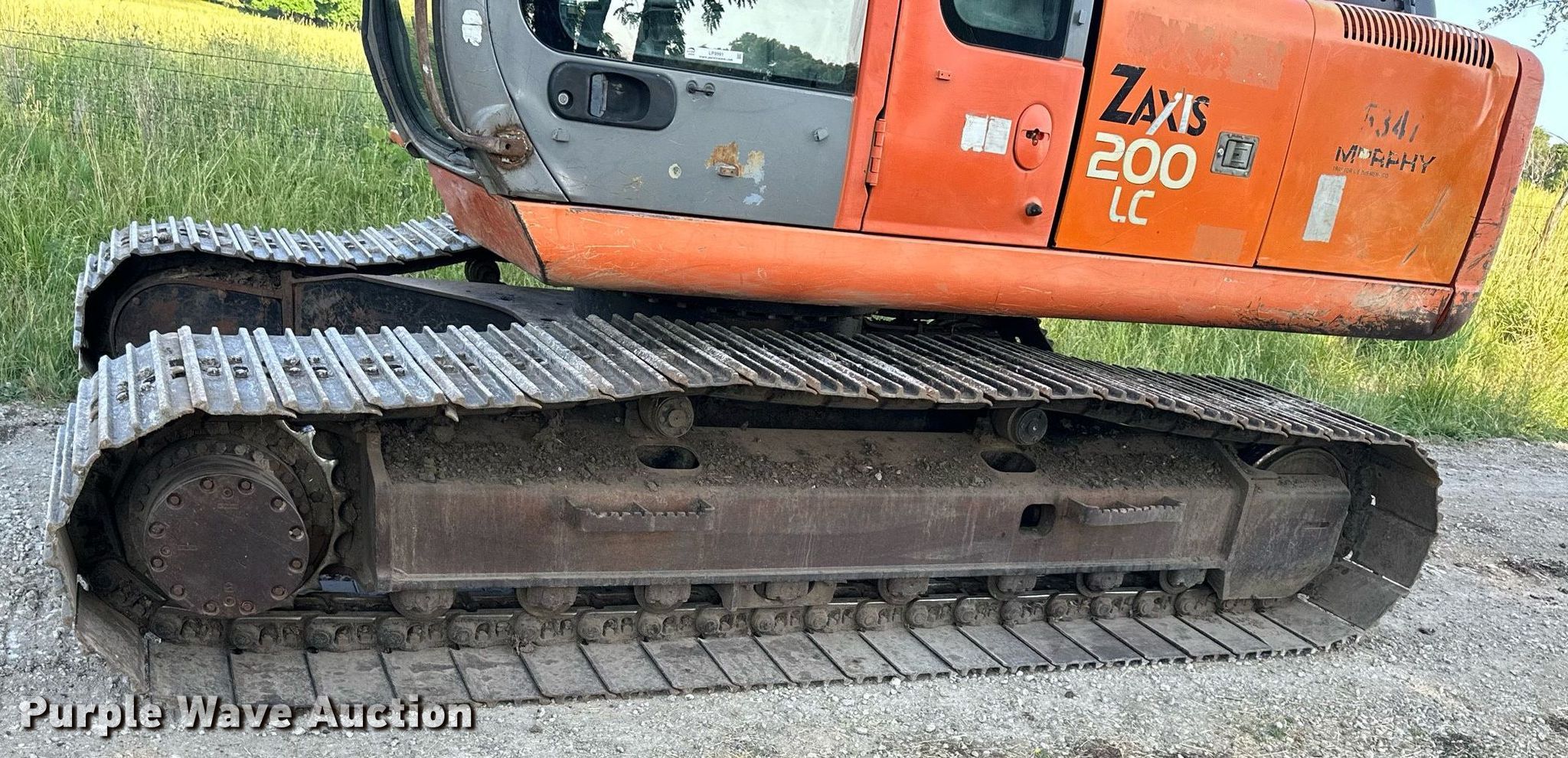 2006 Hitachi ZX200LC excavator. Hours: 10,364 on meter, Miles or hours may vary, unit still in use, Serial: ARH310986. Engine Isuzu AA-6BG1T, Displacement: 6.5L, Cylinders: 6, Fuel type: Diesel. Transmission Hydrostatic, Two speed travel. Operators station Enclosed cab, AC, Heat. Features Auxiliary hydraulics Standard, One-way, Counter weights, Removable, Boom Standard, Stick Stick length: 12', Thumb: Manual, Bucket Width: 40", Cutting edge: Weld-on, Teeth: 5. Tracks Width: 31.5", Steel, Grouser pads: Triple. Wolfe Farms. Helena, MO 64459