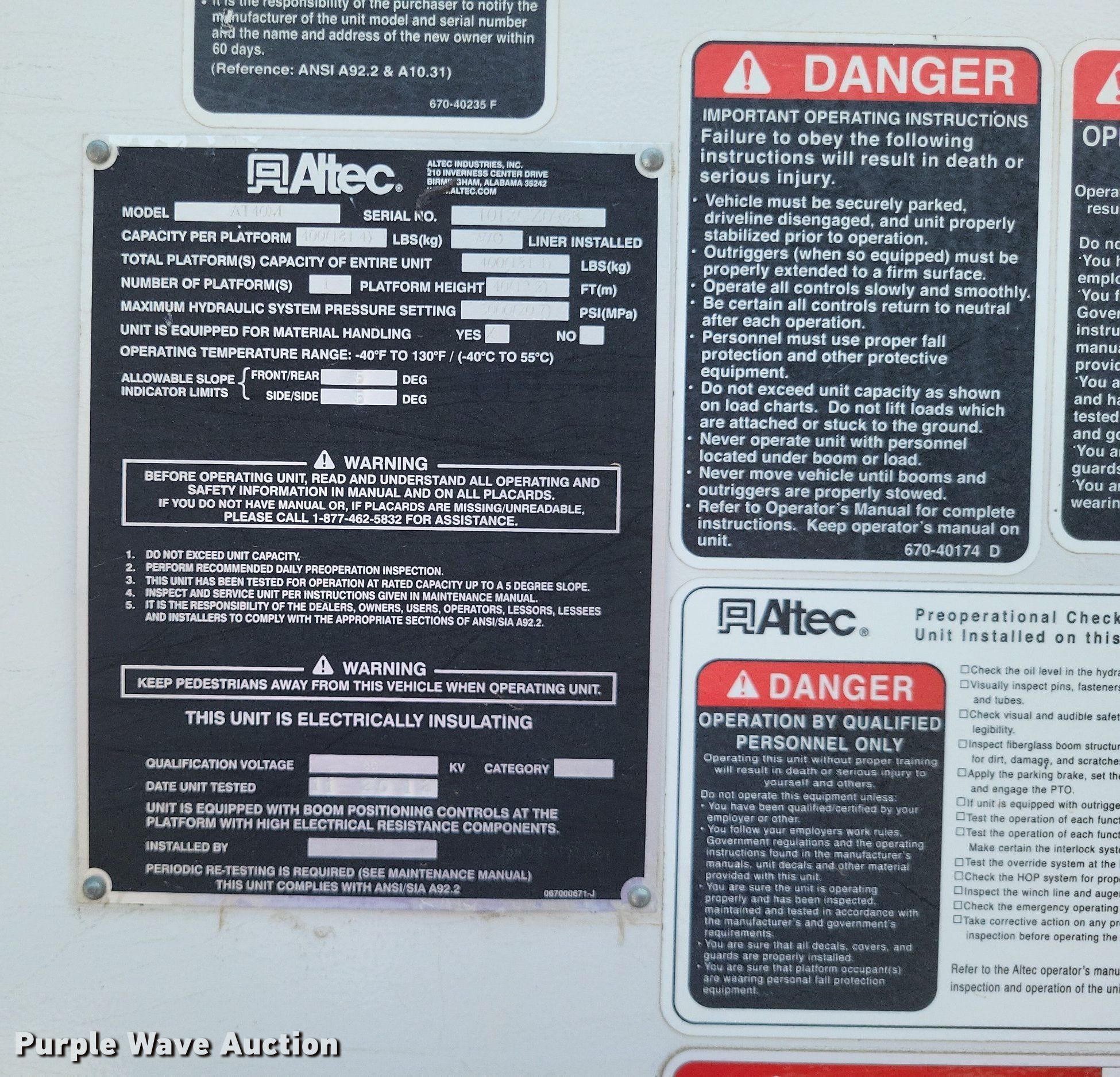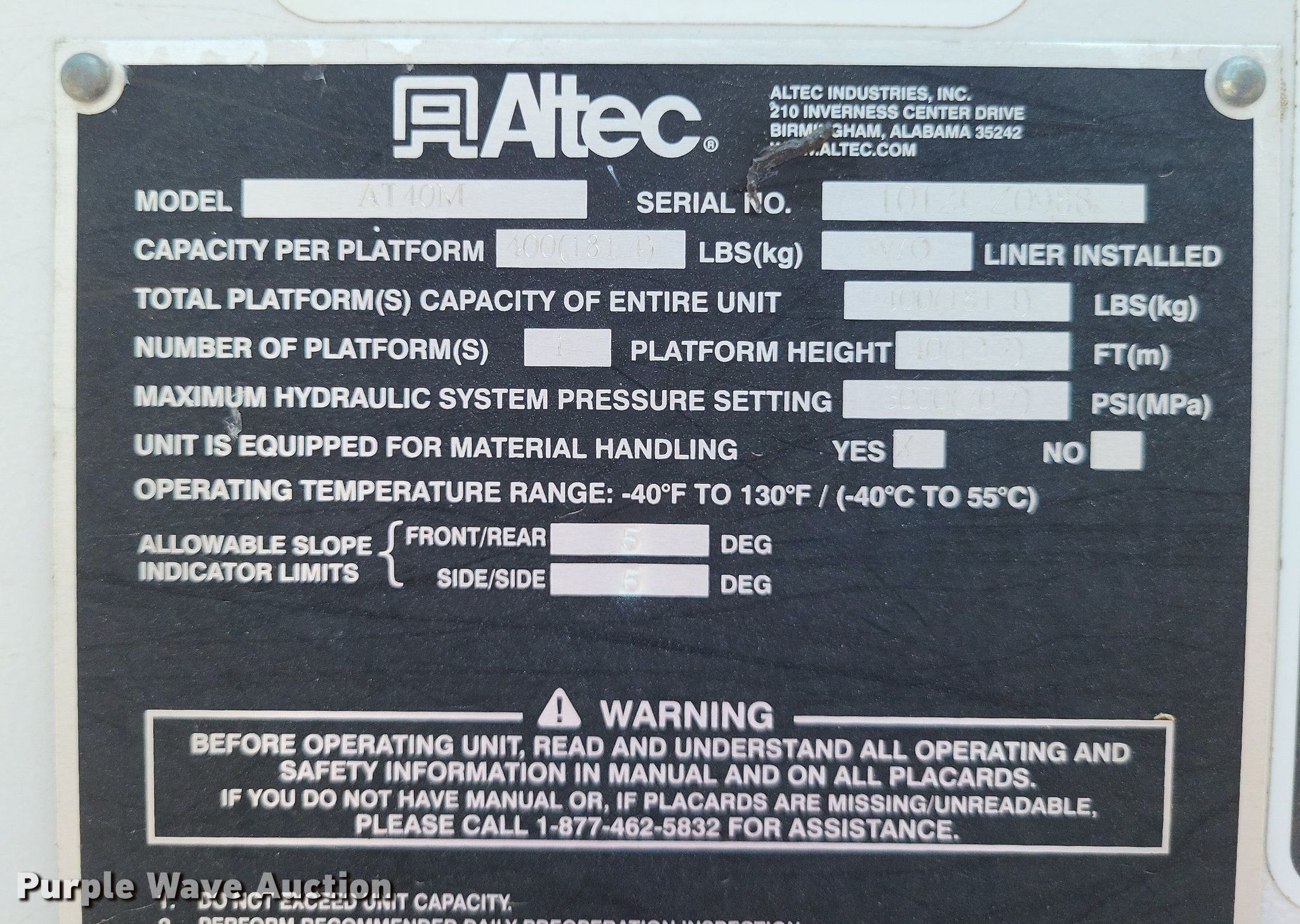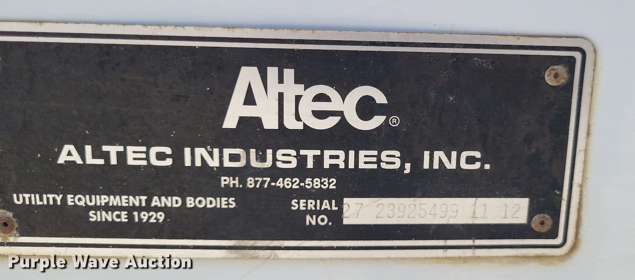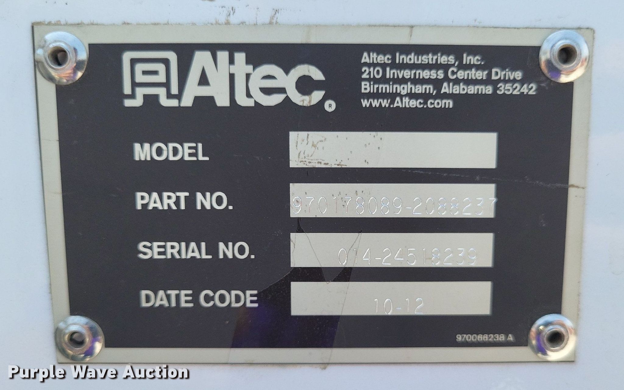 2012 Ford F550 Super Duty XL bucket truck. Miles: 146,170 on odometer, VIN: 1FDUF5HY5CEC49663, Unit #: 41. Engine Displacement: 6.8L, Cylinders: 10, Fuel type: Gas. Transmission Automatic. Chassis Axles: Single, Suspension: Spring, Brakes: Hydraulic, PTO, GVWR: 19,500 lbs. Interior AC, Heated mirrors, Power windows, Power locks, Auxiliary controls, Brake controller. Features Bed Altec , Serial: 014-24518239/27-23925499-11-12, 161" L x 94" W, Boom Altec AT40M, Serial: 1012CZ0988, Maximum lift capacity: 400 lbs, Maximum lift height: 40', Boom type: Articulating, Insulated, Telescopic, Man basket, Boom controls Ground, Platform/ basket, Material handler, Certification valid through: 02/2024. Tires Size: 8R19.5. Missouri title. Title distribution may be delayed up to 14 days from verification of funds. Ozark Border Electric Cooperative. Poplar Bluff, MO 63902