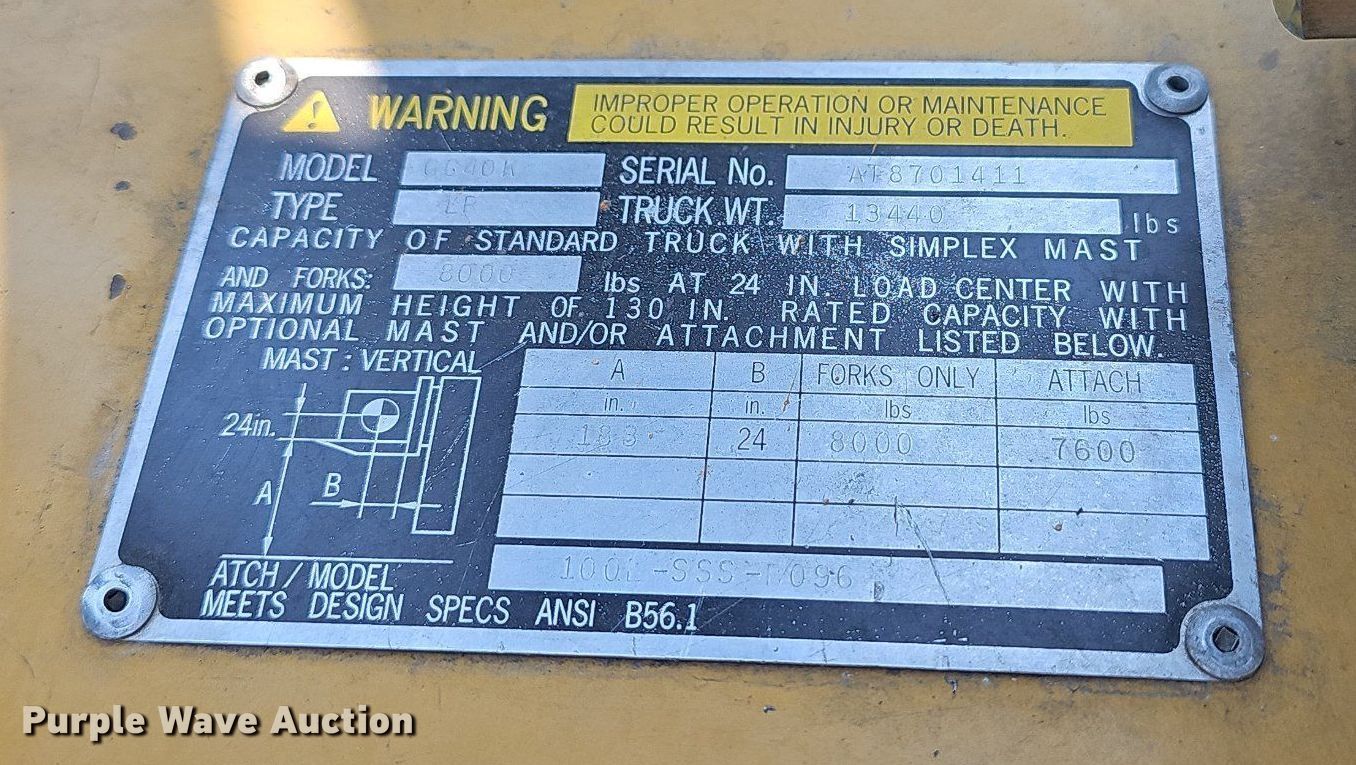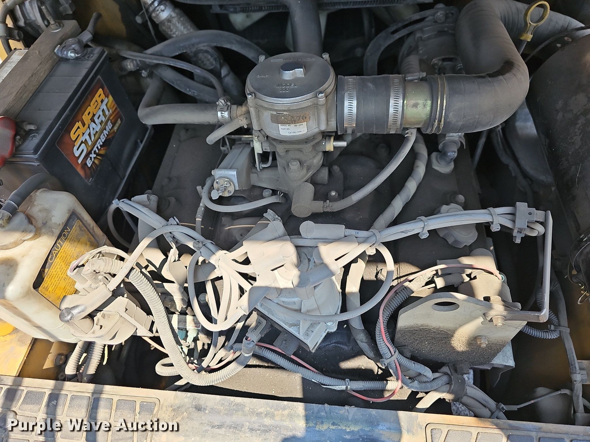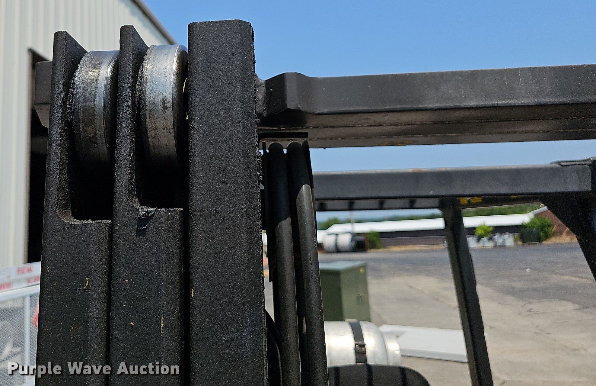 Caterpillar GC40K forklift. Hours: 3,733 on meter, Serial: AT8701411. Engine Cylinders: 6, Fuel type: LPG LP bottle: Included. Transmission Powershift. Operators station Canopy. Features Maximum lift capacity: 8,000 lbs, Maximum lift height: 183", Mast stages: 3, Side shift, Fork length: 60". Tires Front: 22xx9x16, Rear: 18x7x12 1/8, Solid. White River Valley Electric Cooperative. 2449 State Highway 76. Branson, MO 65616