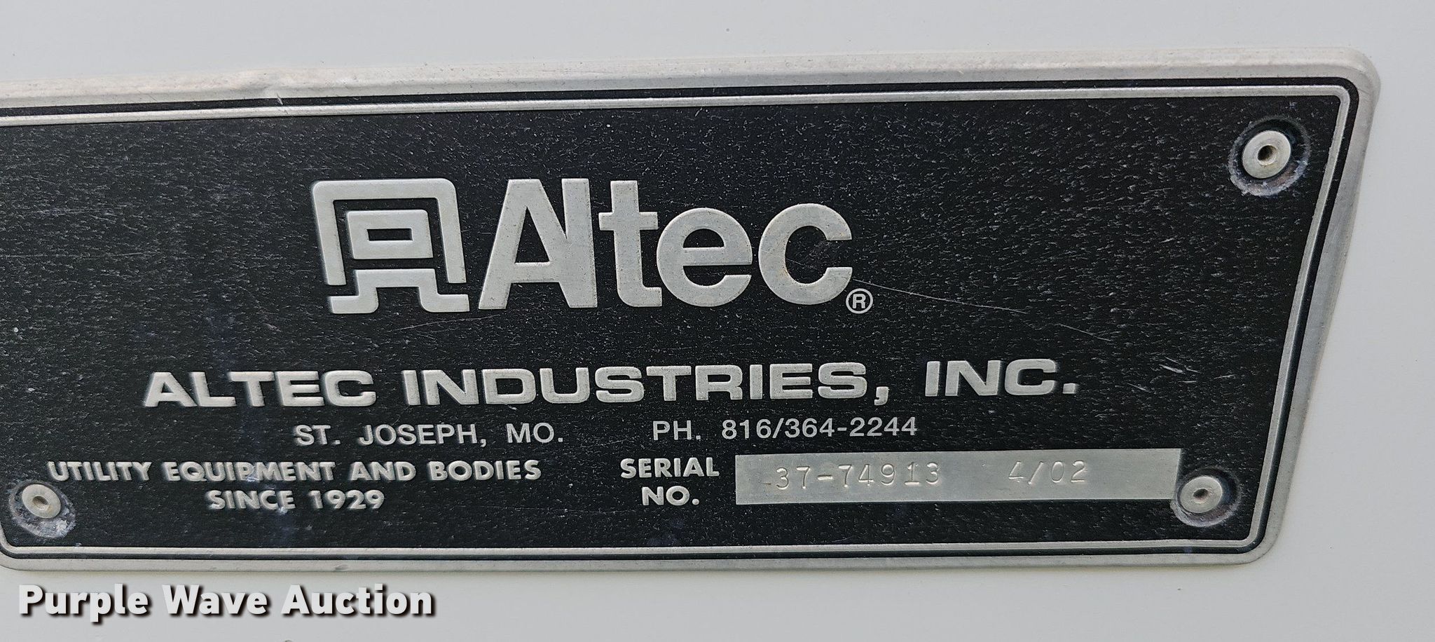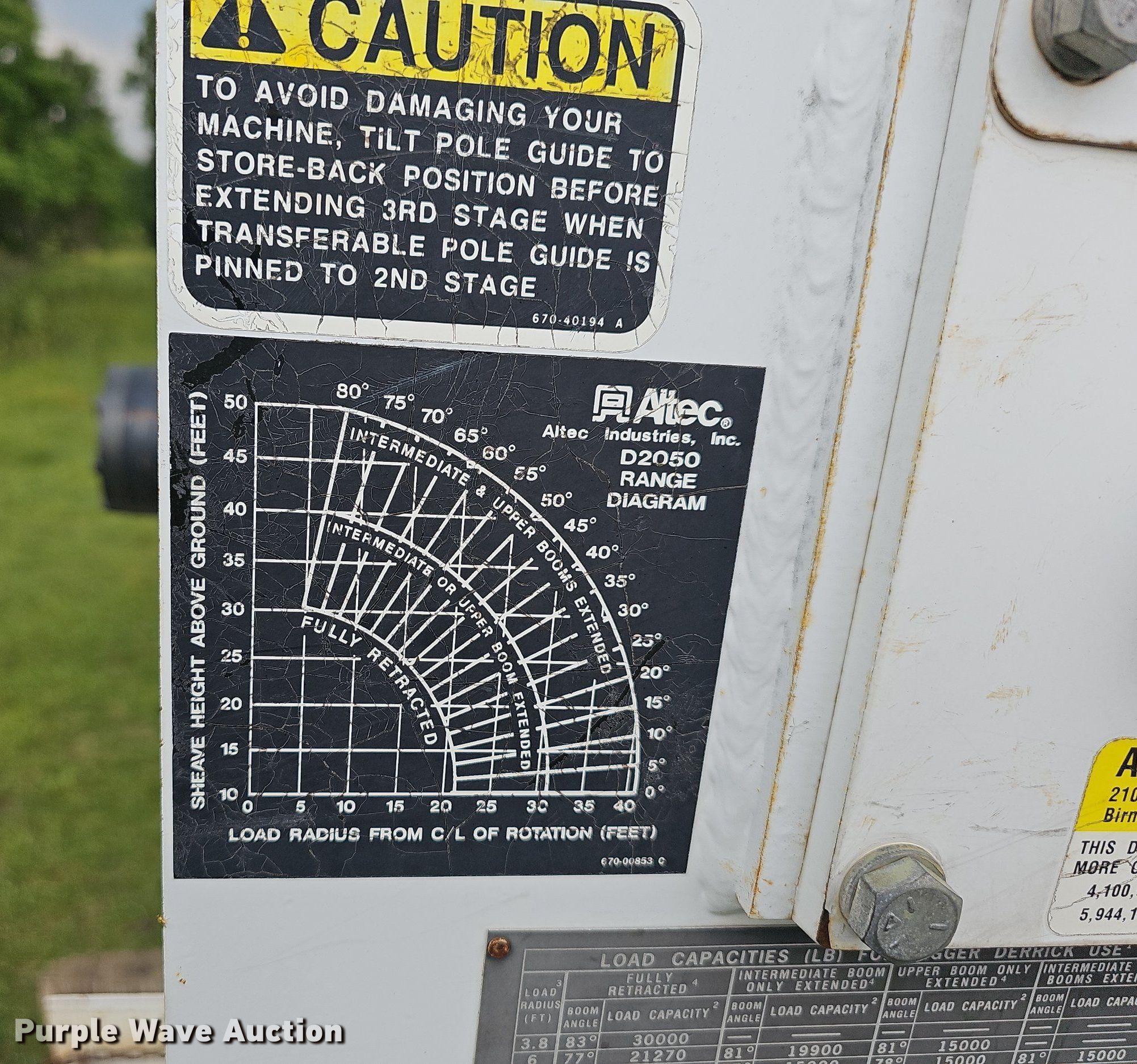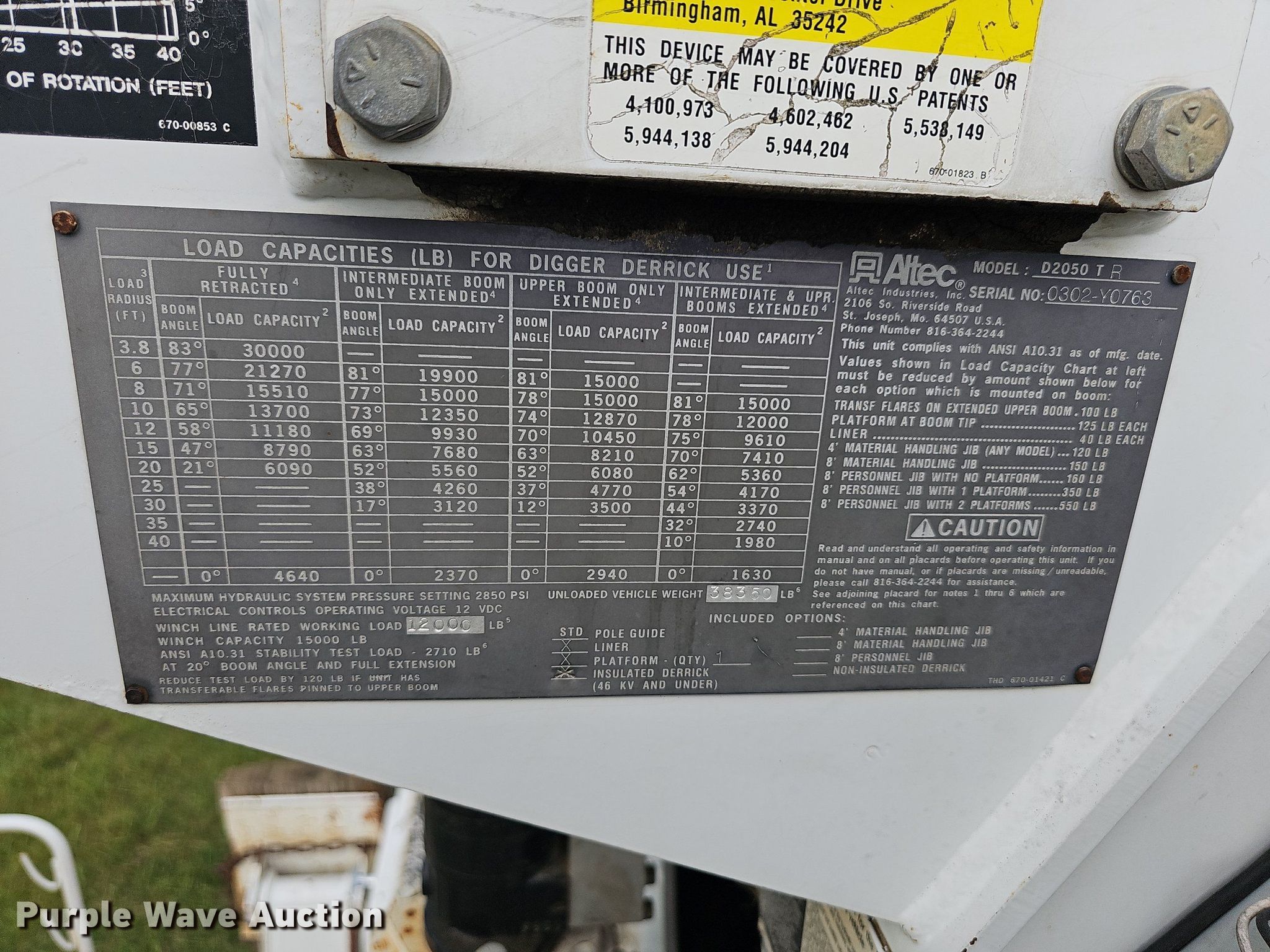2002 Freightliner FL80 Crew Cab digger derrick truck. Miles: 160,586 on odometer, VIN: 1FVHBXAK82HK27872. Engine Caterpillar 3126, Displacement: 7.2L, Cylinders: 6, Fuel type: Diesel. Transmission Allison, Automatic. Chassis Axles: Tandem, Differential lock: Full, Suspension: Spring over walking beam, Brakes: Air, PTO. Interior AC, Heat, Heated mirrors, Cruise control, Auxiliary controls. Features Bed Astroia, Serial: 190-01-2, 17' L x 93" W, Boom Altec D02050, Serial: 0302-Y0763, Boom length: 40', Maximum lift capacity: 30,000 lbs, Maximum lift height: 40', Boom type: Telescopic, Man basket, Boom controls Ground, Platform/ basket, Remote control, Material handler, Pole guide, Auger Diameter: 18".. Tires Front: 315/80R22.5, Rear: 11R22.5. Notes Man basket liner included. Missouri title. Title distribution may be delayed up to 14 days from verification of funds. DIY Broadband LLC. 14567 West Pine Hill Lane. Billings, MO 65610