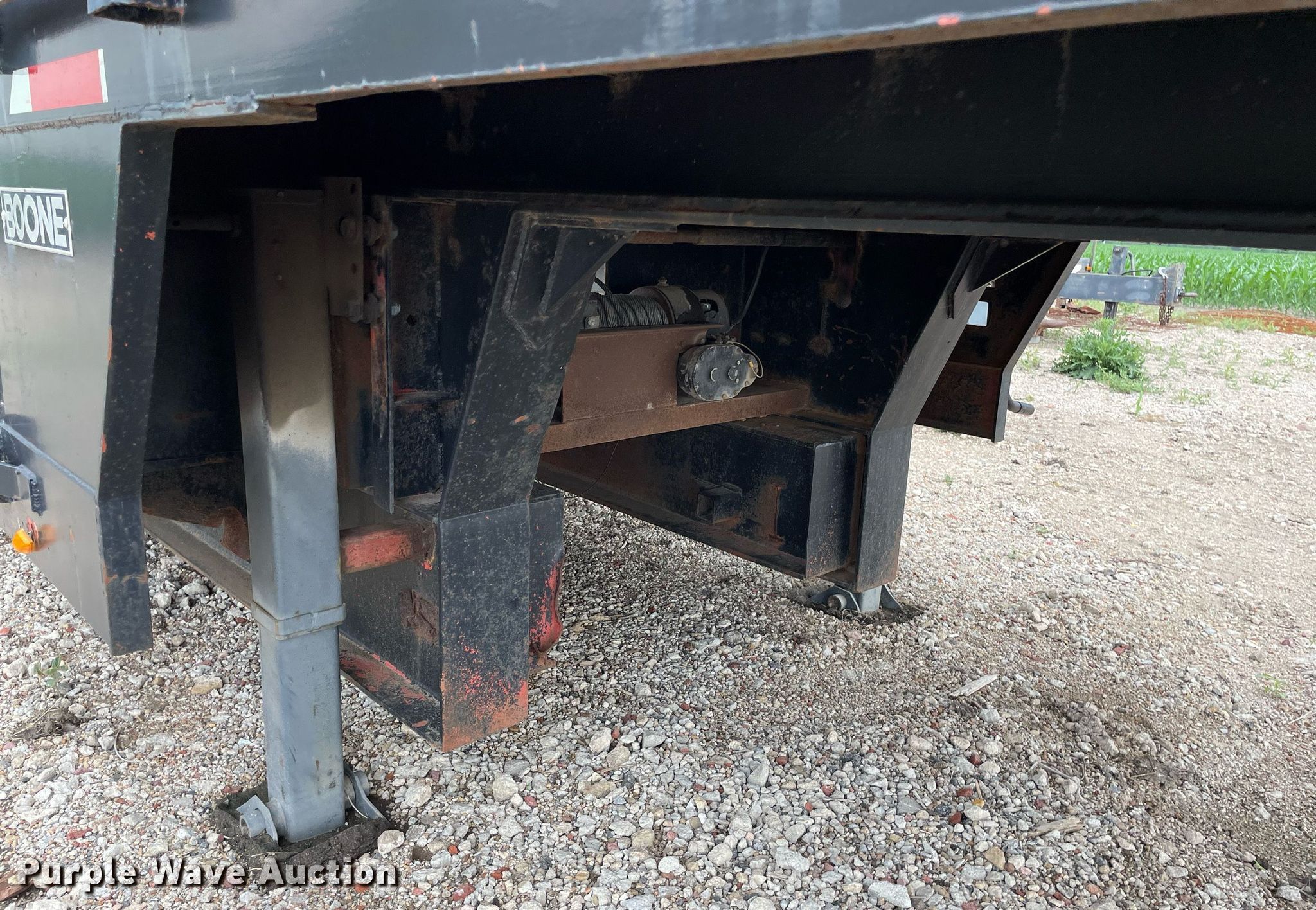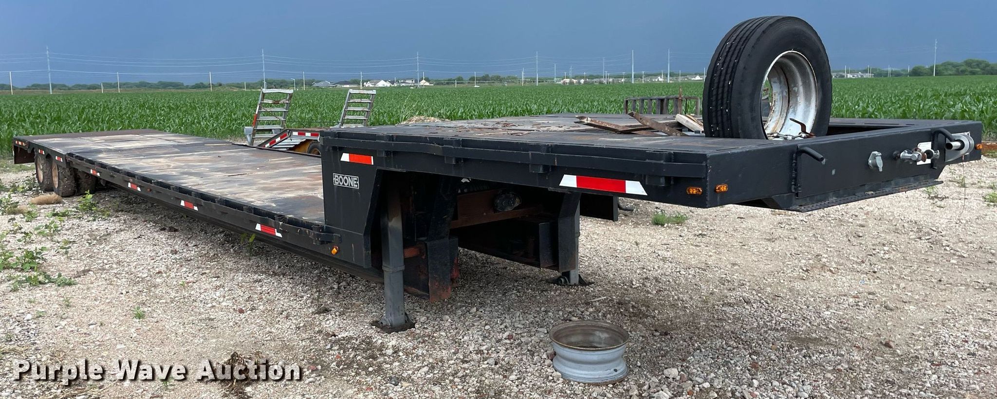1986 Boone BD8AE drop deck trailer. VIN: 1B92D4822GP011018, Unit #: 131. Dimensions Overall: 52' L x 96" W, Deck: 36' L x 91" W, Top deck length: 10', Deck height: 32", Hydratail length: Approx. 16' 2". Features Deck type: Steel, Extendable deck, Winch Ramsey. Chassis Landing gear: Dual, Suspension: Air, Brakes: Air, Axles: Tandem, GVWR: 65,000 lbs. Tires Steel wheels, Size: 235/75R17.5. Kansas title. Title distribution may be delayed up to 14 days from verification of funds. Voegeli Concrete. Maize, KS 67101