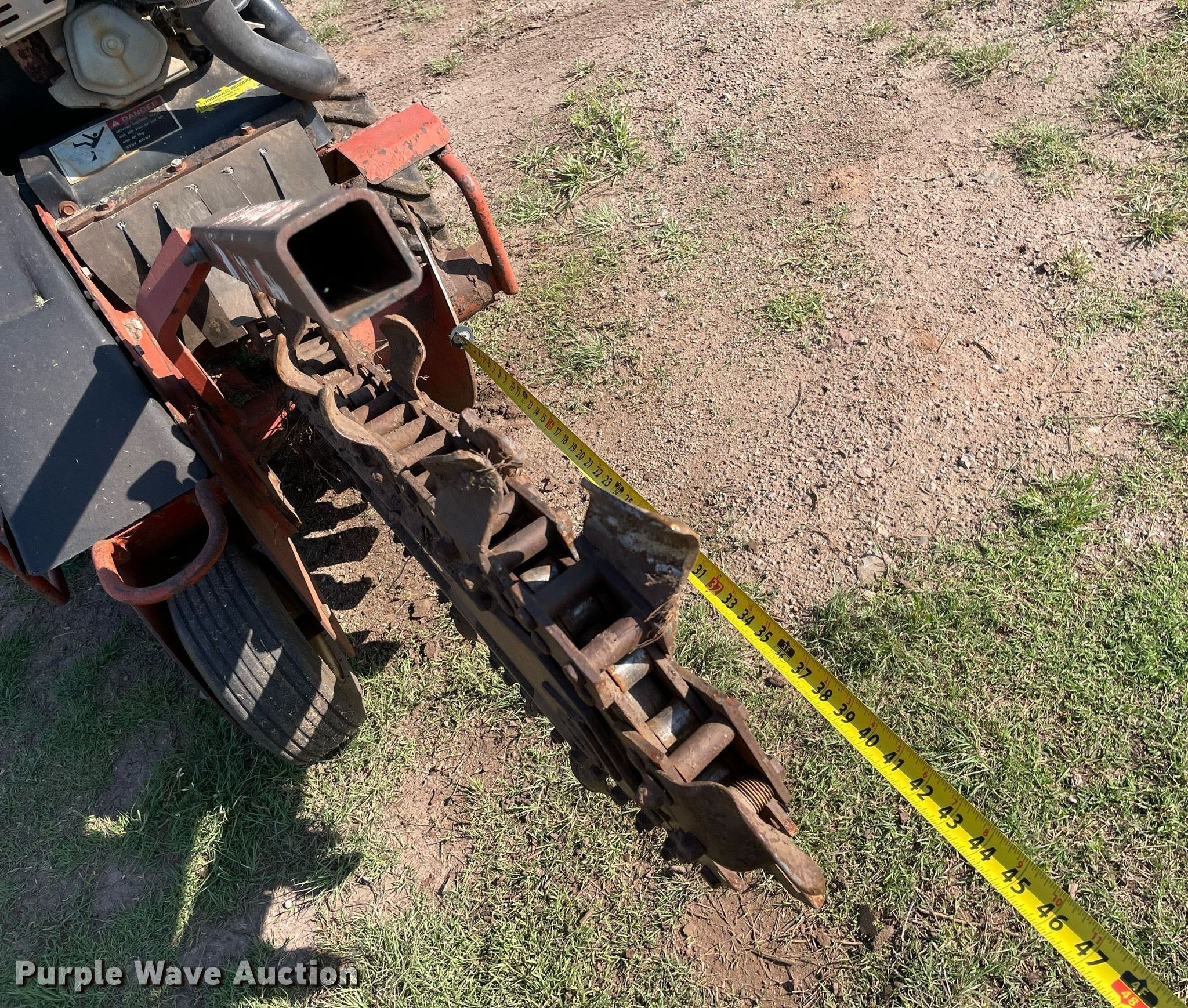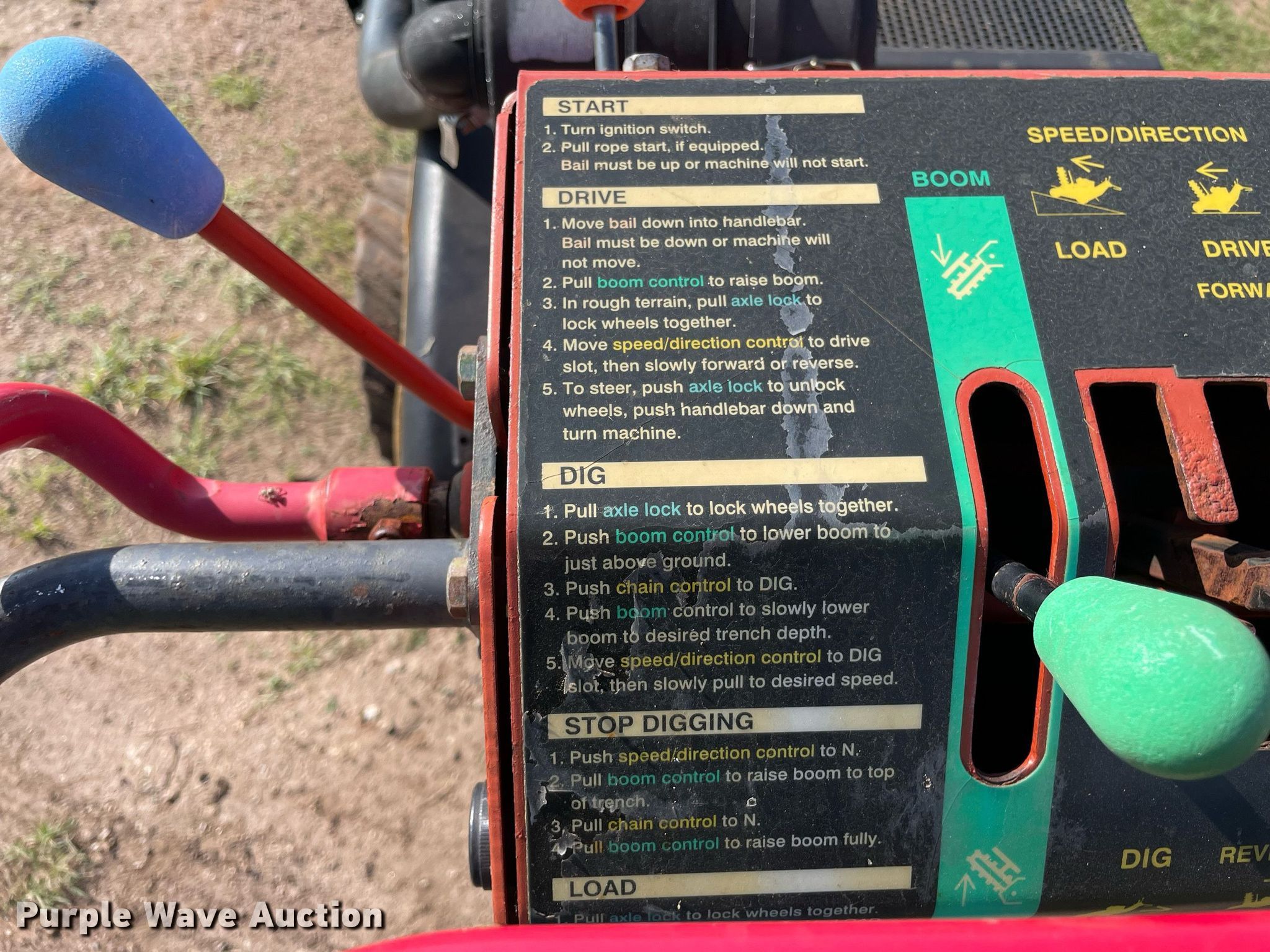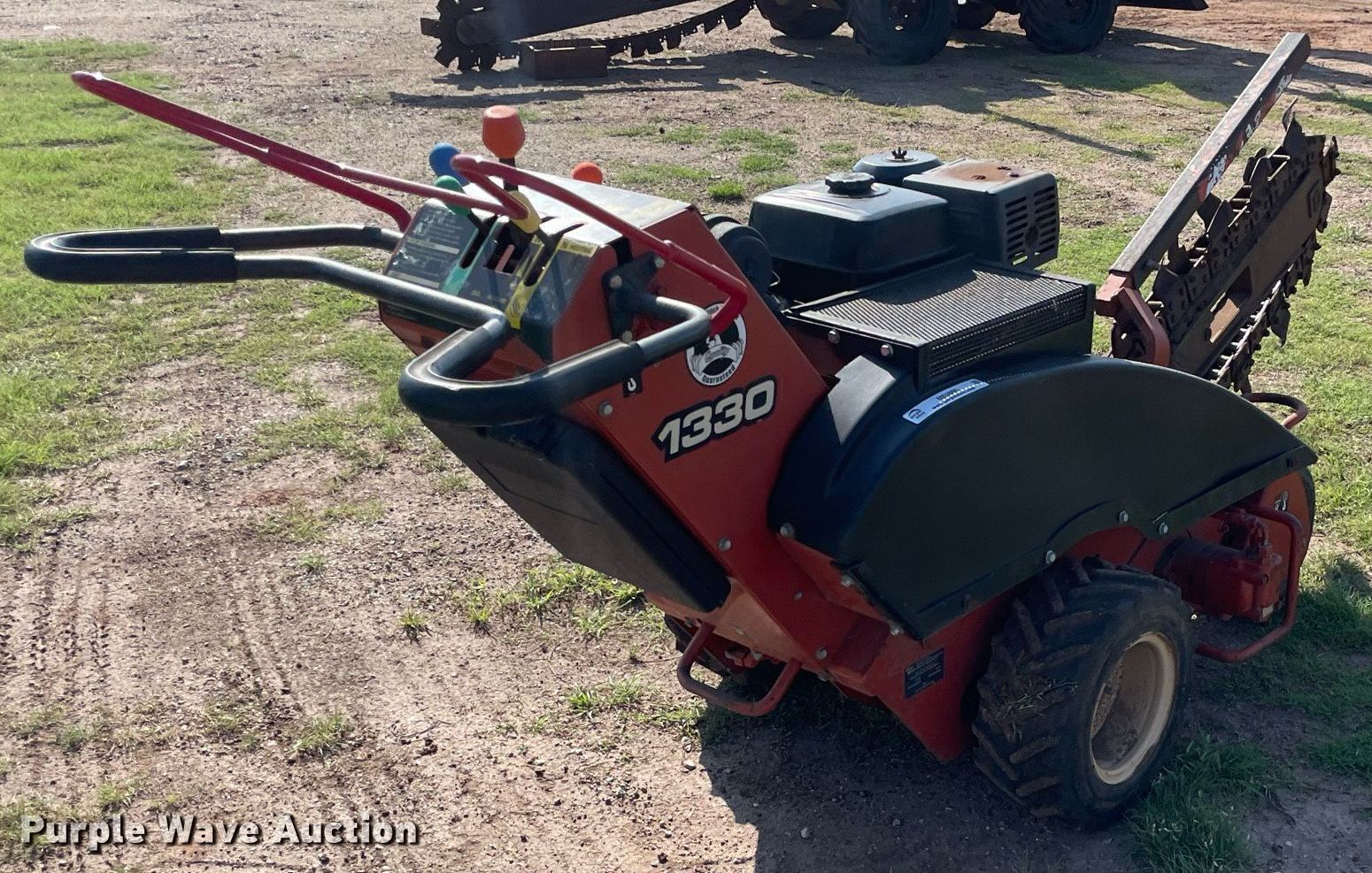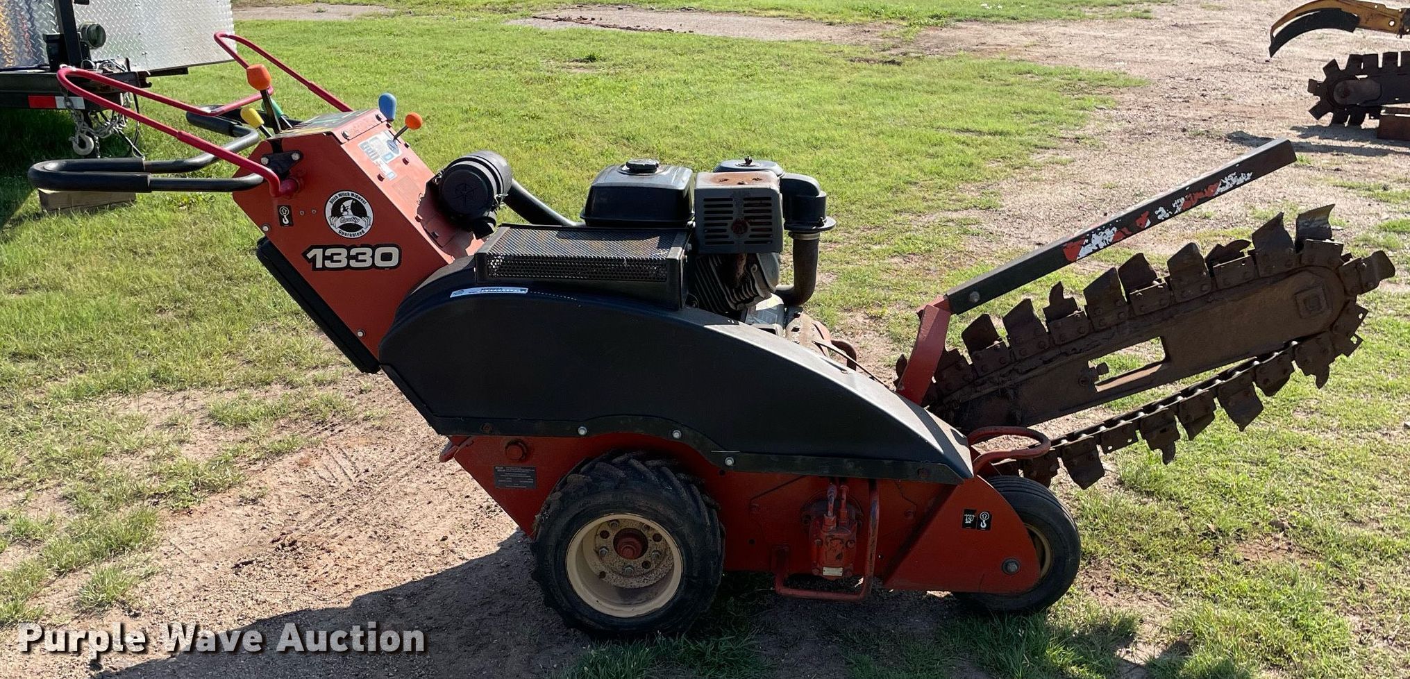 2008 Ditch Witch 1330 trencher. Serial: CMW1330HA80001522. Engine Honda, Displacement: 38.9 cc, Cylinders: 1, Fuel type: Gas. Transmission Hydrostatic. Features Trencher Estimated dig depth: 42", Cutting width: 4", Teeth: Dirt. Tires Front: 13x5.00-6, Rear: 16x6.50-6. Cheney, KS 67025