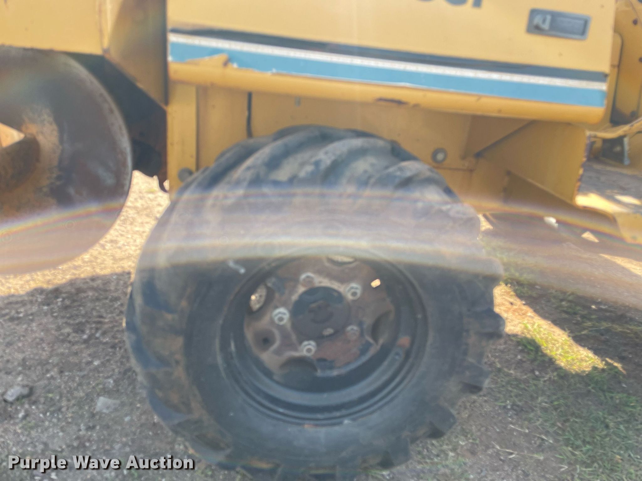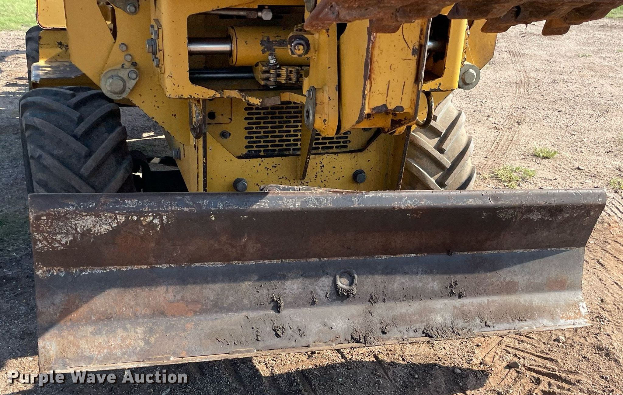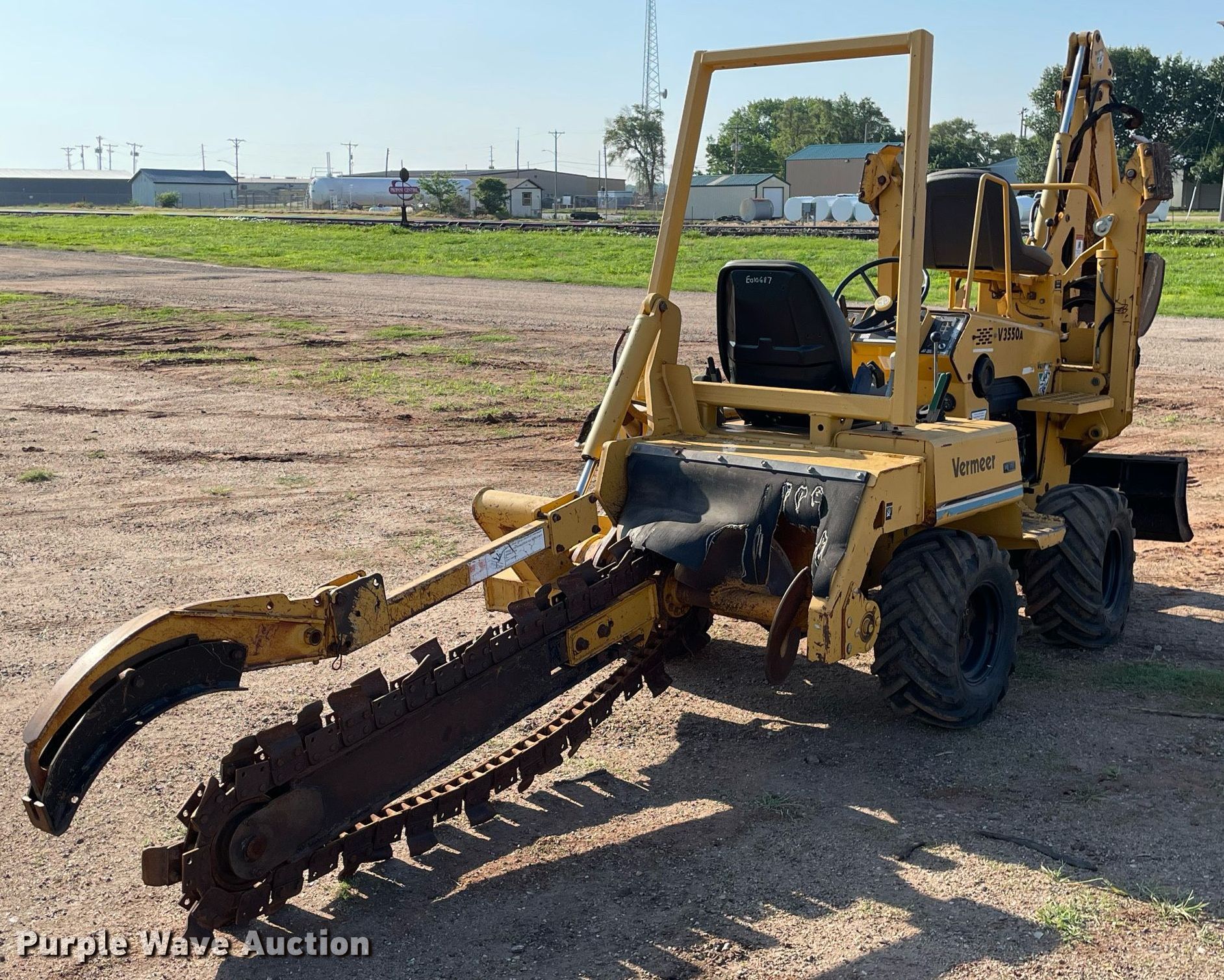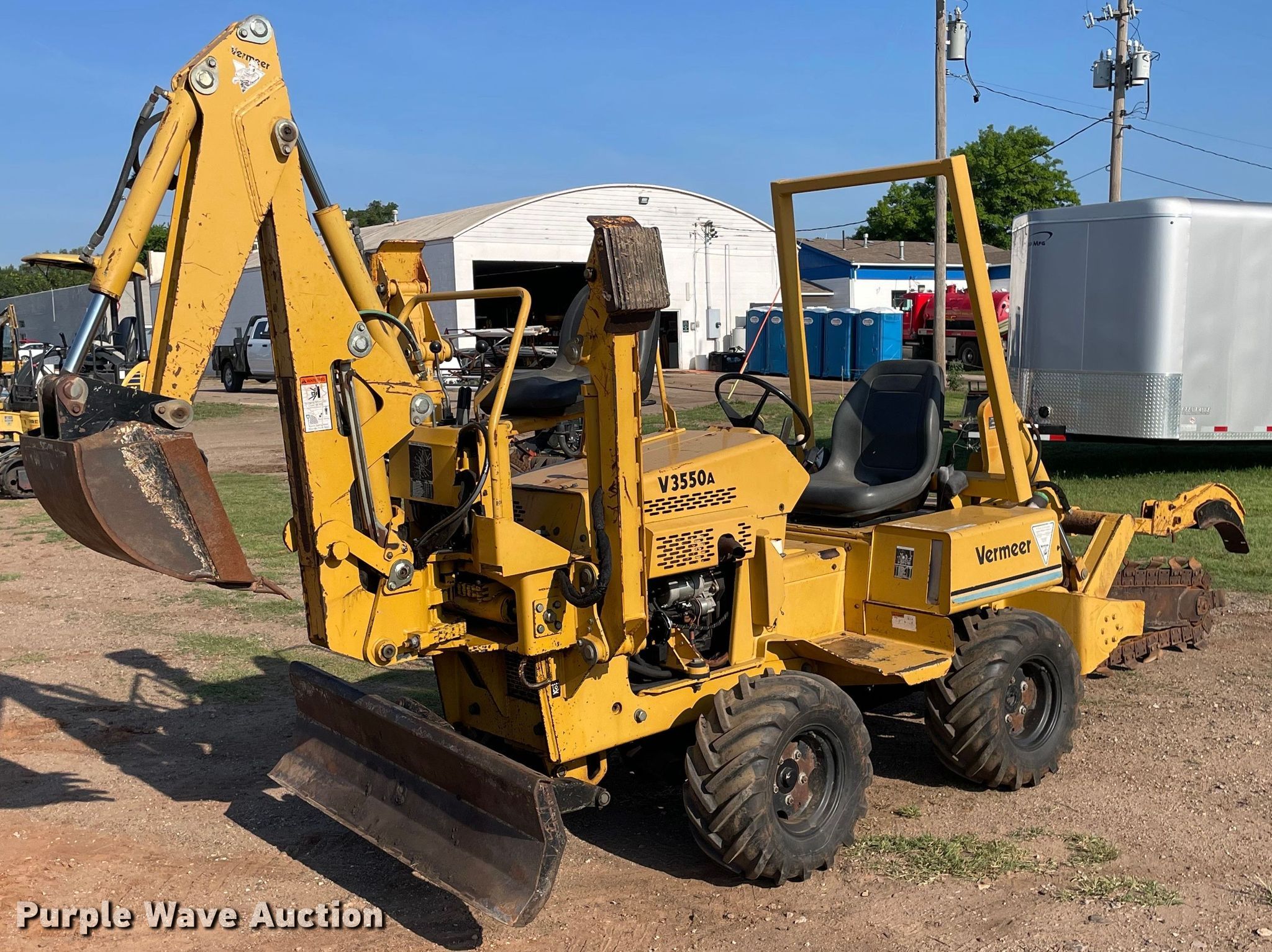 2000 Vermeer V3550A trencher. Hours: 1,942 on meter, Serial: 1VRS072P1Y1001661. Engine Cylinders: 3, Fuel type: Diesel. Transmission Hydrostatic, Two speed travel. Features Trencher Model: TR3550A, Serial: 1VRW050A7Y1000308, Estimated dig depth: 64", Cutting width: 6", Teeth: Dirt, Manual crumber, Backhoe Model: B500, Serial: 1VRM040M2Y1001247, Bucket width: 18", Backfill blade Width: 54". Tires Size: 26x12.00-12. Notes 10" W teeth included. Cheney, KS 67025