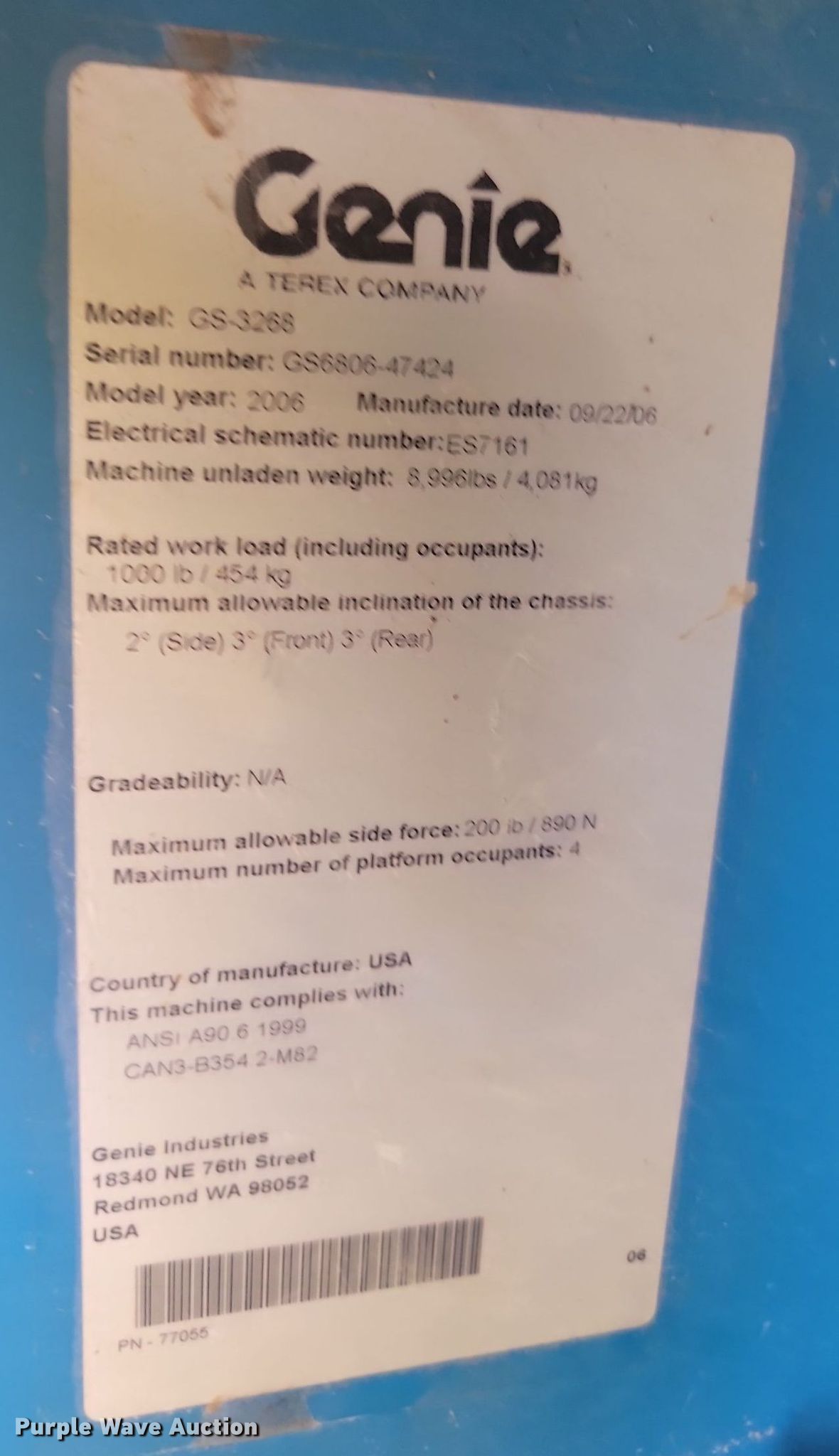 Purple Wave is selling a used Scissor or Vertical Lift in South Dakota. This item is a 2006 Genie GS-3268 scissor lift with the following: Hours: 2,010 on meter, Serial: 47424