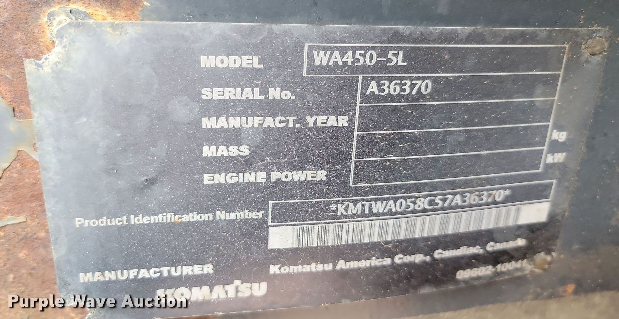 Purple Wave is selling a used Wheel Loader in South Dakota. This item is a 2005 Komatsu WA450-5L wheel loader with the following: Hours: 20,289 on meter, Serial: A36370