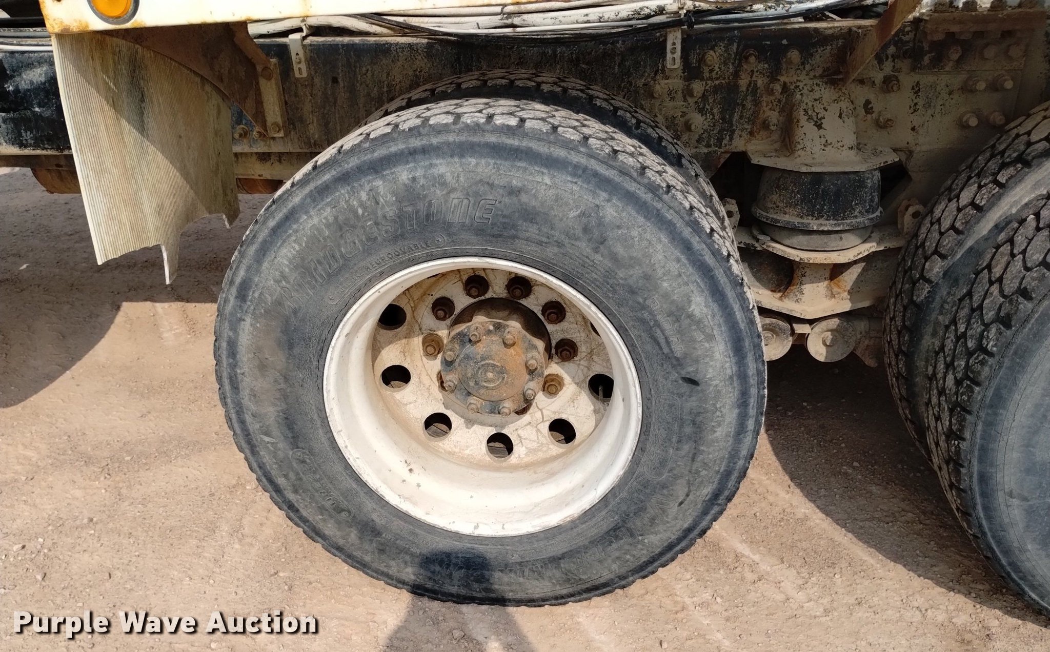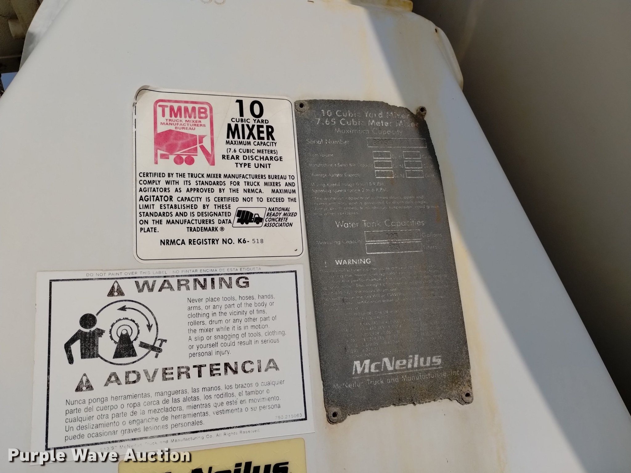 2004 Sterling LT9511 ready mix truck. Miles: 156,682 on odometer, Hours: 16,826 on meter, VIN: 2FZHAZAS64AM87917, Unit #: 57004104. Engine Caterpillar C12, Displacement: 12.0L, Cylinders: 6, Fuel type: Diesel. Transmission Eaton Fuller, Manual, Speed: 9. Chassis Axles: Tandem, Suspension: Spring over walking beam, Brakes: Air, PTO. Interior AC, Heat, Heated mirrors, Cruise control. Features Mixer McNeilus, Capacity: 10 cu.yd., Discharge: Rear, In-cab controls, Water tank capacity: 125 gallons, Chute Extensions: 3, Chute type: Steel.. Tires Front: 425/65R22.5, Rear: 11R22.5. Iowa title. Croell Inc.. 230 Croell Drive. Sundance, WY 82729