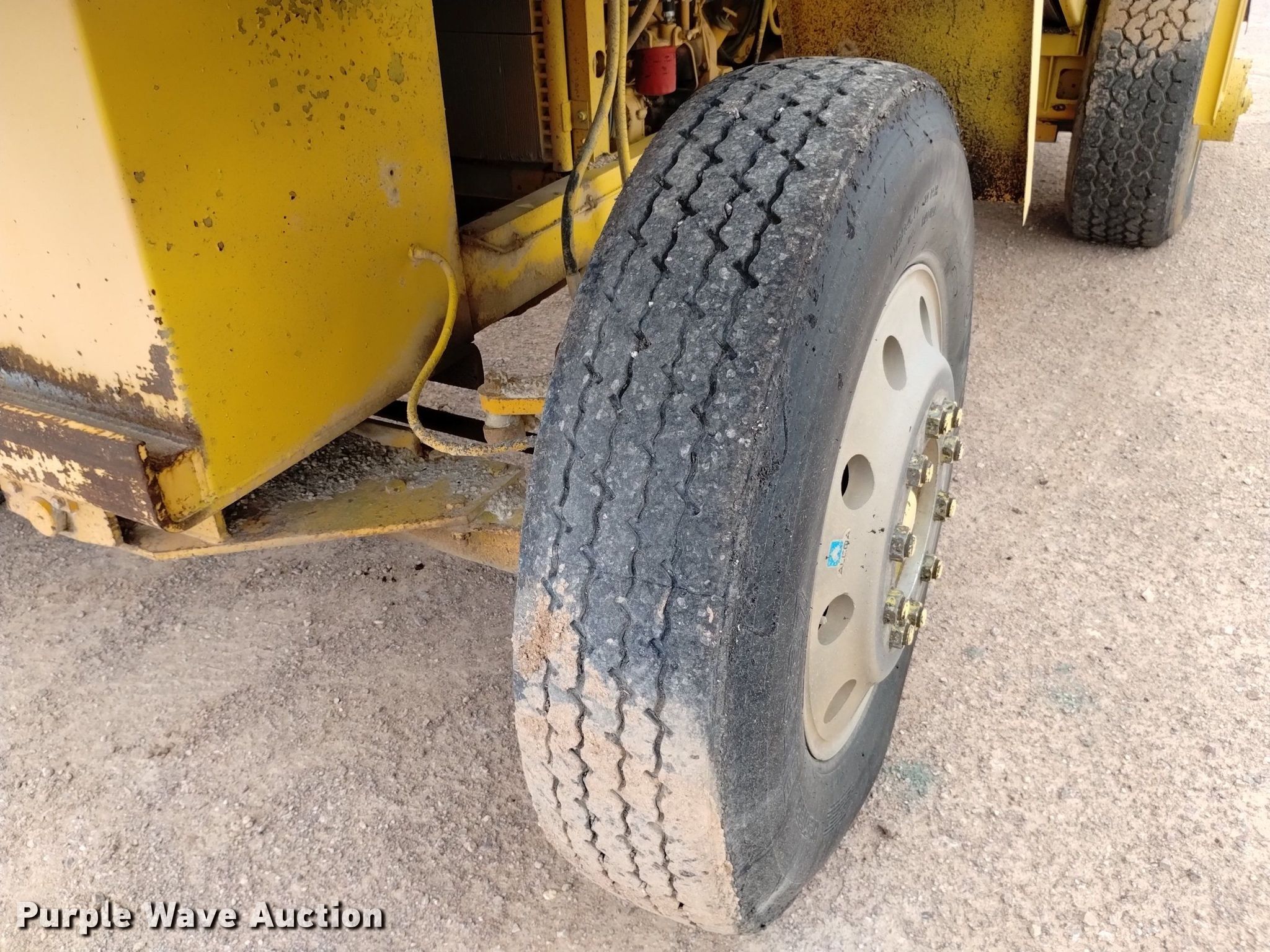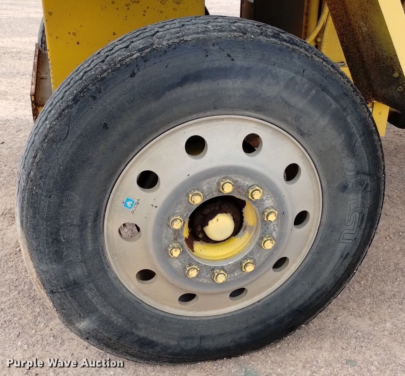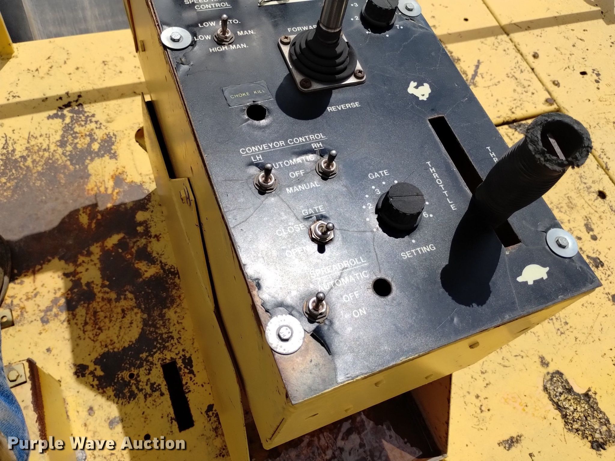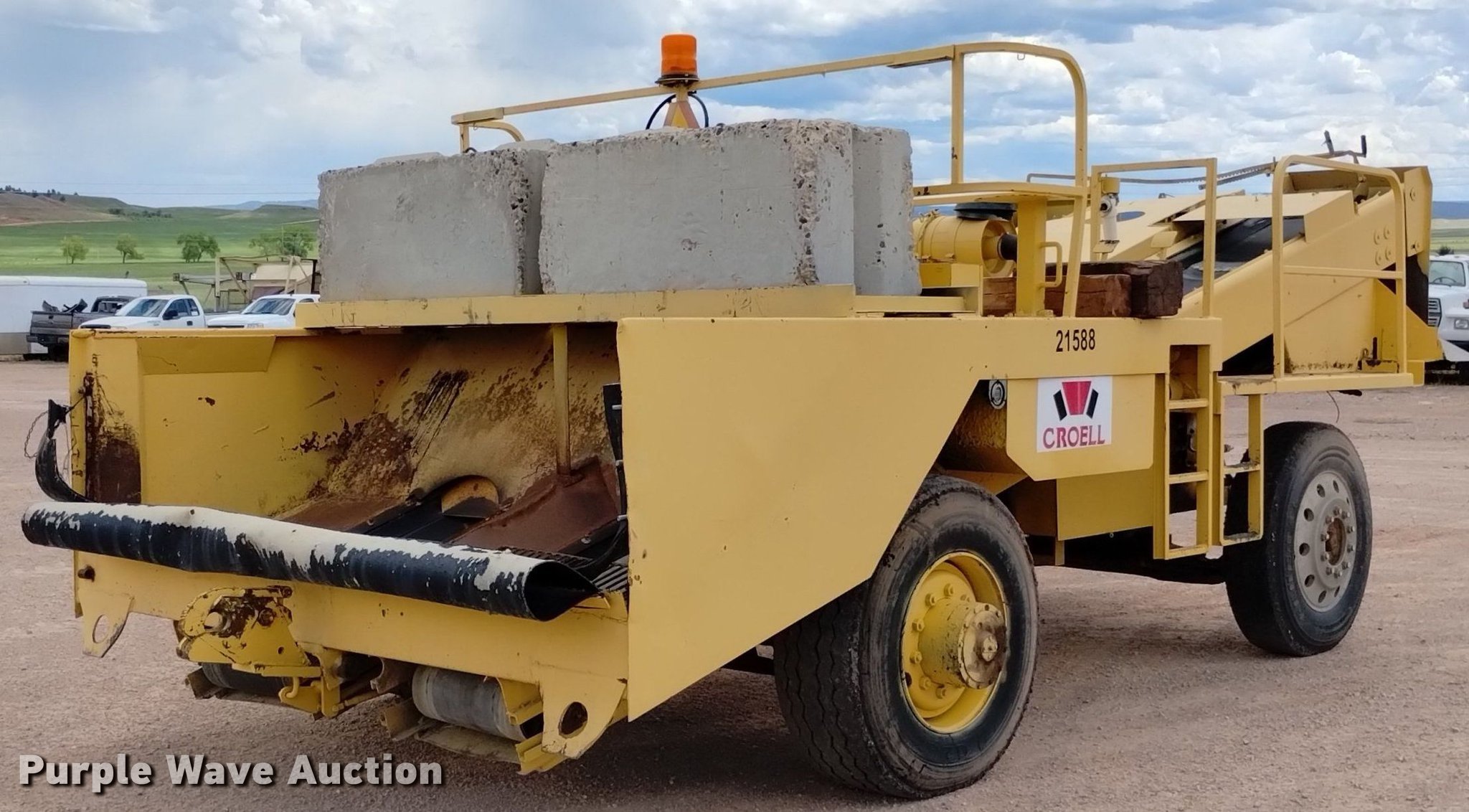 Rosco chip spreader. Hours: 1,619 on meter, Unit #: 21588. Engine Detroit Diesel, Cylinders: 4, Fuel type: Diesel. Transmission Hydrostatic. Features Paving width: to 14', Front spread hopper width: 9.5', Truck hitch. Tires Front: 11R24.5, Rear: 385/65R22.5. Notes Dead battery. Croell Inc.. 230 Croell Drive. Sundance, WY 82729