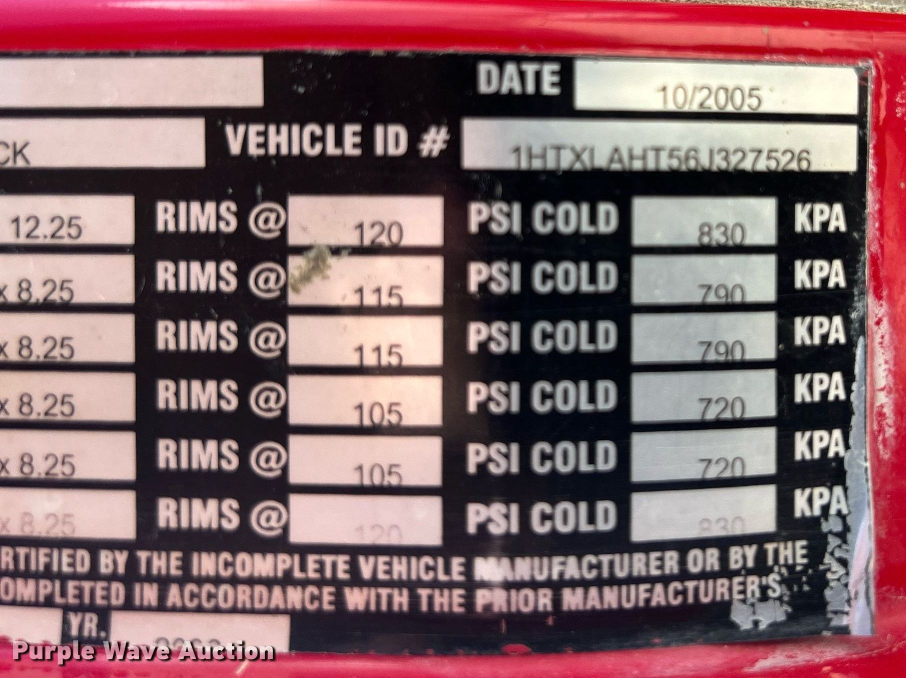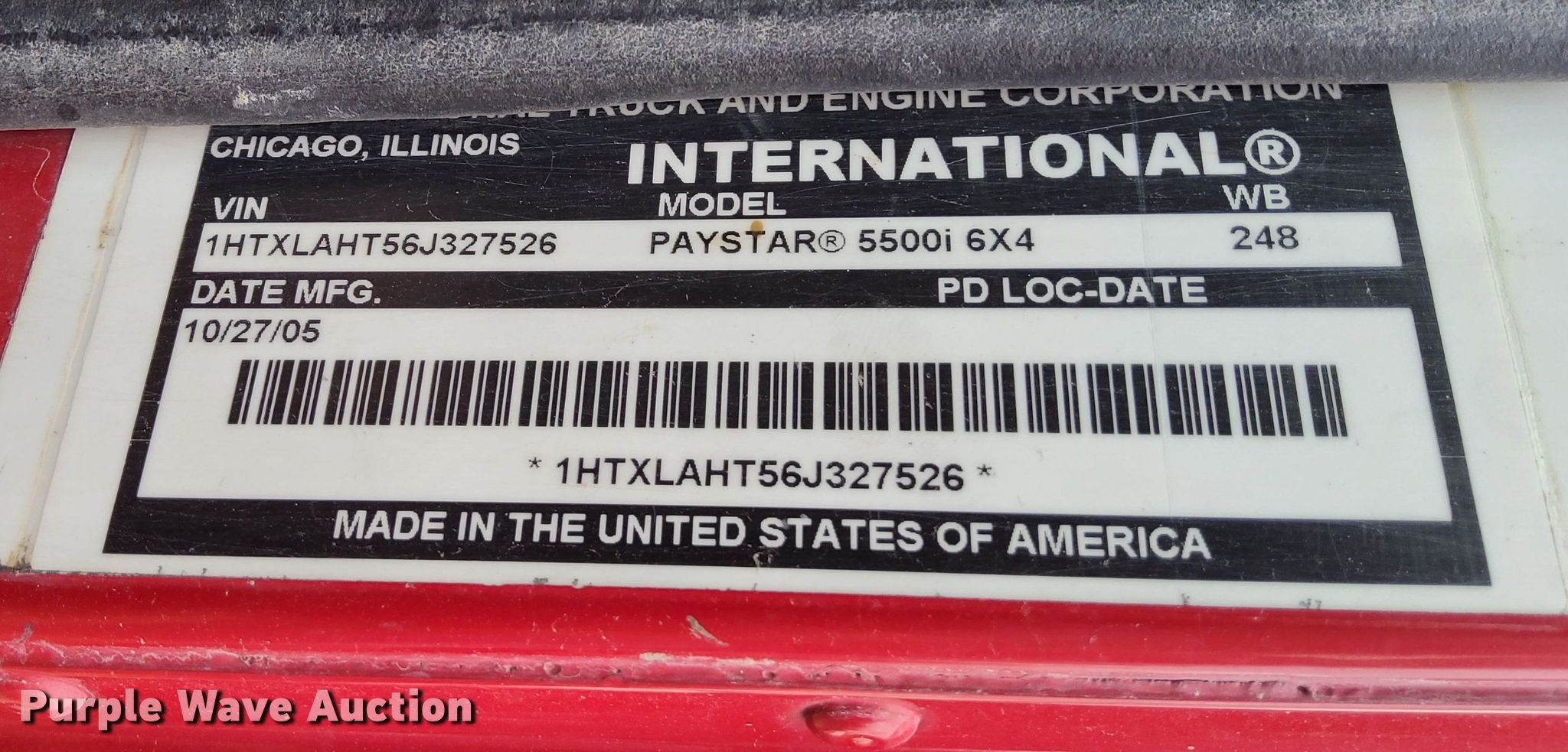 2006 International Paystar 5500i ready mix truck. Miles: 173,335 on odometer, Hours: 19,203 on meter, VIN: 1HTXLAHT56J327526, Unit #: 5700678. Engine Cummins ISM, Displacement: 10.8L, Cylinders: 6, Fuel type: Diesel. Transmission Eaton Fuller, Manual, Speed: 9. Chassis Axles: 5, Pusher axle Steerable, Tag axle Steerable, Differential lock: Inter-axle, Suspension: Spring over walking beam, Brakes: Air, PTO, GVWR: 80,000 lbs, Wheelbase: 248". Interior AC, Heat, Heated mirrors, Cruise control. Features Mixer McNeilus, Capacity: 11 cu.yd., Discharge: Rear, In-cab controls, Rear drum controls, Water tank capacity: 125 gallons, Chute Extensions: 3, Chute type: Steel.. Tires Front: 425/65R22.5, Rear: 11R22.5, Lift axle: 255/70R22.5, Tag axle: 11R22.5. Iowa title. Croell Redi-Mix. 2010 Kenwood Ave. New Hampton, IA 50659