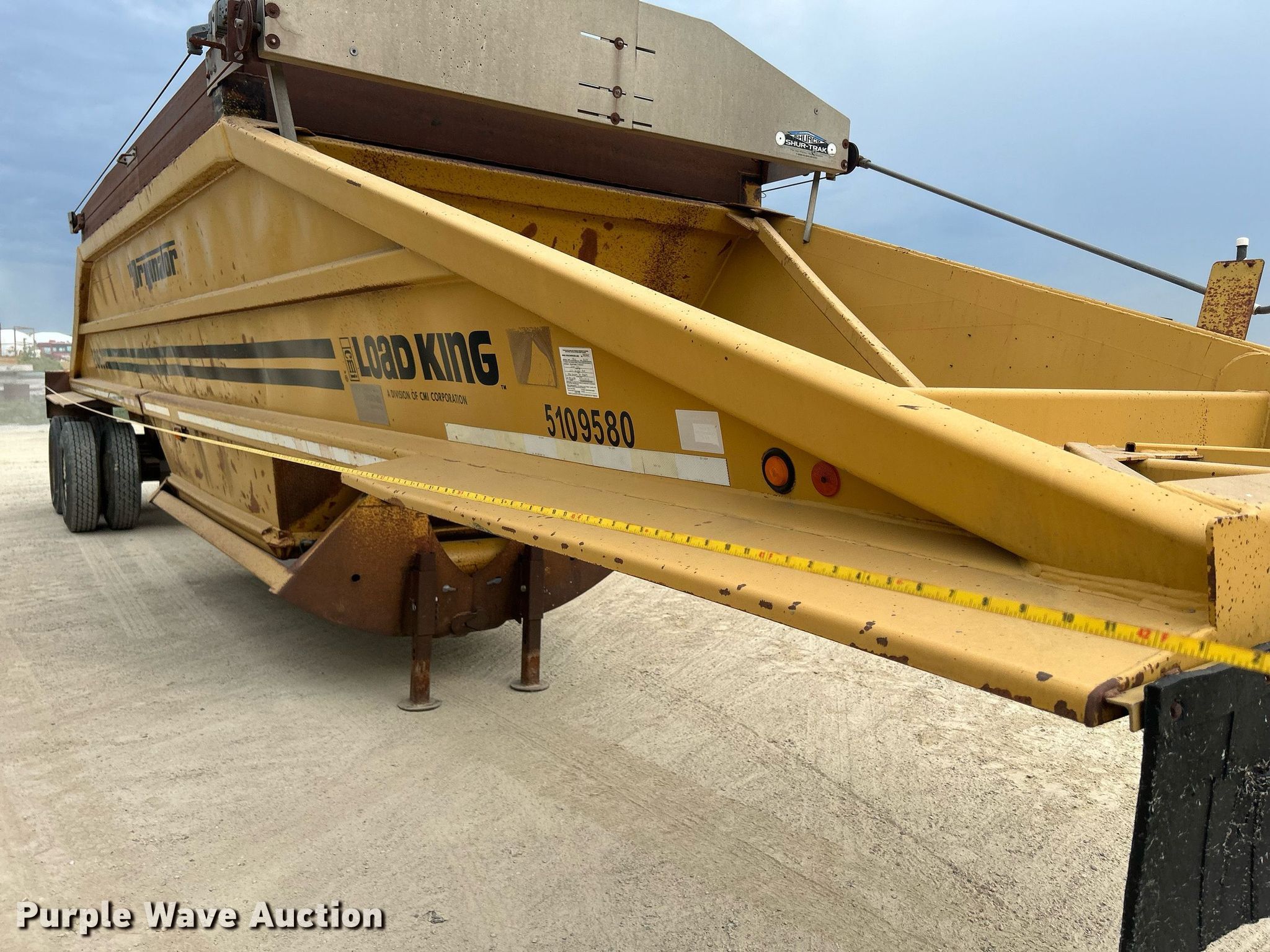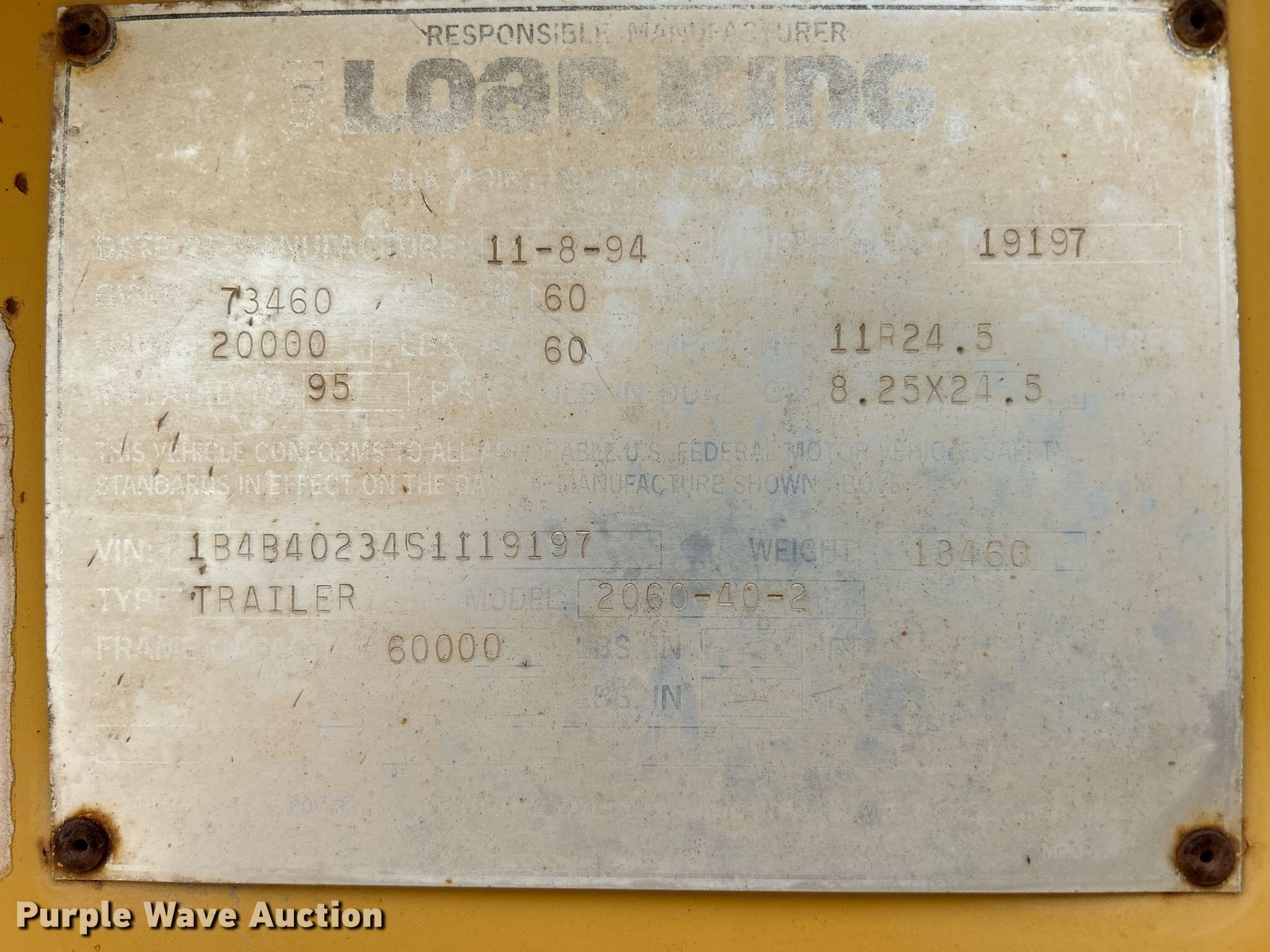1995 Load King 2060-40-2 bottom dump trailer. VIN: 1B4B40234S1119197, Unit #: 5109580. Dimensions Overall: 41' 6" L x 102" W, Side height: 84". Features Body type: Steel, Ram: Dual, Clamshell gate: Air operated, Rear push block, Roll tarp. Chassis Landing gear: Dual, Suspension: Spring, Brakes: Air, Axles: Tandem, GVWR: 73,460 lbs, GAWR: 20,000 lbs. Tires Steel wheels, Size: 11R22.5. Iowa title. Croell Redi-Mix. 2010 Kenwood Ave. New Hampton, IA 50659