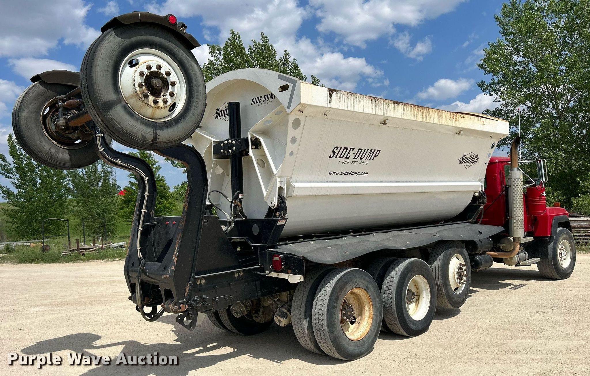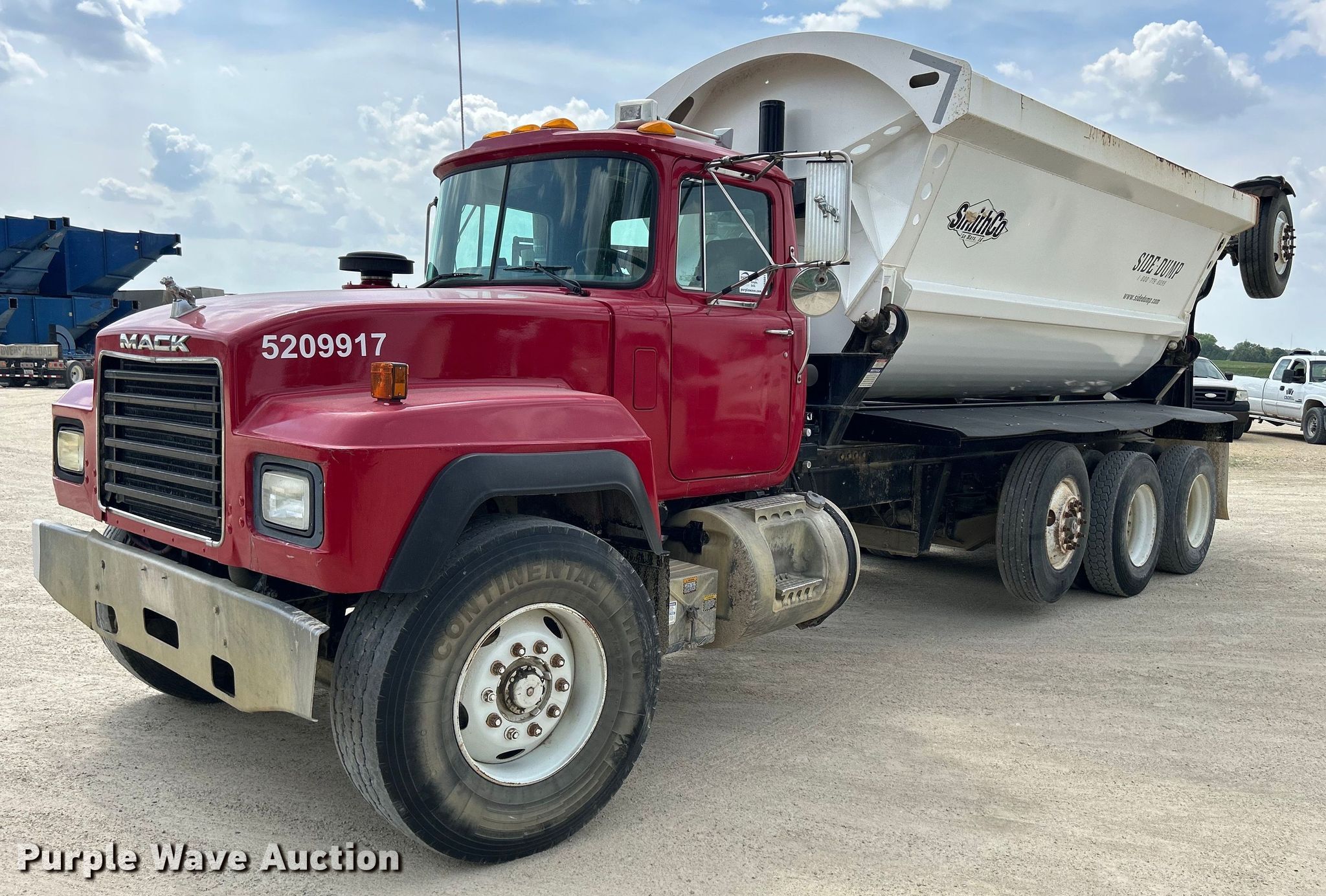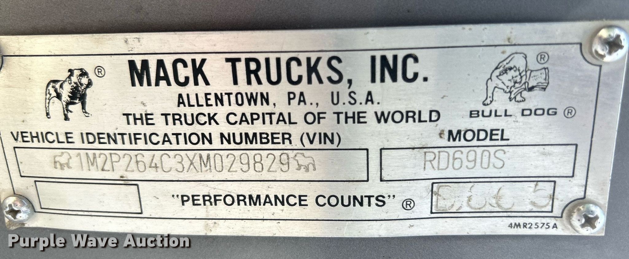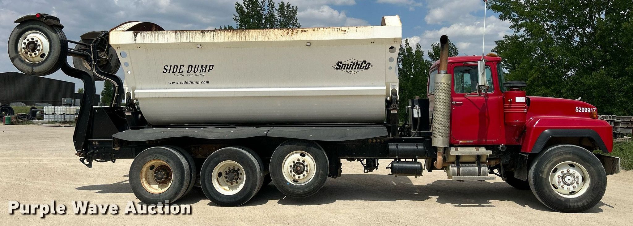 1999 Mack RD690S dump truck. Miles: 253,103 on odometer, Hours: 16,226 on meter, Hours: 3,422 on second meter, VIN: 1M2P264C3XM029829, Unit #: 5209917. Engine Mack, Displacement: 12.0L, Cylinders: 6, Fuel type: Diesel. Transmission Eaton Fuller, Manual, Speed: 9. Chassis Axles: 4, Pusher axle Steerable, Tag axle Steerable, Differential lock: Inter-axle, Suspension: Spring over walking beam, Brakes: Air, PTO, GVWR: 80,000 lbs, Wheelbase: 250". Interior AC, Heat, Cruise control. Features Side dump bed SmithCo Side-Dump, 15' x 8' W, Bed type: Steel, Ram: Dual. Tires Front: 425/65R22.5, Rear: 11R22.5, Lift axle: 11R22.5. Notes Non-operational original hour meter. Iowa title. Croell Redi-Mix. 2010 Kenwood Ave. New Hampton, IA 50659