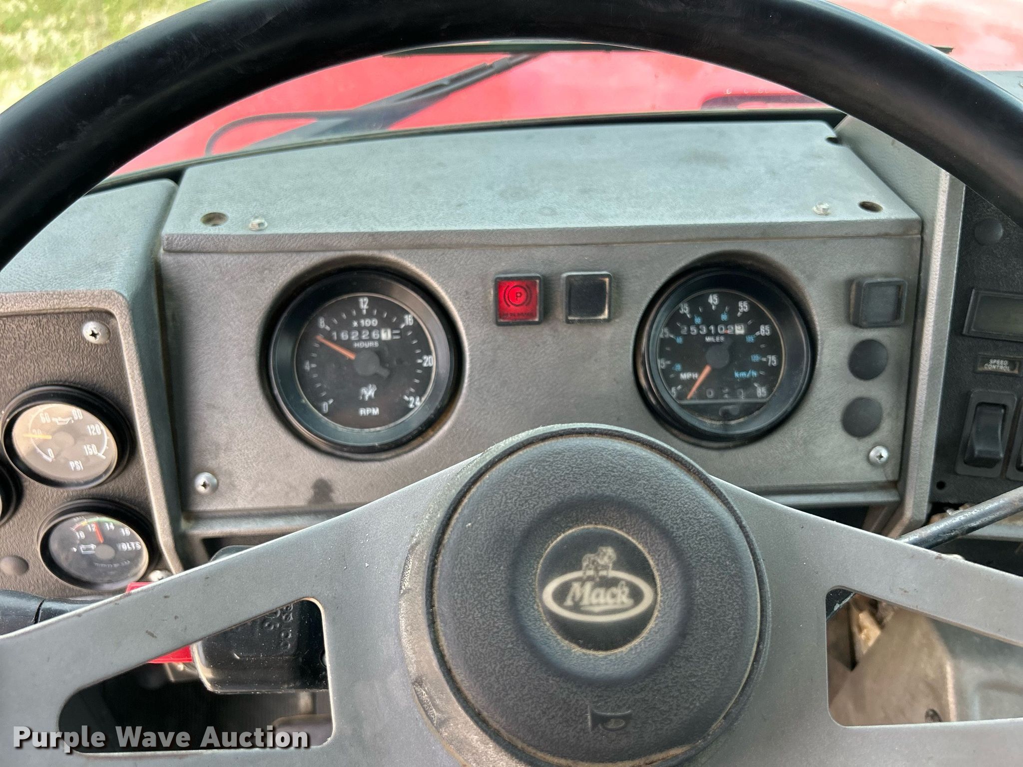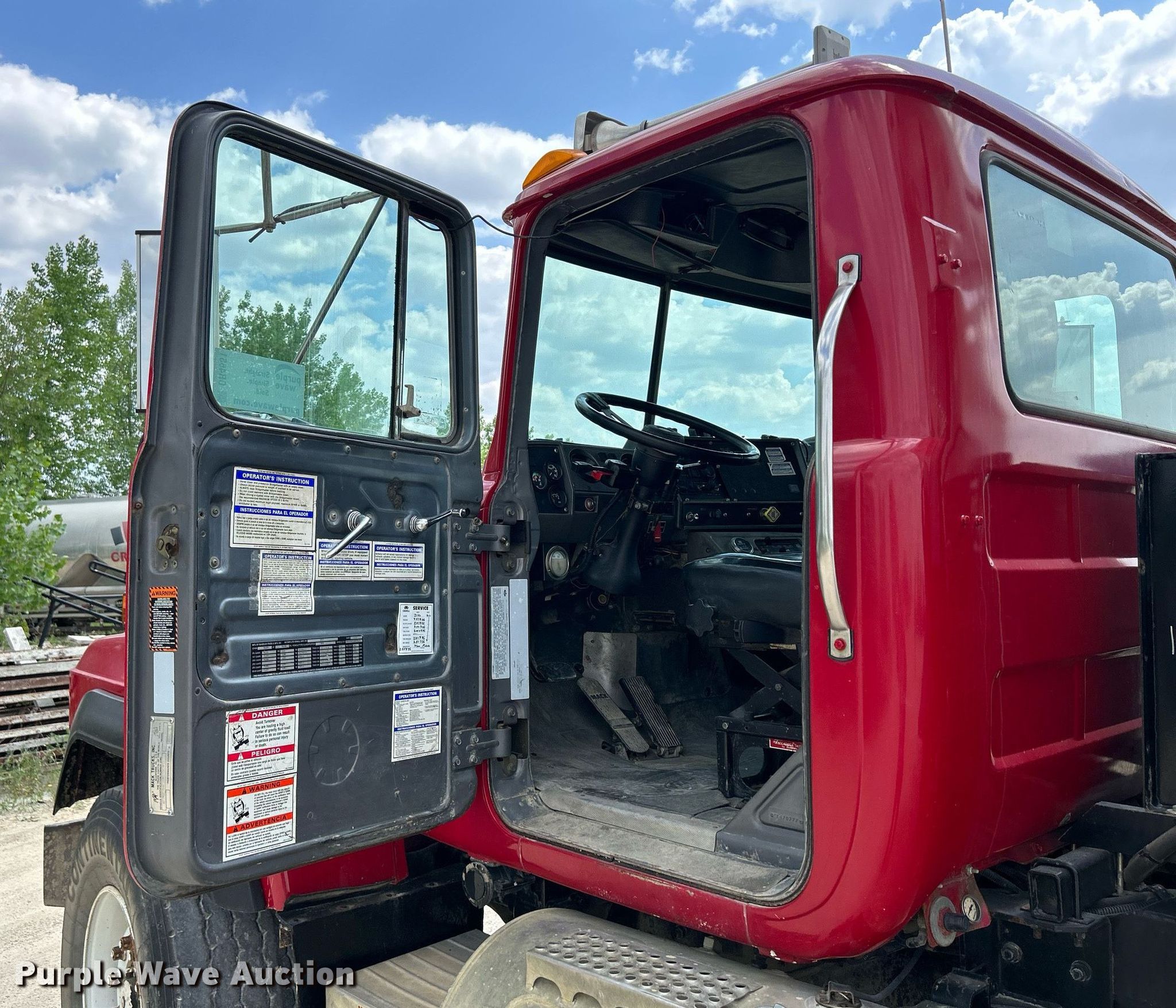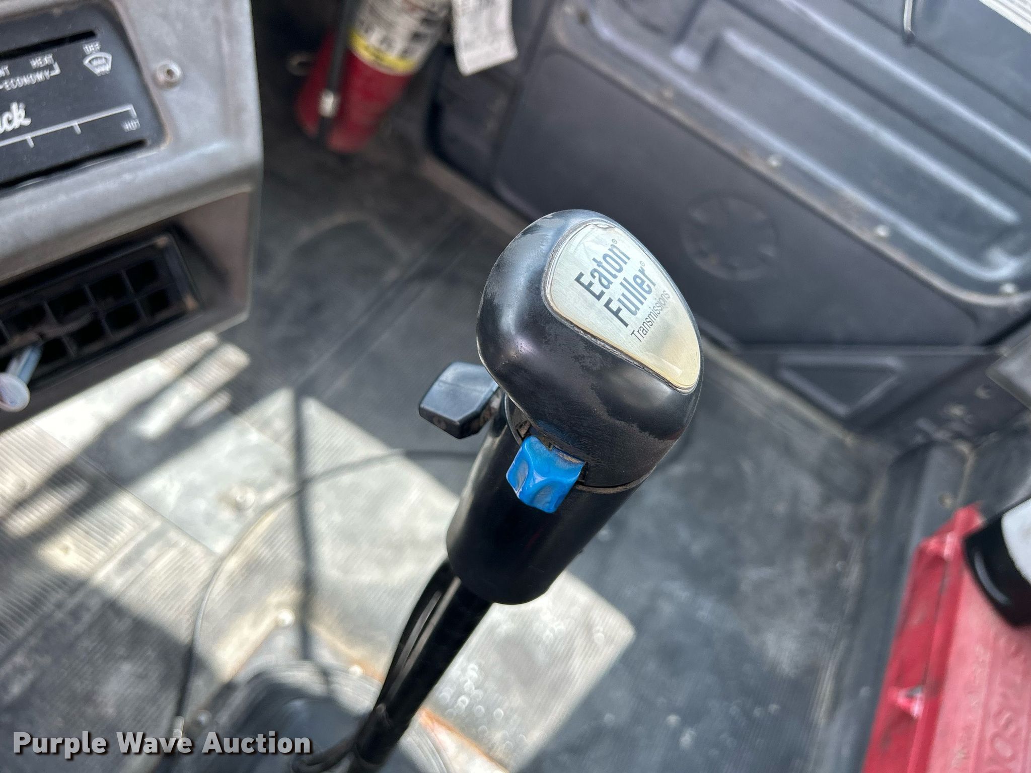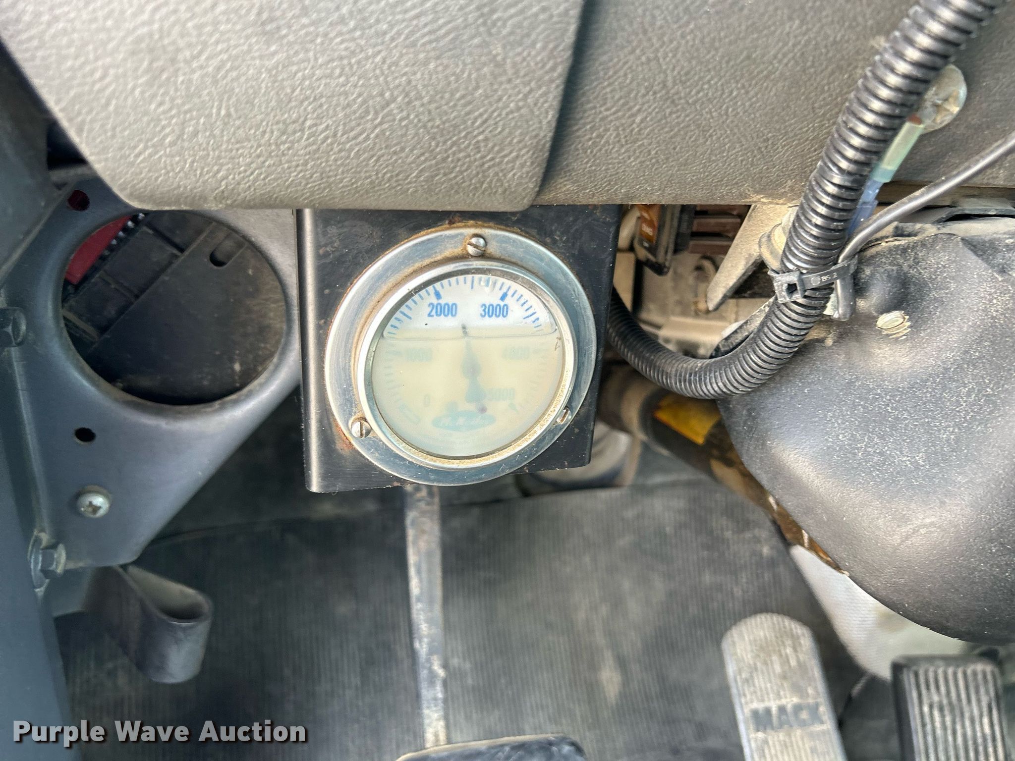 1999 Mack RD690S dump truck. Miles: 253,103 on odometer, Hours: 16,226 on meter, Hours: 3,422 on second meter, VIN: 1M2P264C3XM029829, Unit #: 5209917. Engine Mack, Displacement: 12.0L, Cylinders: 6, Fuel type: Diesel. Transmission Eaton Fuller, Manual, Speed: 9. Chassis Axles: 4, Pusher axle Steerable, Tag axle Steerable, Differential lock: Inter-axle, Suspension: Spring over walking beam, Brakes: Air, PTO, GVWR: 80,000 lbs, Wheelbase: 250". Interior AC, Heat, Cruise control. Features Side dump bed SmithCo Side-Dump, 15' x 8' W, Bed type: Steel, Ram: Dual. Tires Front: 425/65R22.5, Rear: 11R22.5, Lift axle: 11R22.5. Notes Non-operational original hour meter. Iowa title. Croell Redi-Mix. 2010 Kenwood Ave. New Hampton, IA 50659
