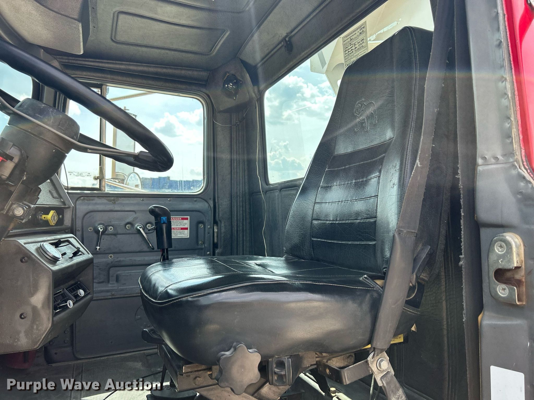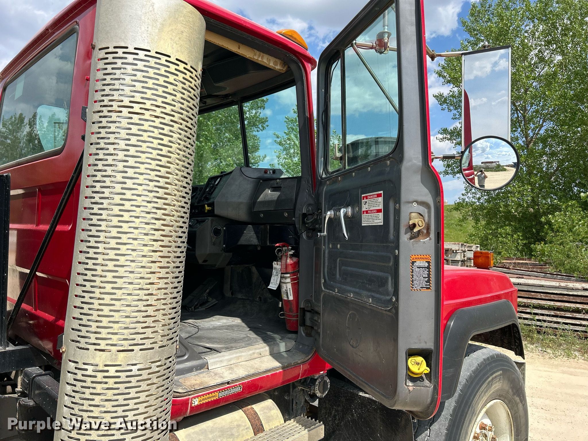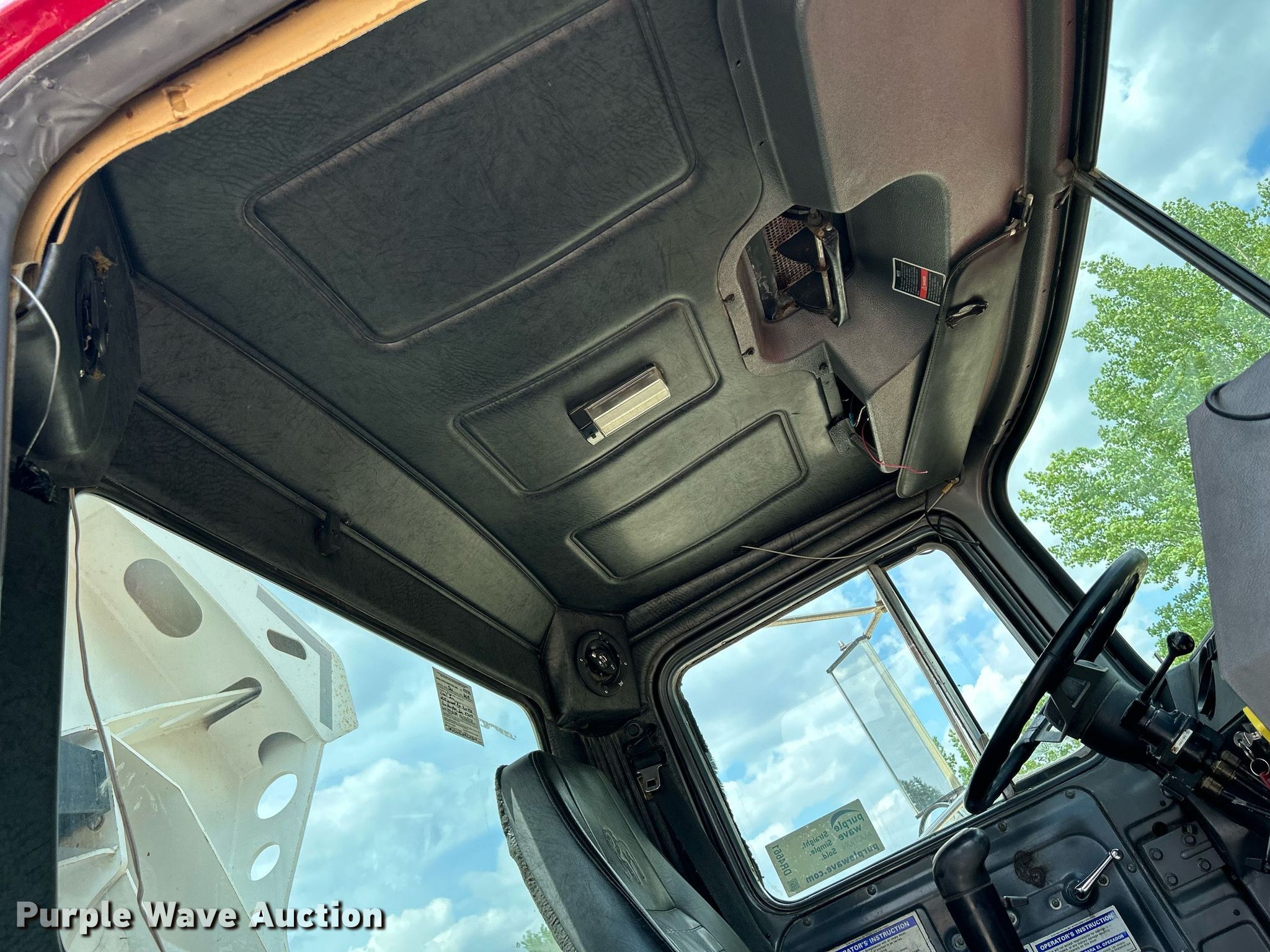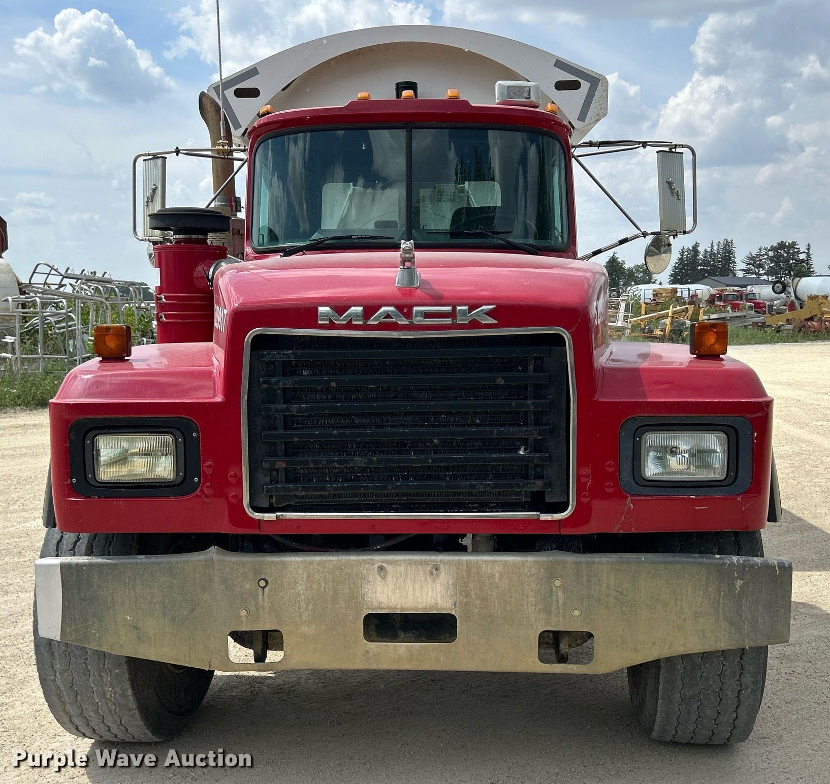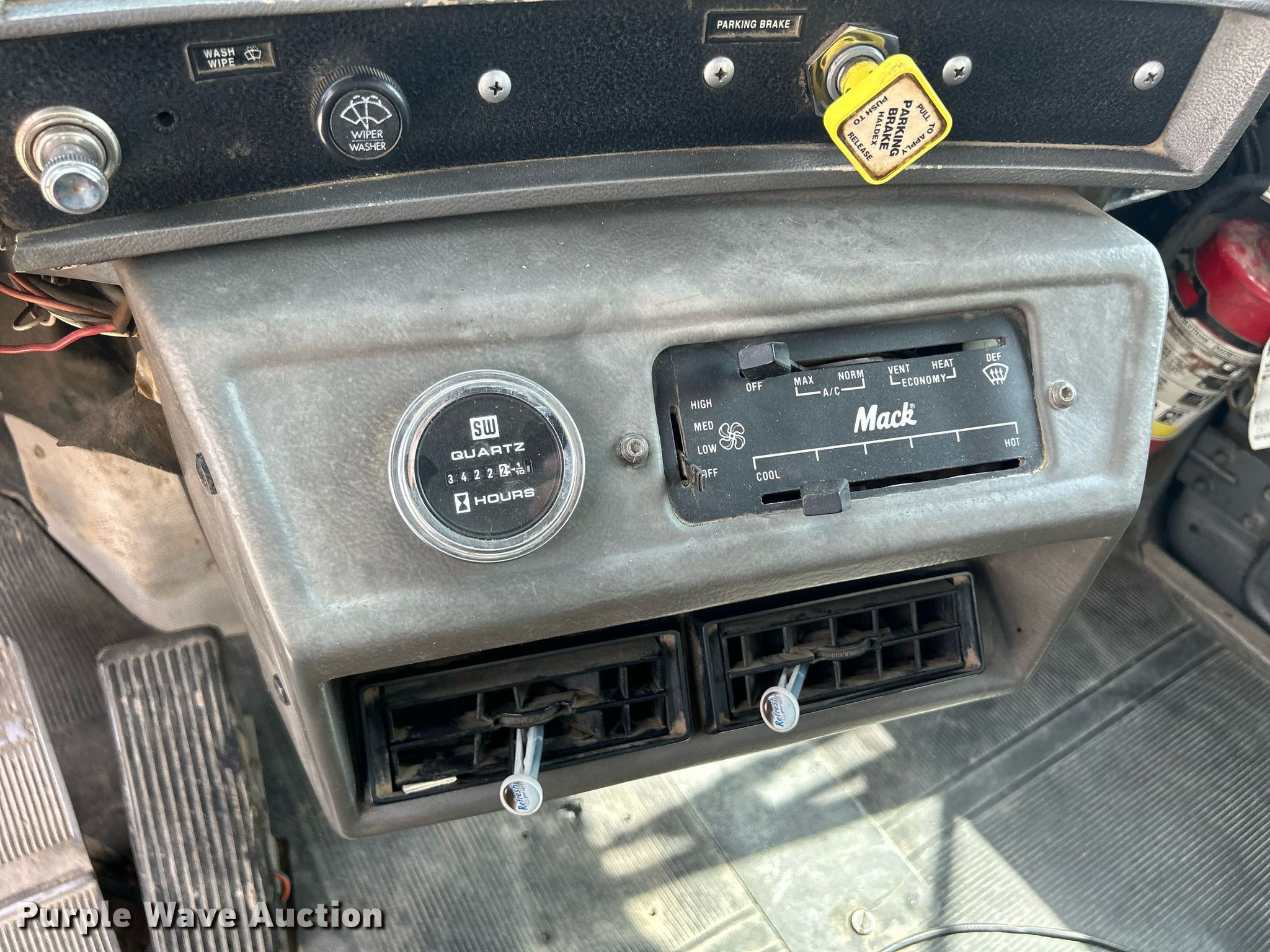 1999 Mack RD690S dump truck. Miles: 253,103 on odometer, Hours: 16,226 on meter, Hours: 3,422 on second meter, VIN: 1M2P264C3XM029829, Unit #: 5209917. Engine Mack, Displacement: 12.0L, Cylinders: 6, Fuel type: Diesel. Transmission Eaton Fuller, Manual, Speed: 9. Chassis Axles: 4, Pusher axle Steerable, Tag axle Steerable, Differential lock: Inter-axle, Suspension: Spring over walking beam, Brakes: Air, PTO, GVWR: 80,000 lbs, Wheelbase: 250". Interior AC, Heat, Cruise control. Features Side dump bed SmithCo Side-Dump, 15' x 8' W, Bed type: Steel, Ram: Dual. Tires Front: 425/65R22.5, Rear: 11R22.5, Lift axle: 11R22.5. Notes Non-operational original hour meter. Iowa title. Croell Redi-Mix. 2010 Kenwood Ave. New Hampton, IA 50659