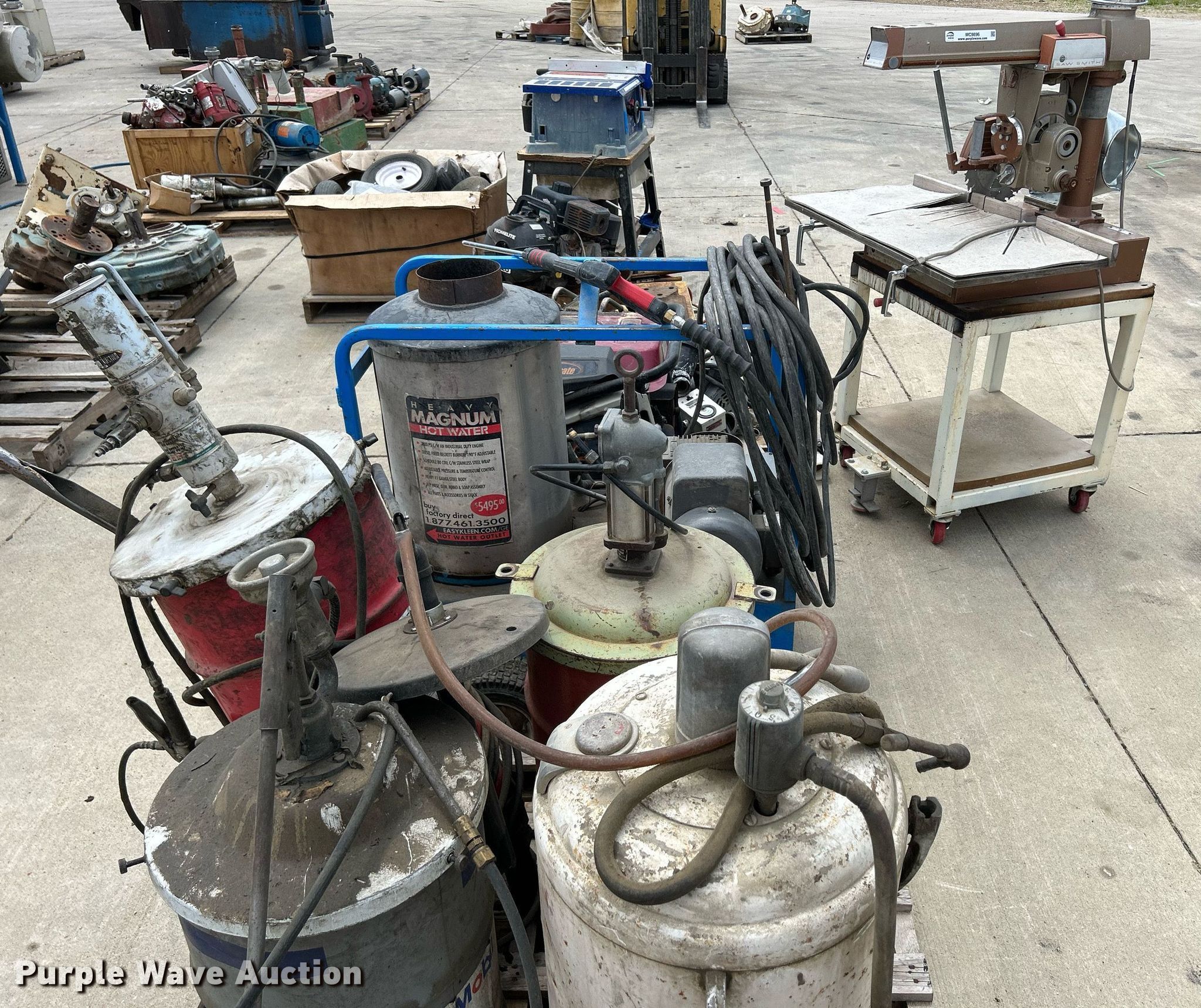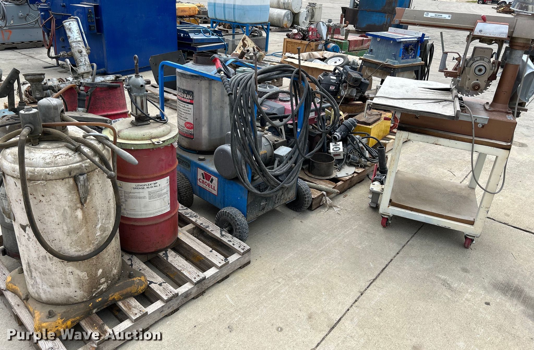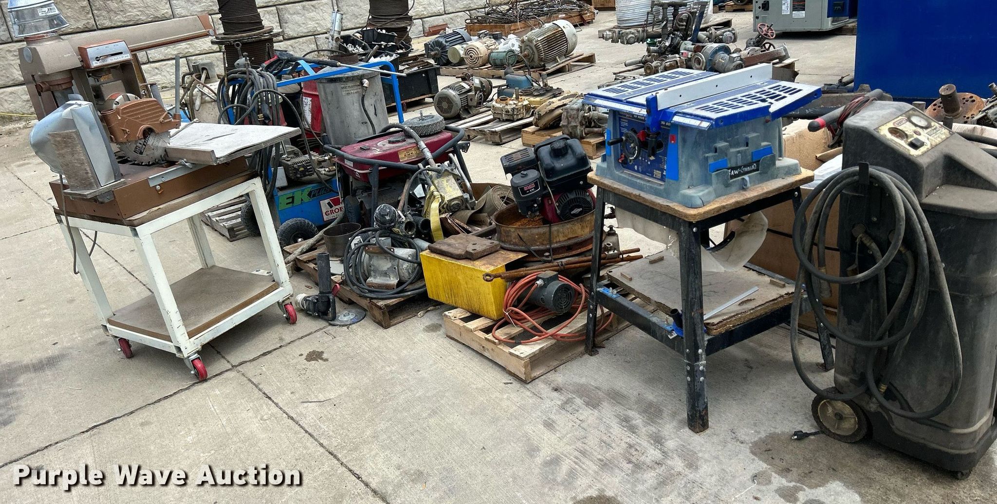 Purple Wave is selling a used Tools in Iowa. This item is a Tools with the following: Easy Kleen EK Plus pressure washer, (4) oil containers, Pumps, Yuba Saw Smith arm saw, Tires and wheels, Electric concrete vibrator, Homelite AP520 pump, Powermate 8125 generator, Benchtop Pro table saw, Wynn's transmission service cart, Unknown operating conditions