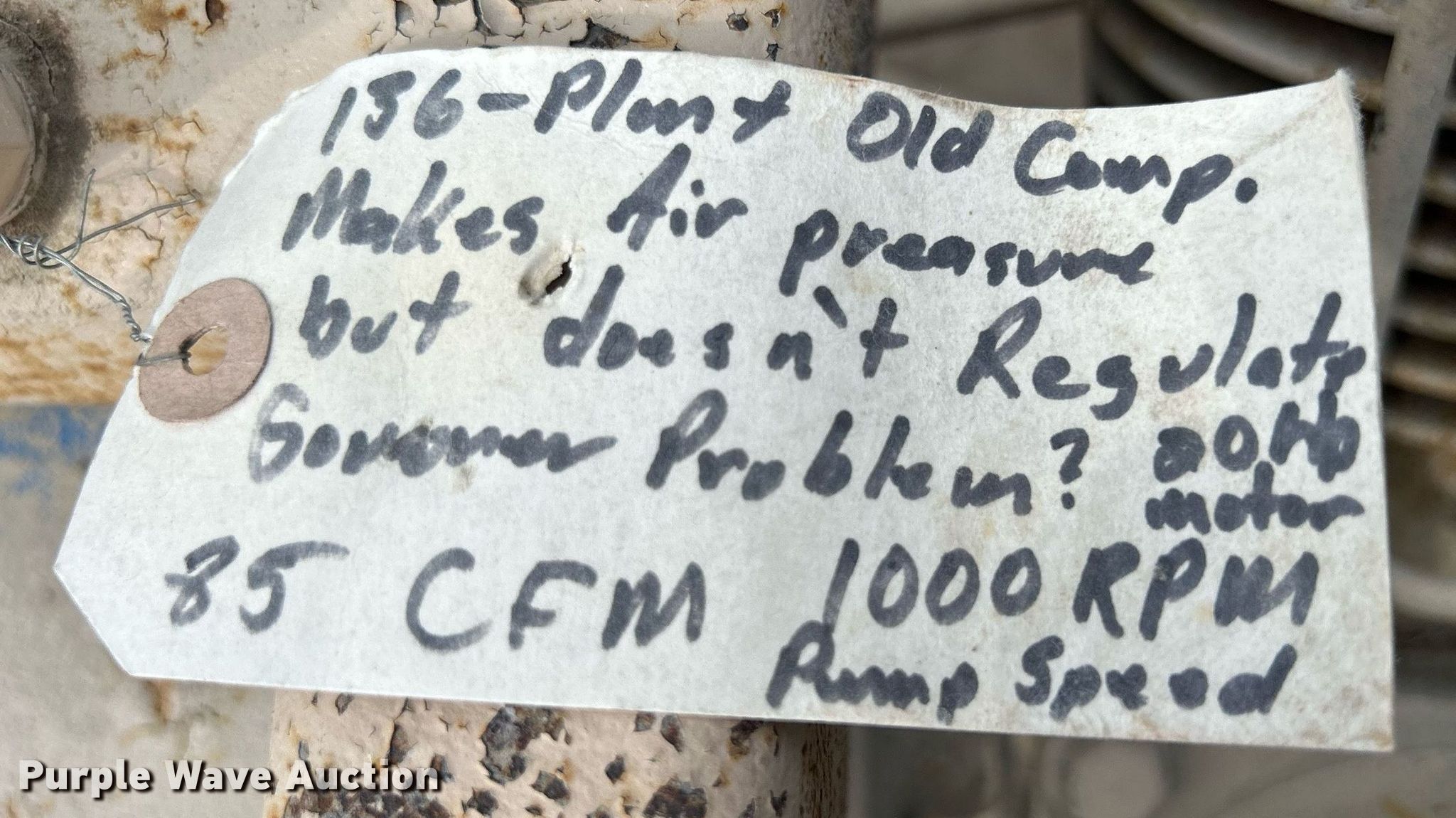 Purple Wave is selling a used Air Compressor in Iowa. This item is a Ingersoll Rand 15T air compressor with the following: Cylinders: 3, CFM: 85, Non-operational regulator, Unknown operating condition