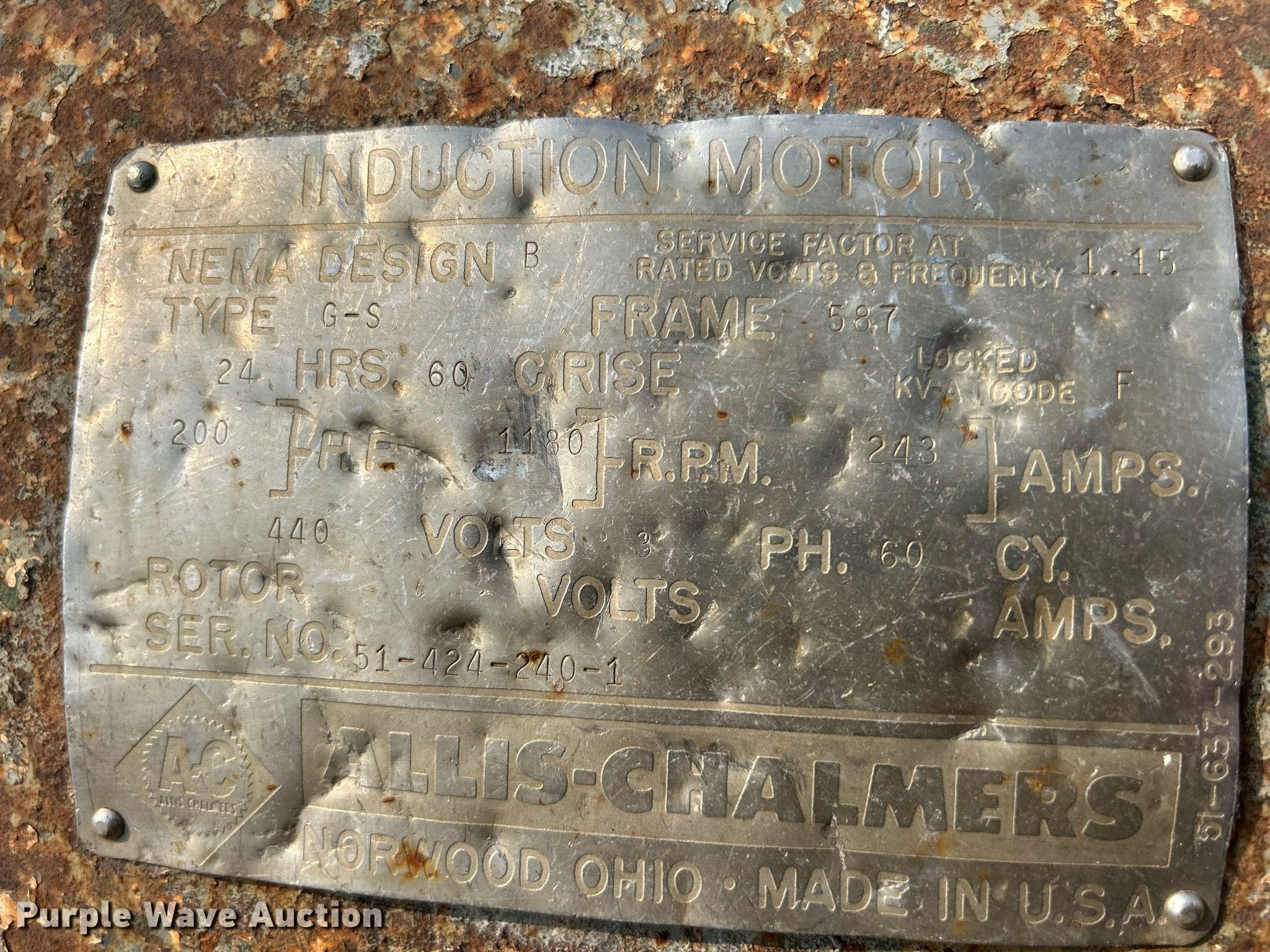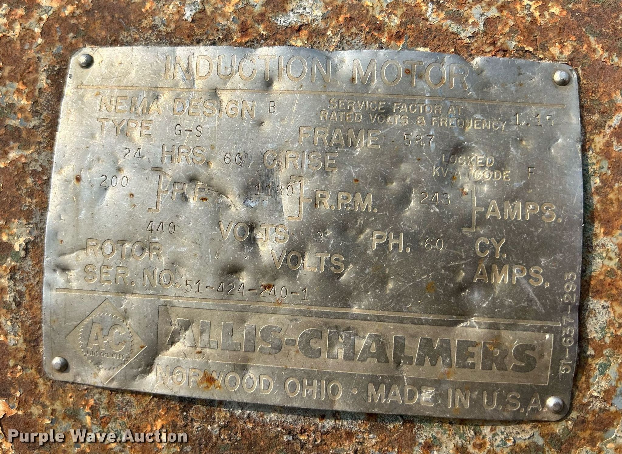 Allis-Chalmers electric motor. HP: 200, Volts: 440, Phase: Three. Notes Unknown operating condition. Croell Redi-Mix. 2010 Kenwood Ave. New Hampton, IA 50659