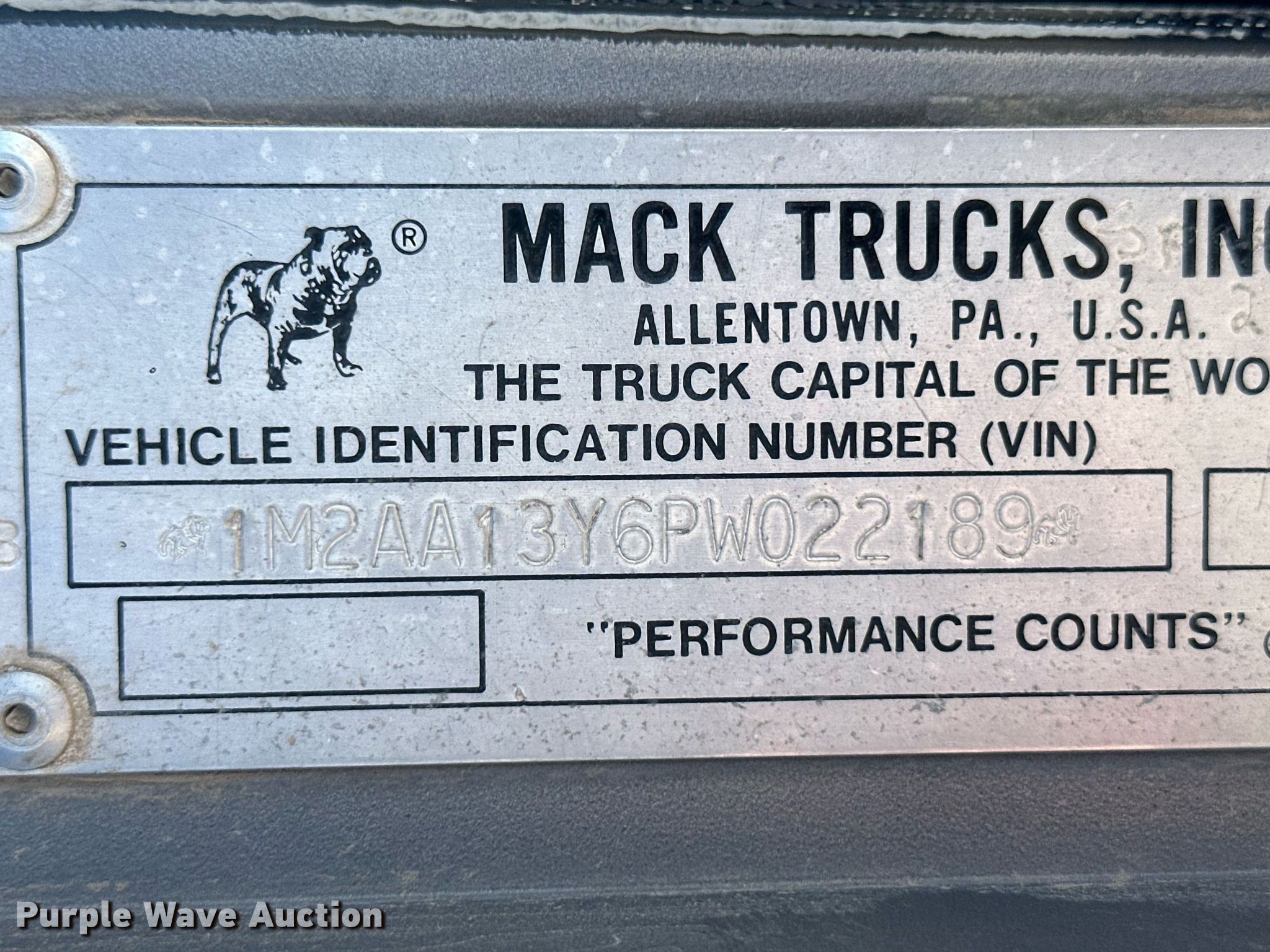 1993 Mack CH613 semi truck. Miles: 127,290 on odometer, Hours: 3,589 on meter, VIN: 1M2AA13Y6PW022189, Unit #: 5509370. Engine Mack, Displacement: 12.0L, Cylinders: 6, Fuel type: Diesel. Transmission Manual, Speed: 13. Chassis Axles: Tandem, Differential lock: Inter-axle, Suspension: Air Dump valves, Brakes: Air, PTO. Interior AC, Heat, Cruise control, Air ride cab, Sleeper Sleeper length: 48", Beds: Single. Features Fifth wheel type: Fixed, Rolling tailboard, Fuel tank: Dual. Tires Size: 11R24.5. Notes Windshield chipped or cracked. Iowa title. Ulysses, KS 67880