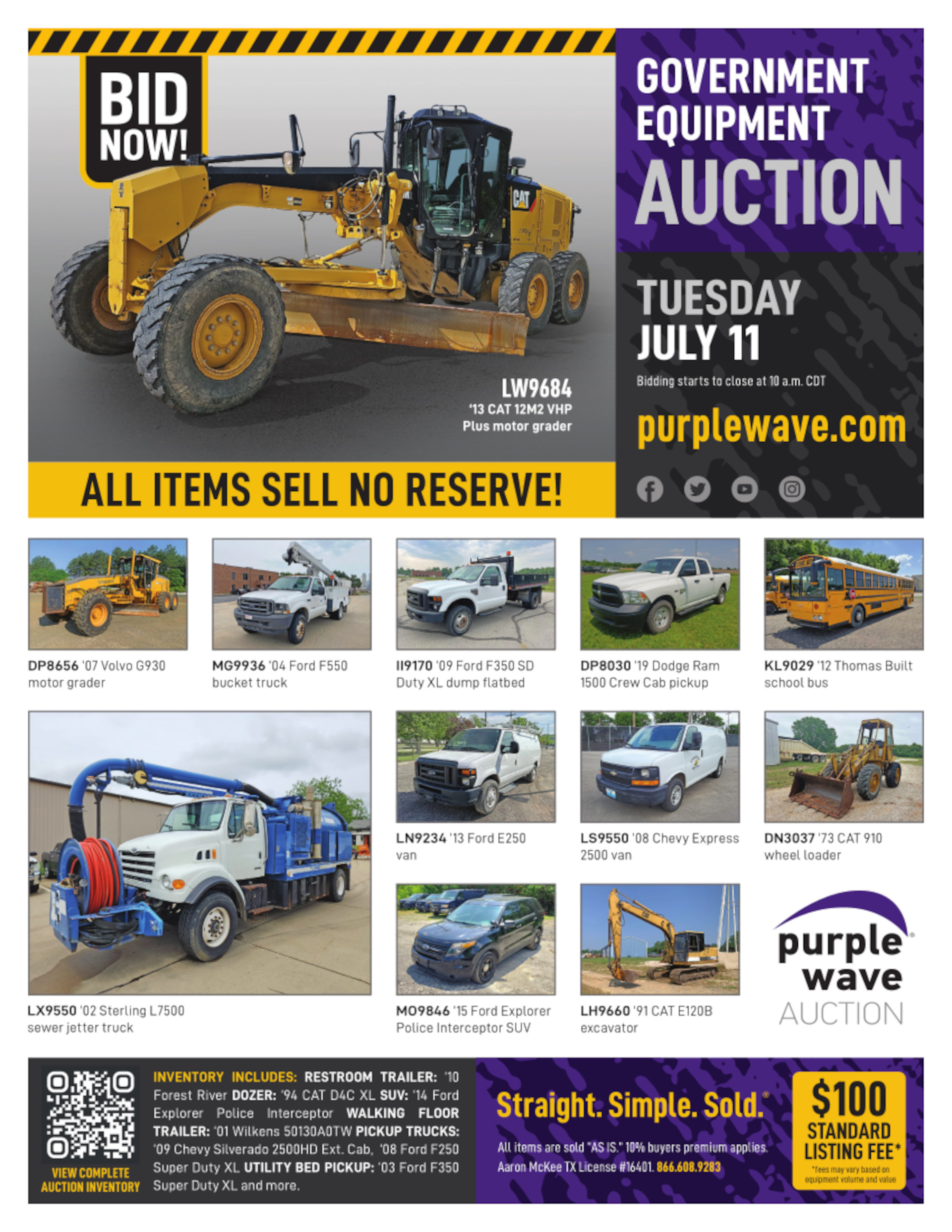 This auction is conducted by Purple Wave, Inc., whose home office is 825 Levee Drive, Manhattan, Kansas. Aaron McKee, Texas auctioneer license # 16401, operates Purple Wave, Inc. Complaints against us may be directed to the Texas Department of Licensing and Regulation, P.O. Box 12157, Austin, Texas 78711, (512) 463-6599. For additional required information, see the attached document.