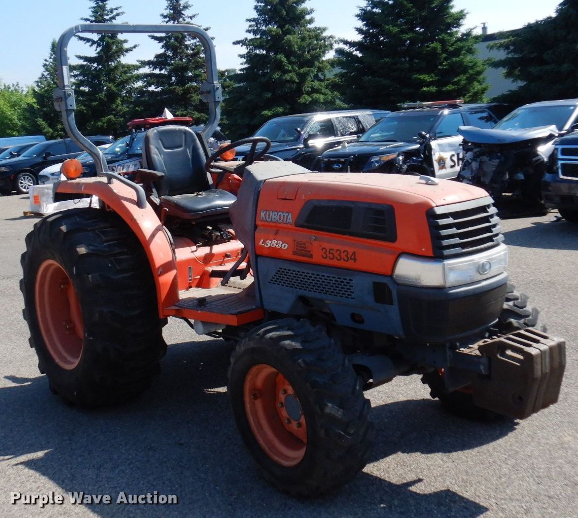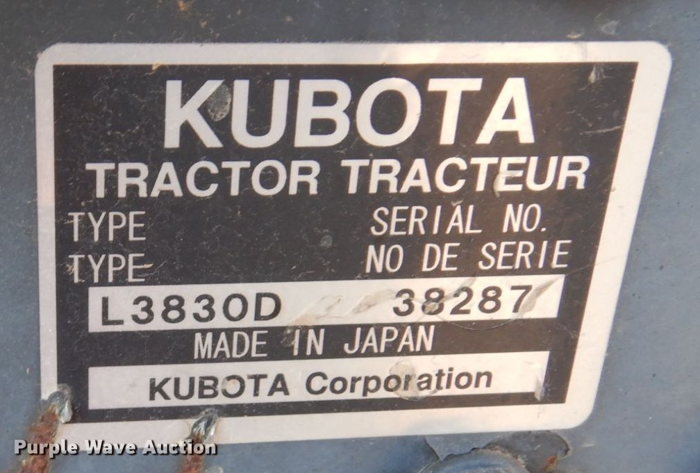 Purple Wave is selling a used Tractor in Minnesota. This item is a Kubota L3830D MFWD tractor with the following: Hours: 818 on meter, Serial: 38287