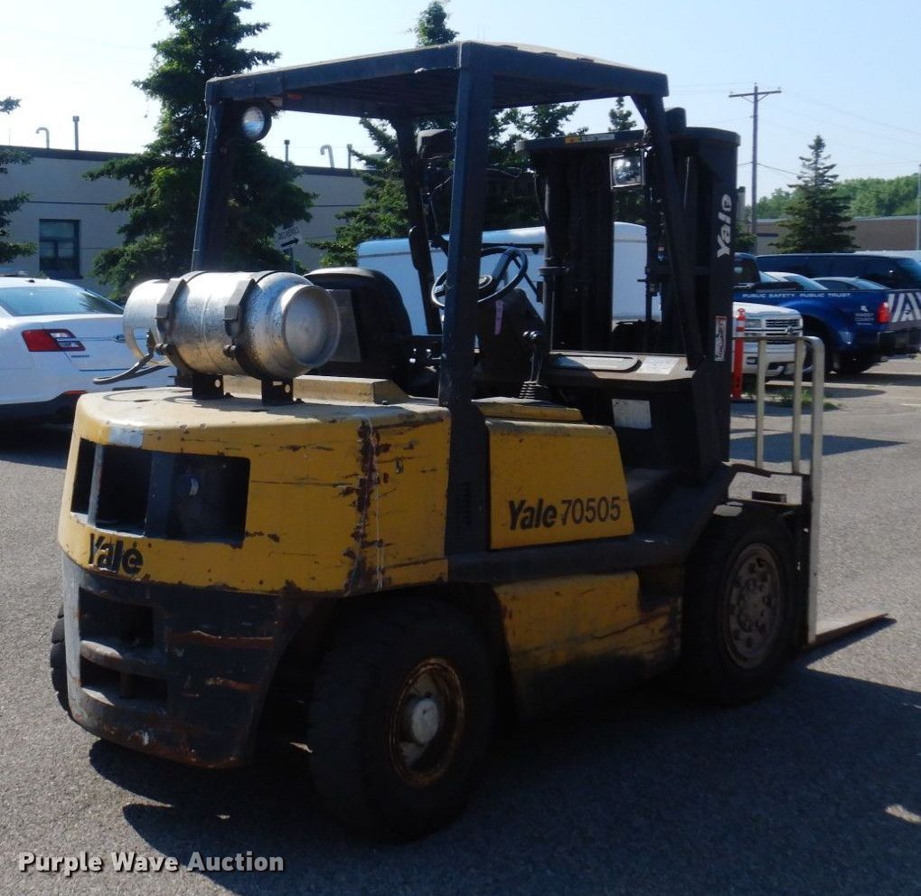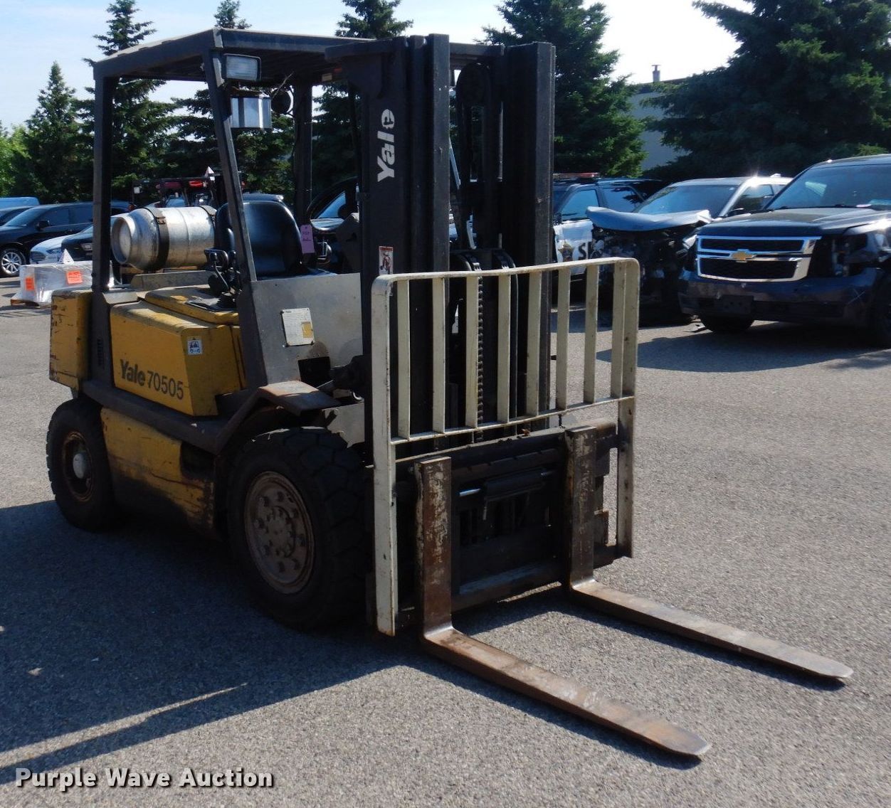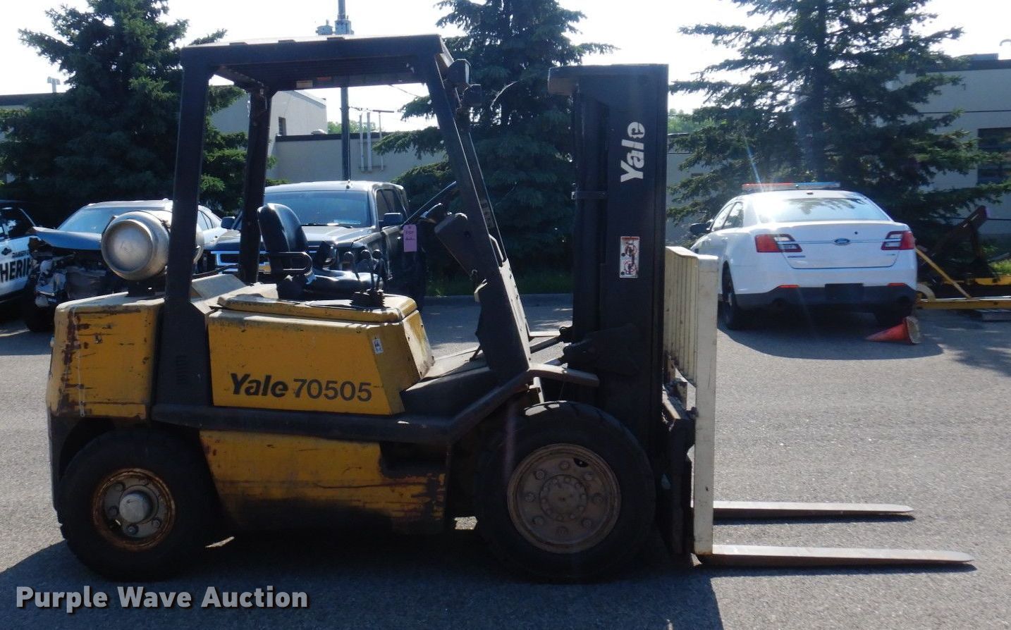 Purple Wave is selling a used Cushion Tire or Pneumatic Forklift in Minnesota. This item is a Yale GLP070LGNGBE083 forklift with the following: Hours: 1,966 on meter, Serial: B813D02695U, Unit #: 70505