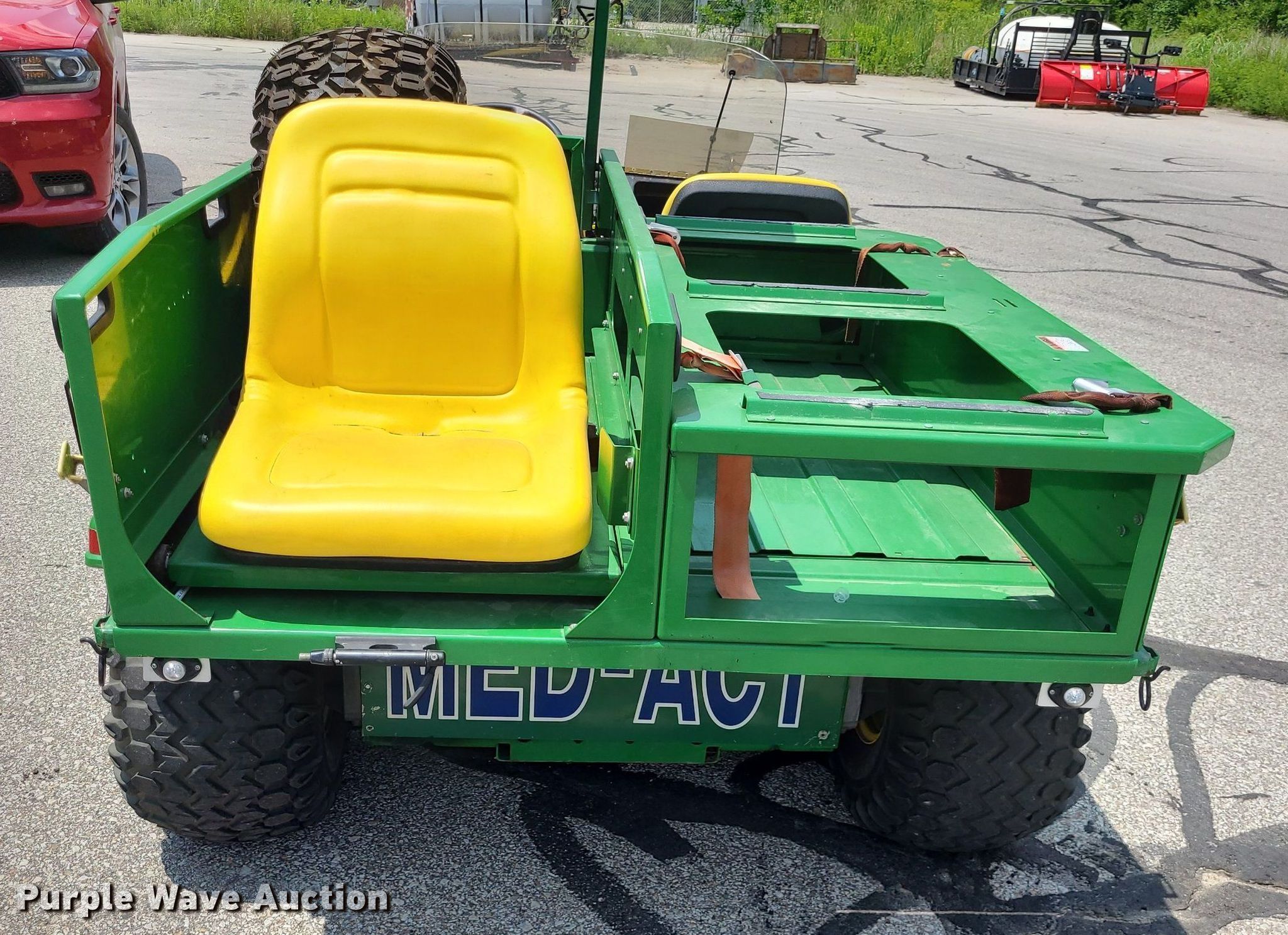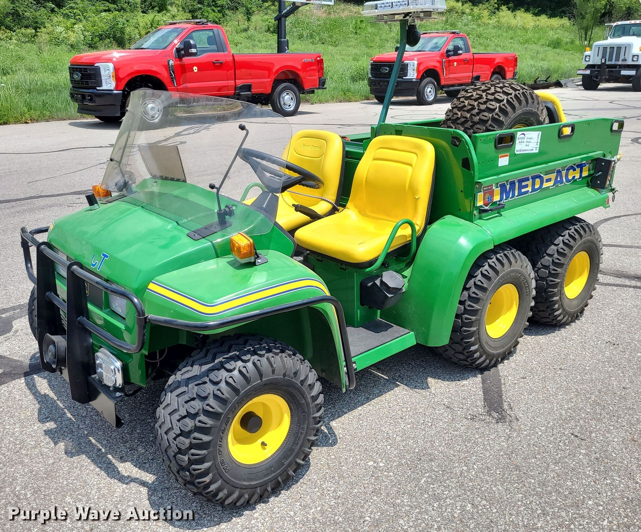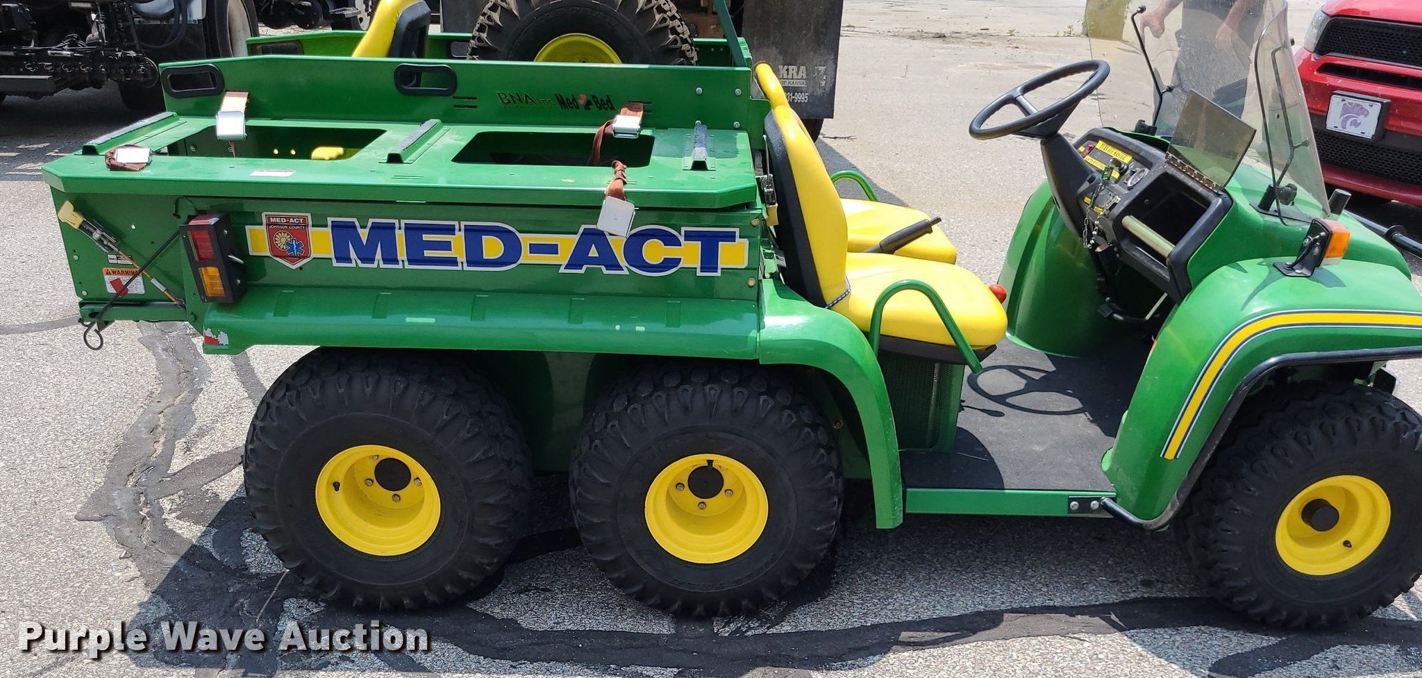 2001 John Deere Gator utility vehicle. Hours: 693 on meter, VIN: W006X4X057463. Engine Fuel type: Gas. Transmission Hydrostatic. Features Med bed BNA, Rear seat, Emergency lights and sirens. Tires Size: 10.00-8, Brand: Titan. Notes Former MED-ACT unit. Transfer of ownership documentation will be a bill of sale. Johnson County, KS. 1800 W Old 56 Hwy. Olathe, KS 66061