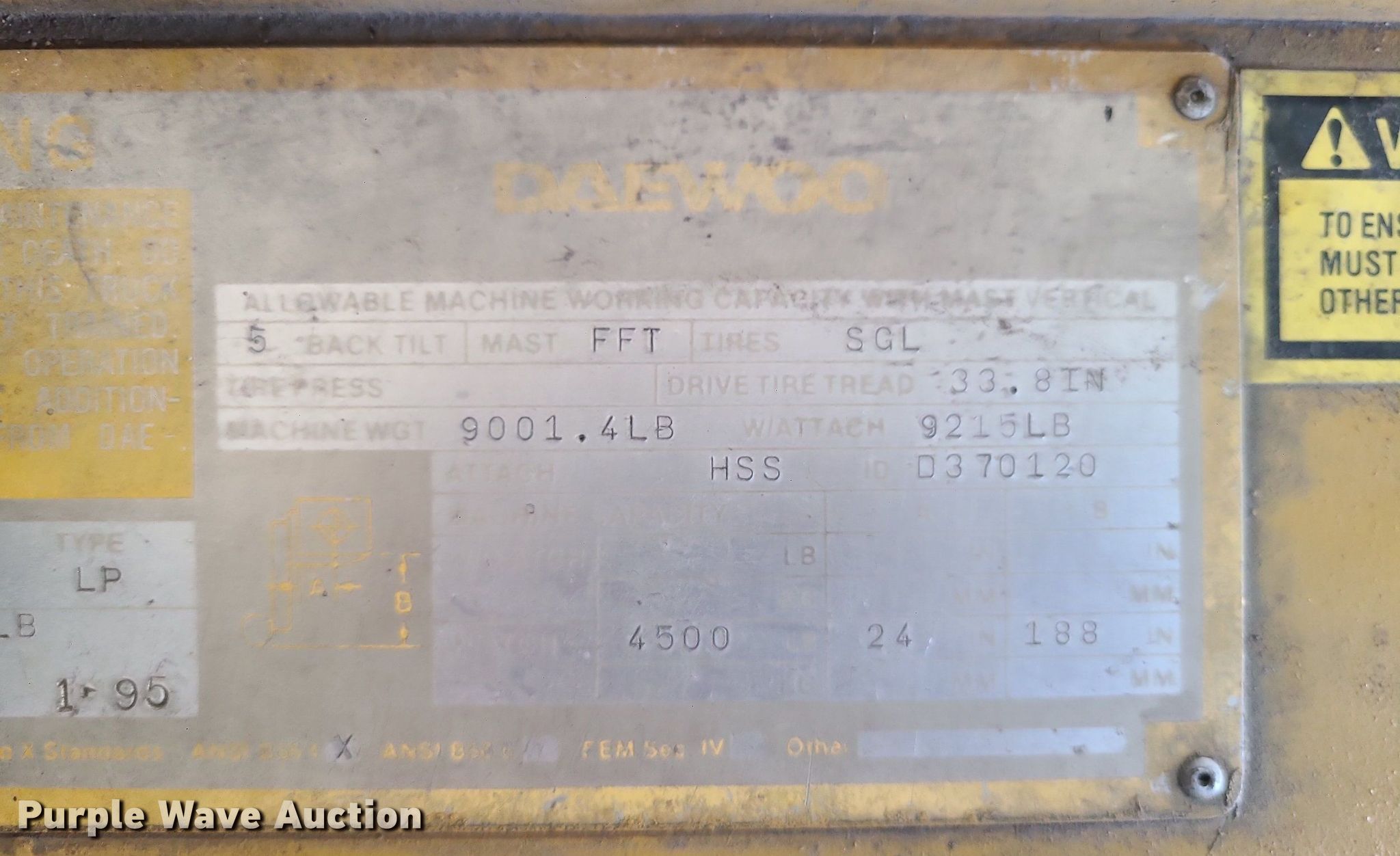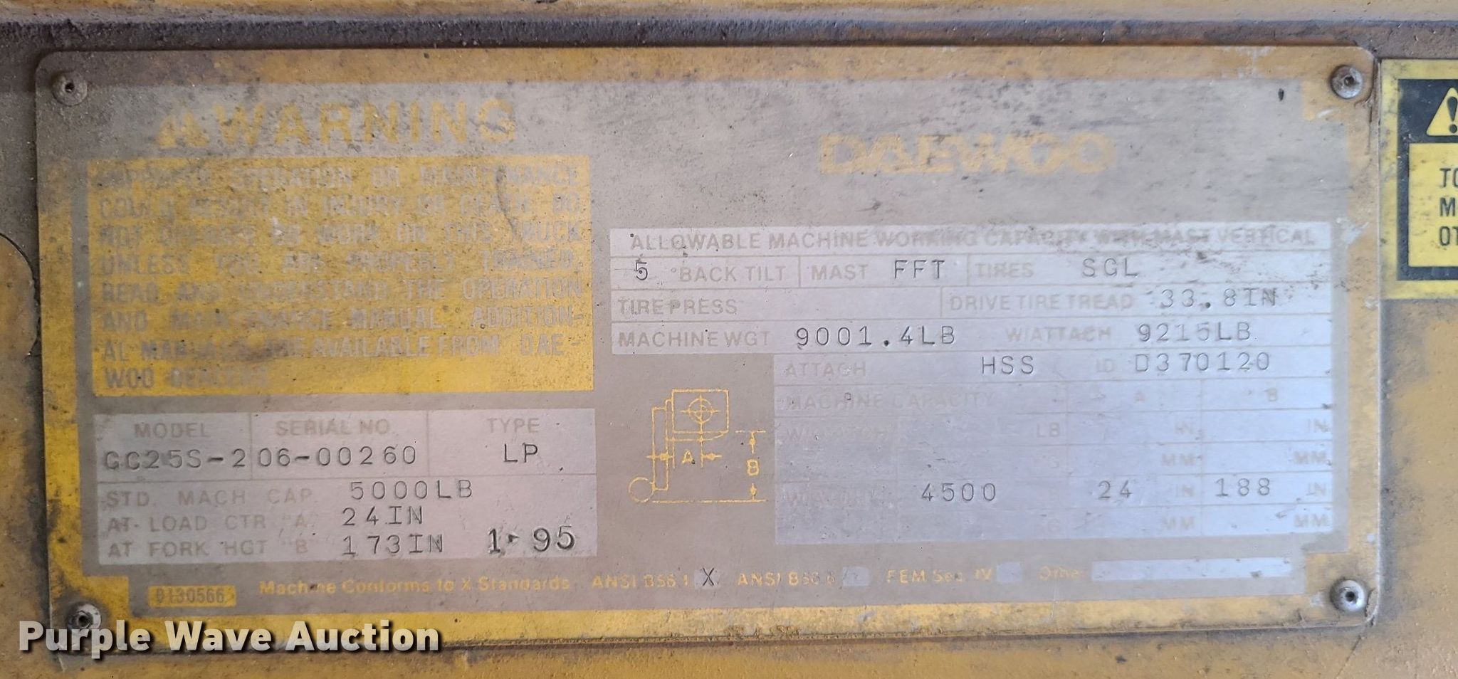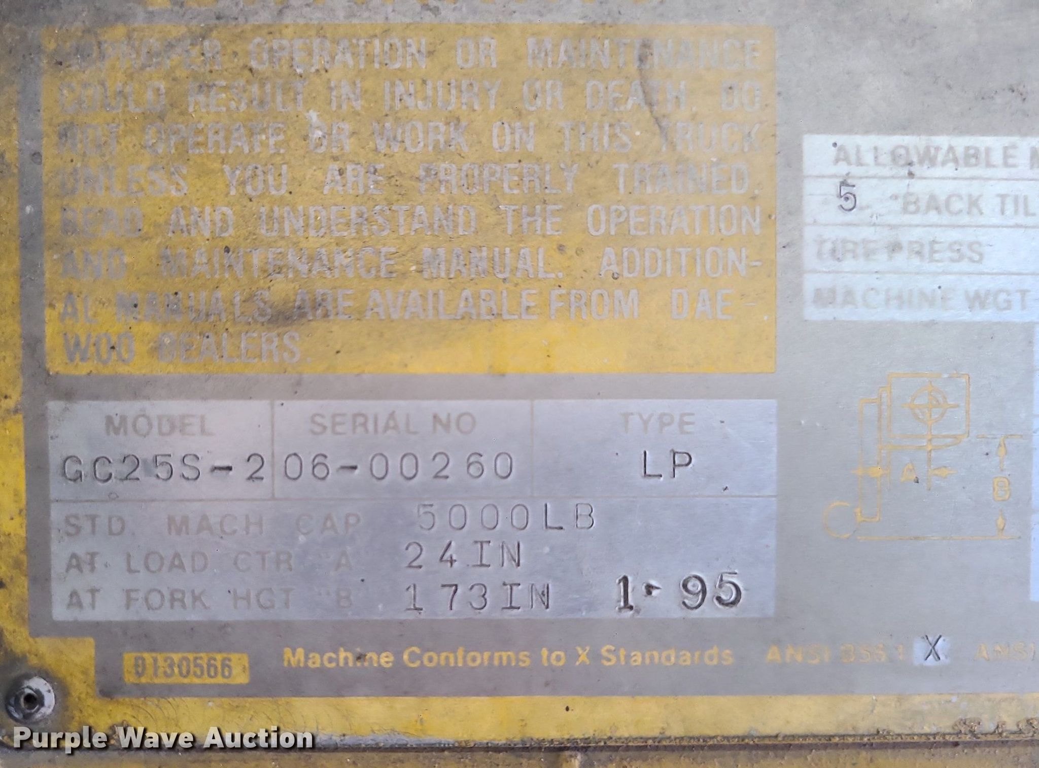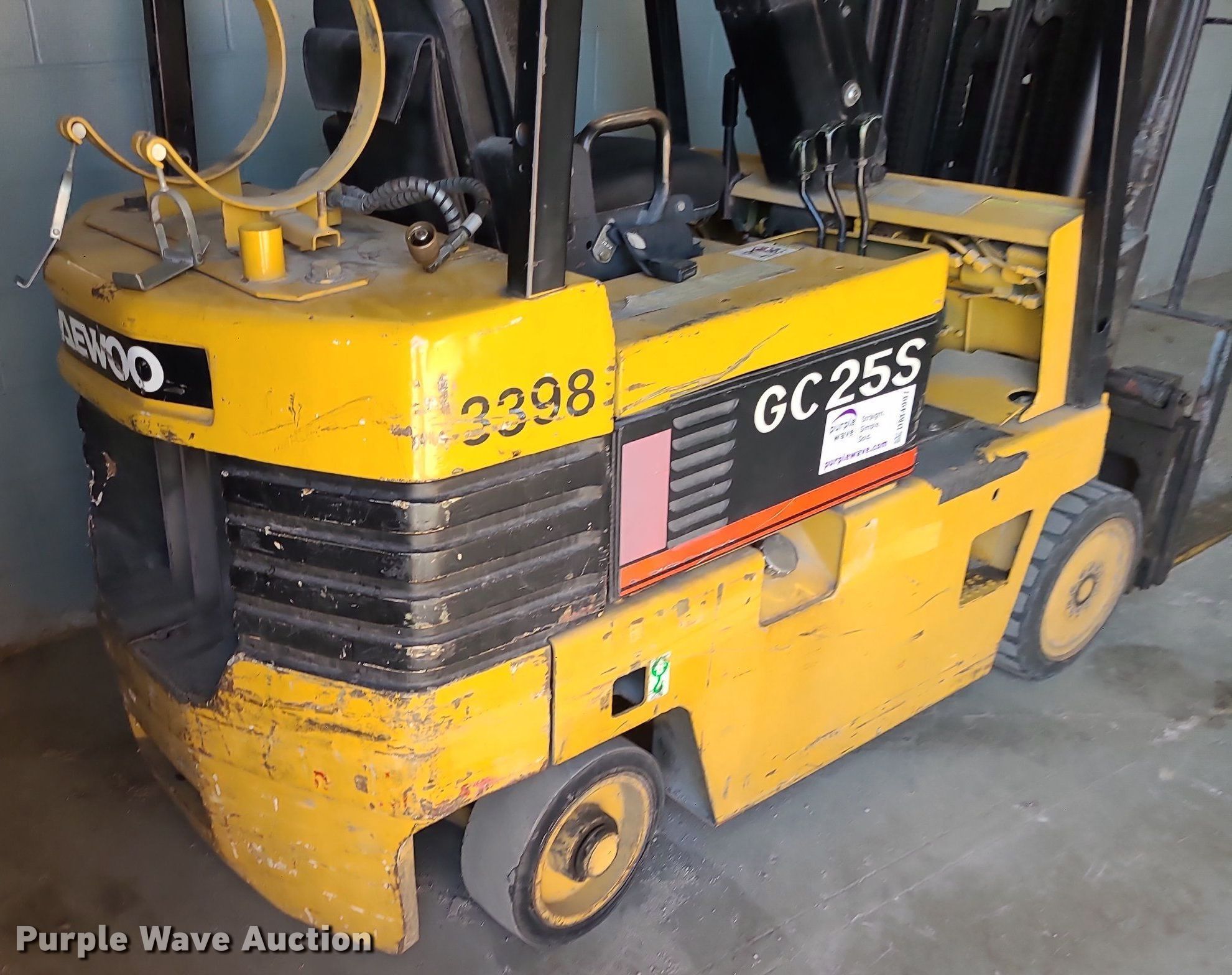 Purple Wave is selling a used Warehouse Forklift in Missouri. This item is a Daewoo GC25S forklift with the following: Serial: 060026
