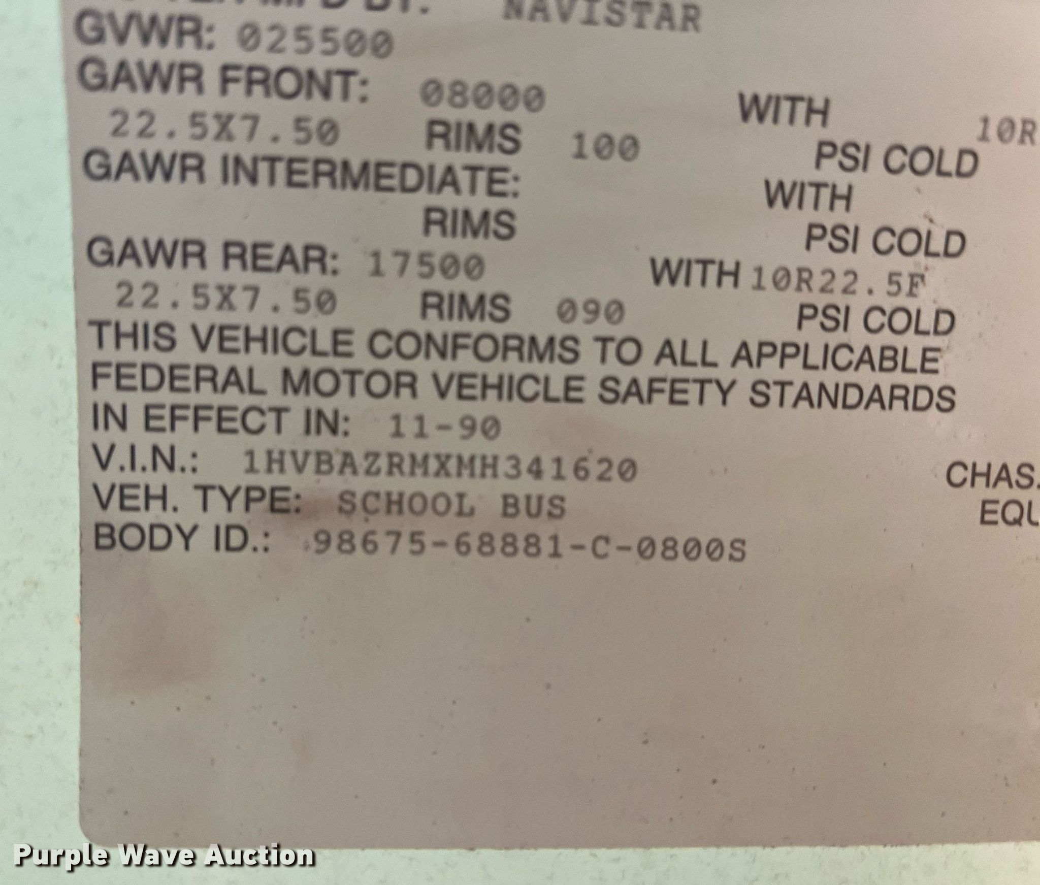 Purple Wave is selling a used Bus in Oklahoma. This item is a 1991 International 3700 school bus with the following: Miles: 89,931 on odometer, VIN: 1HVBAZRMXMH341620