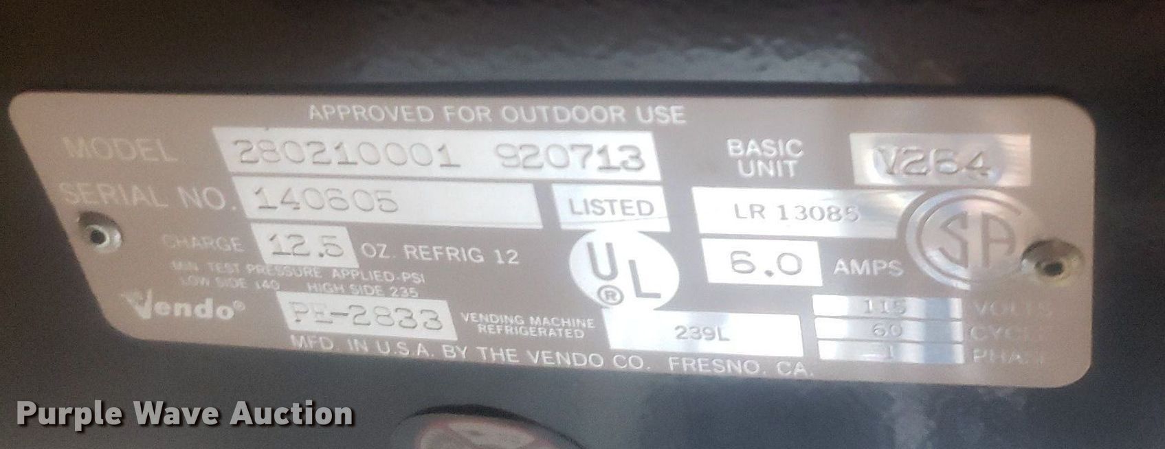 Purple Wave is selling a used Retail Displays in Kansas. This item is a Vendo vending machine with the following: Serial: 140605, Volts: 115, Phase: Single