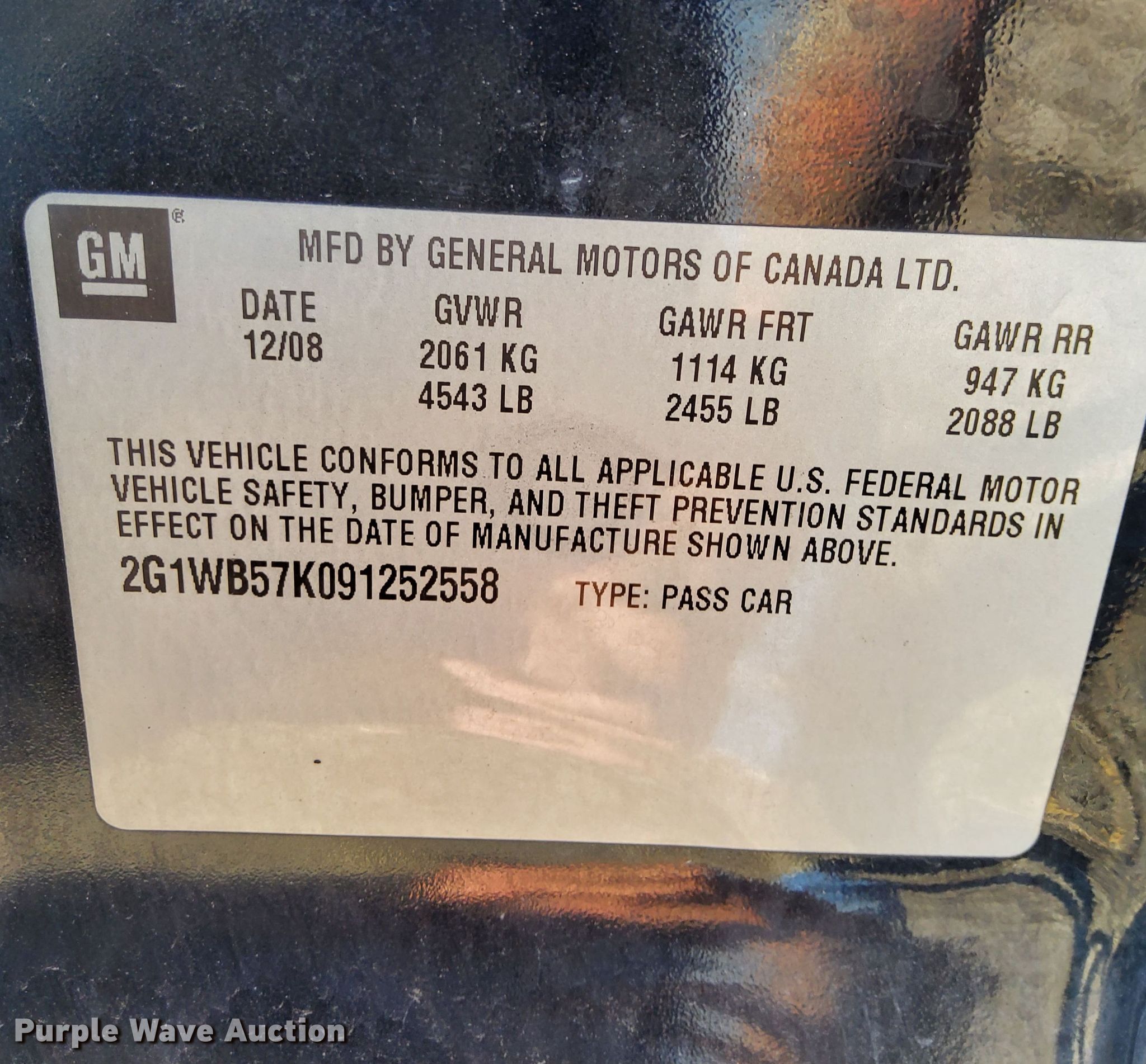 2009 Chevrolet Impala. Miles: 100,283 on odometer, VIN: 2G1WB57K091252558. Engine Displacement: 3.5L V6 OHV, Cylinders: 6, Fuel type: Gas. Transmission Automatic. Interior AC, Heat, Seat: Power driver, Power windows, Power locks, Cruise control. Tires Size: 225/60R16. Notes Law enforcement equipment not included. Kansas title. City of Derby. 3531 East 55th Street South. Derby, KS 67037