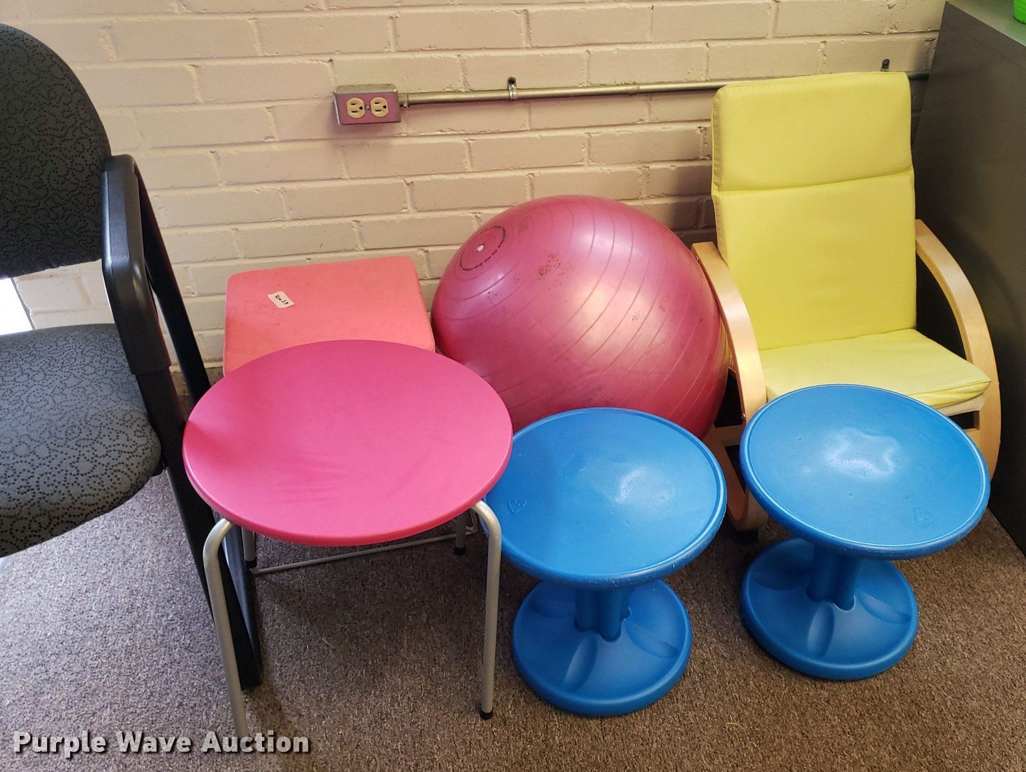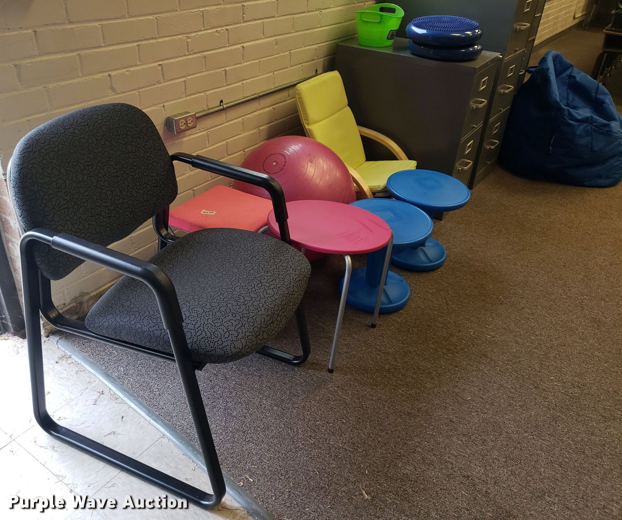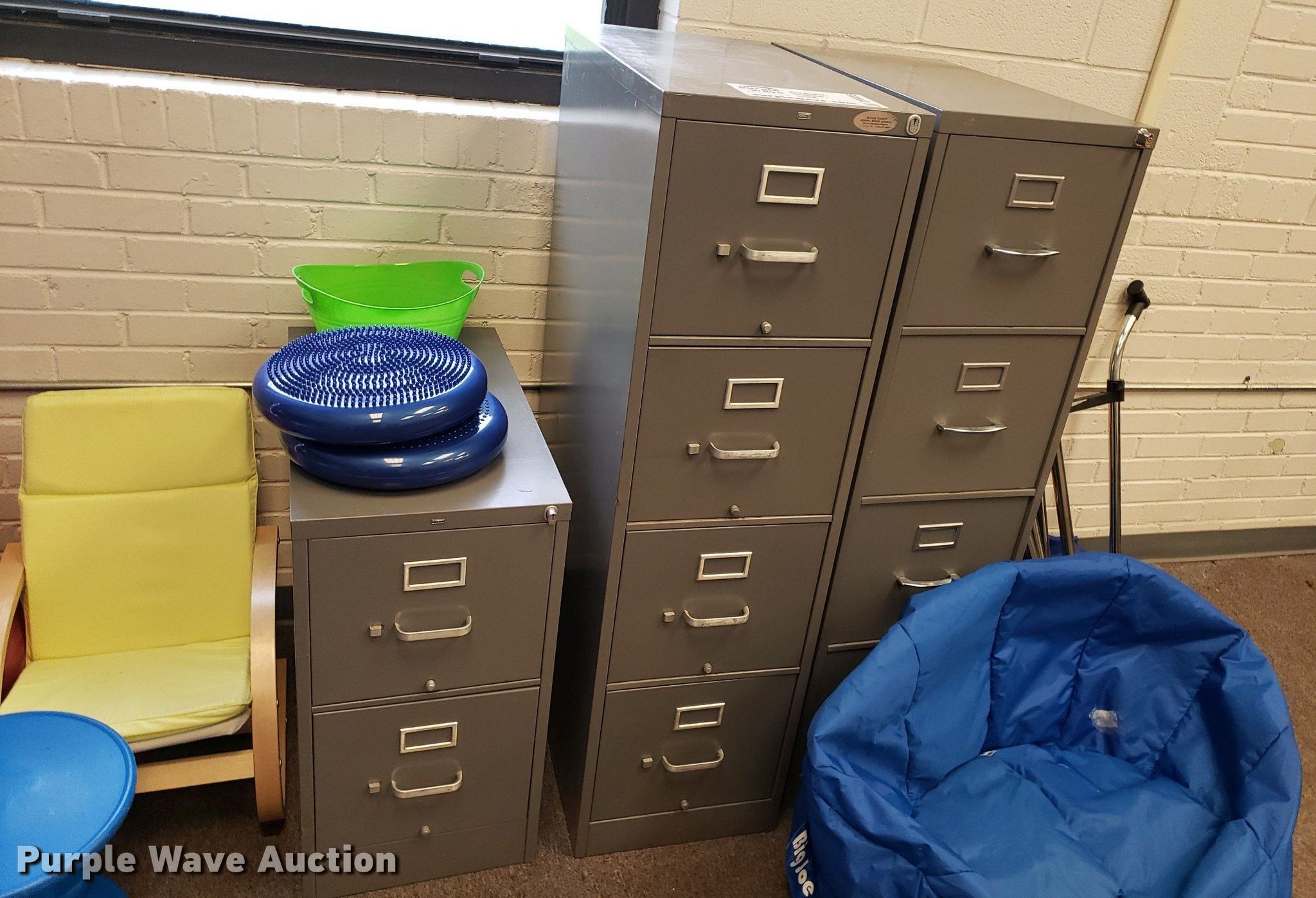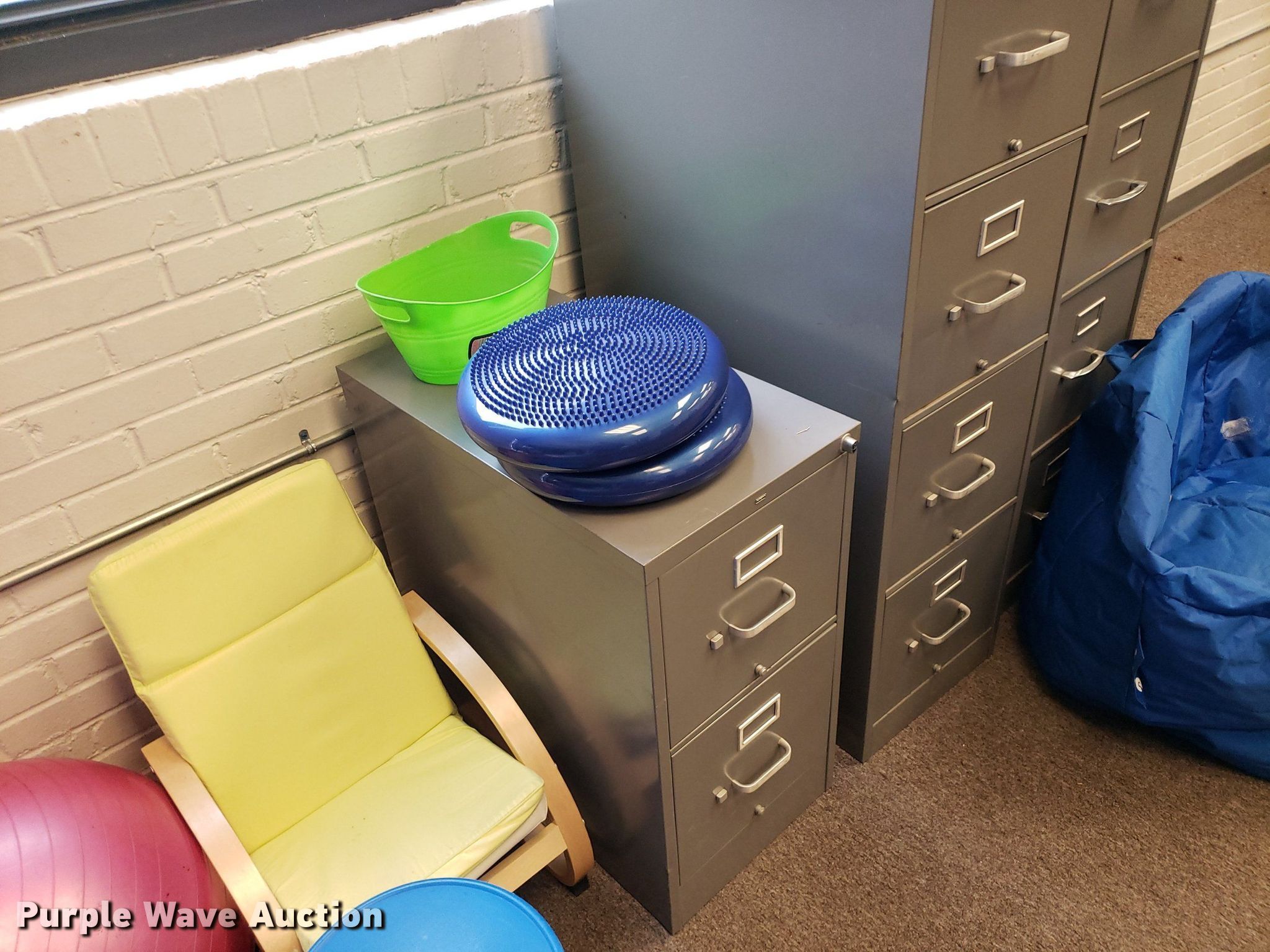 Purple Wave is selling a used Furniture in Kansas. This item is a Furniture with the following: (3) file cabinets, (4) stools, (2) chairs and more