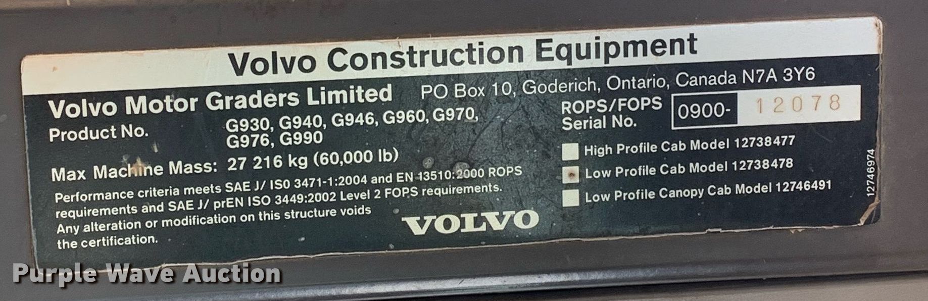 Purple Wave is selling a used Motor Grader in Texas. This item is a 2007 Volvo G930 motor grader with the following: Hours: 8,121 on meter, Serial: VCE0G930T00040069