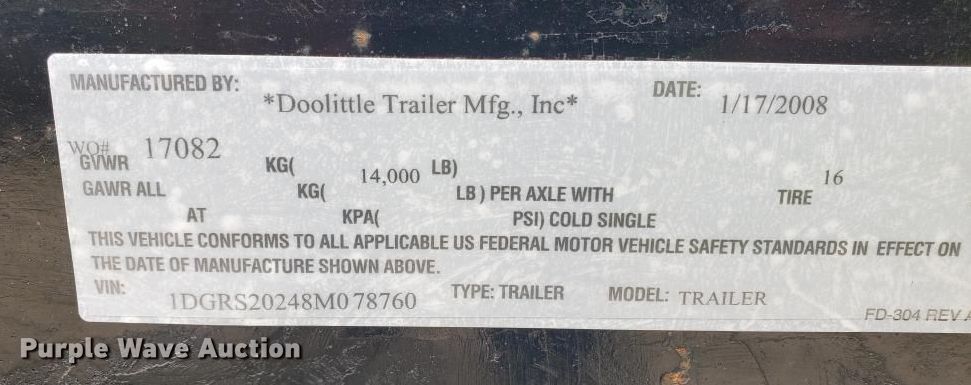 Purple Wave is selling a used Equip. Trailer in Missouri. This item is a 2008 Doolittle equipment trailer with the following: VIN: 1DGRS20248M078760