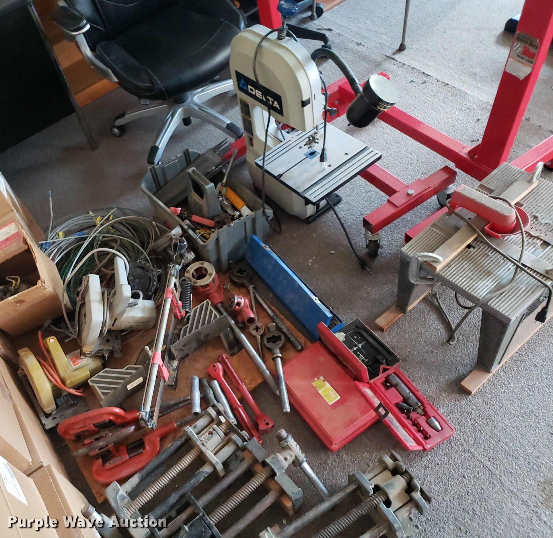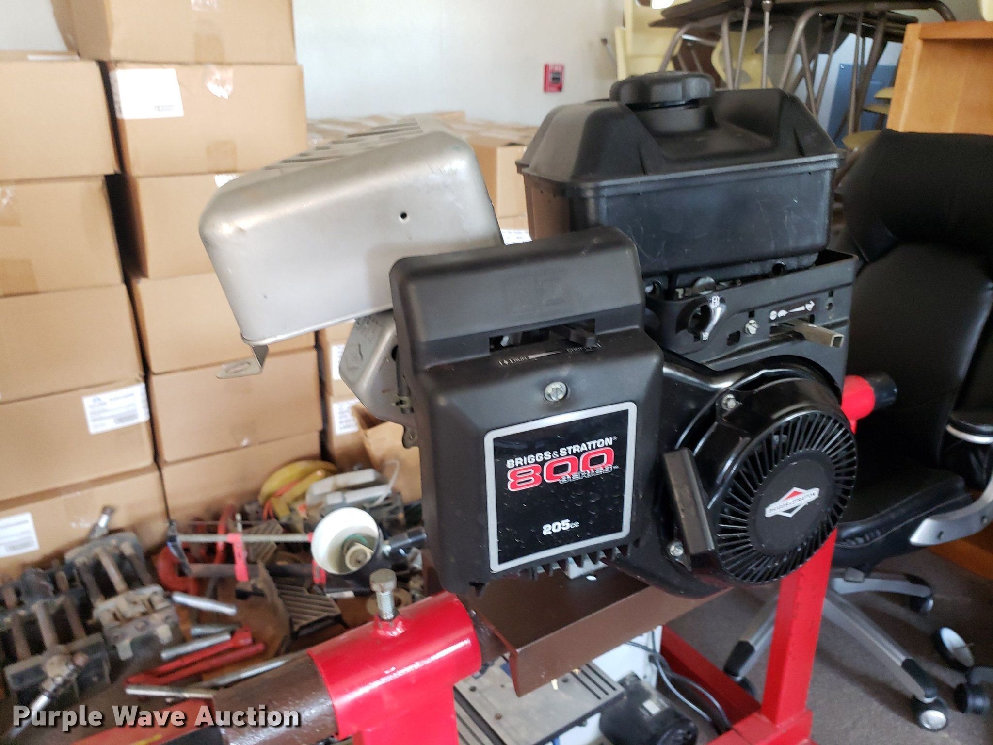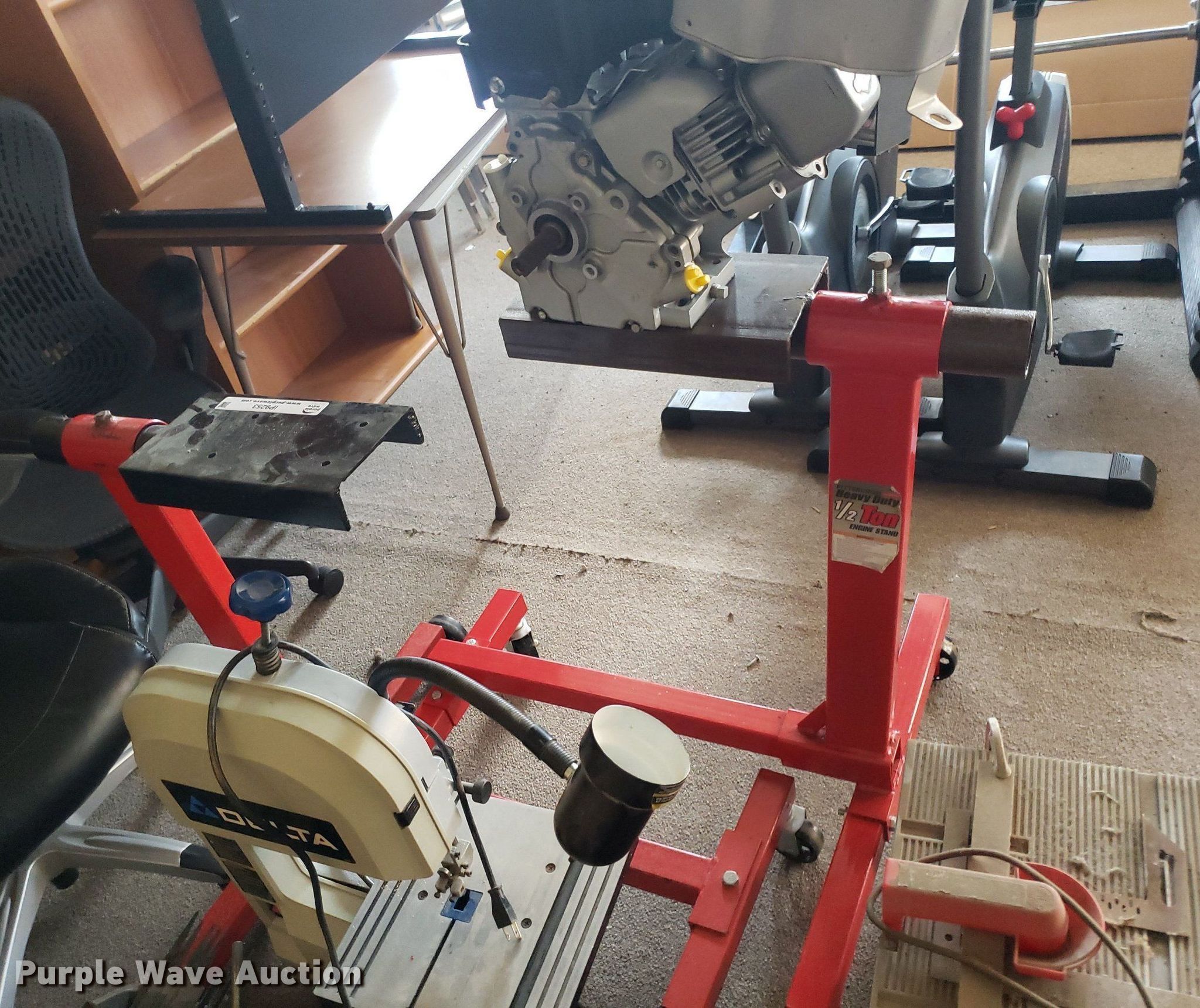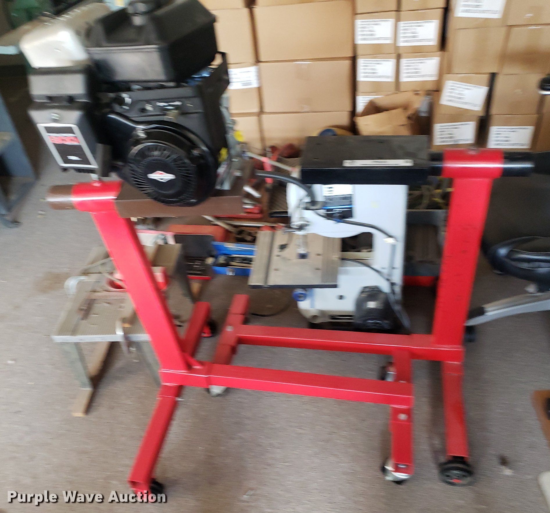Purple Wave is selling a used Machine Shop Tools and Equip. in Kansas. This item is a Tools with the following: Briggs & Stratton engine, Displacement: 205 cc, (2) Pittsburgh engine stands, (2) saws, Router table, Delta band saw, Clamps, Pipe cutters and more, Unknown operating conditions