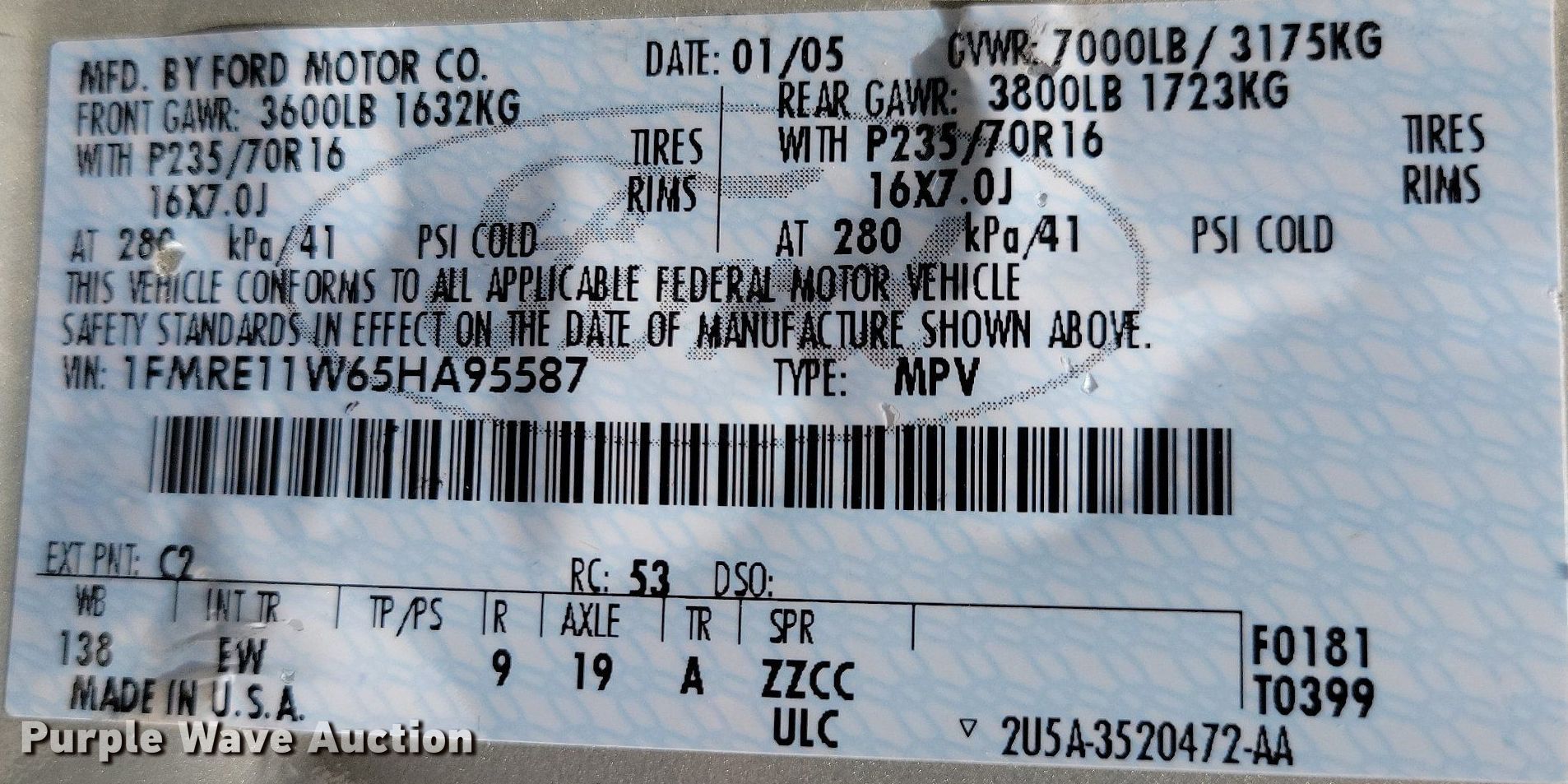 2005 Ford E150 XLT van. Miles: 210,849 on odometer, VIN: 1FMRE11W65HA95587. Engine Displacement: 4.6L V8 SOHC, Cylinders: 8, Fuel type: Gas. Interior AC, Heat, Power windows, Power locks, Cruise control. Tires Size: 235/70R16. Notes Dash warning indicator: Check engine. Iowa title. Seller is a government entity who will be assigning and distributing the title. Please contact the seller for distribution questions. Greene County Community Schools. 1577 235th St. Jefferson, IA 50129
