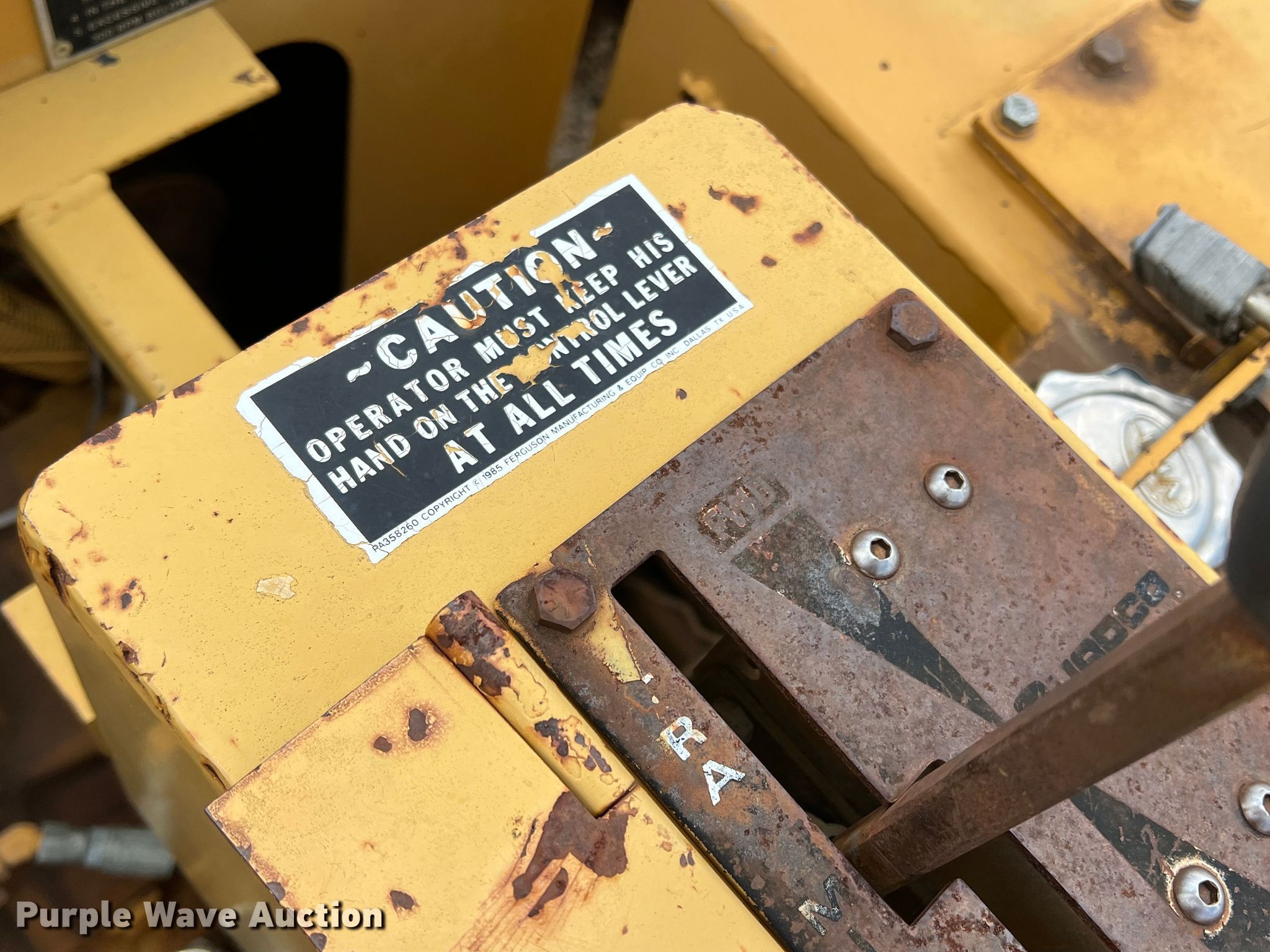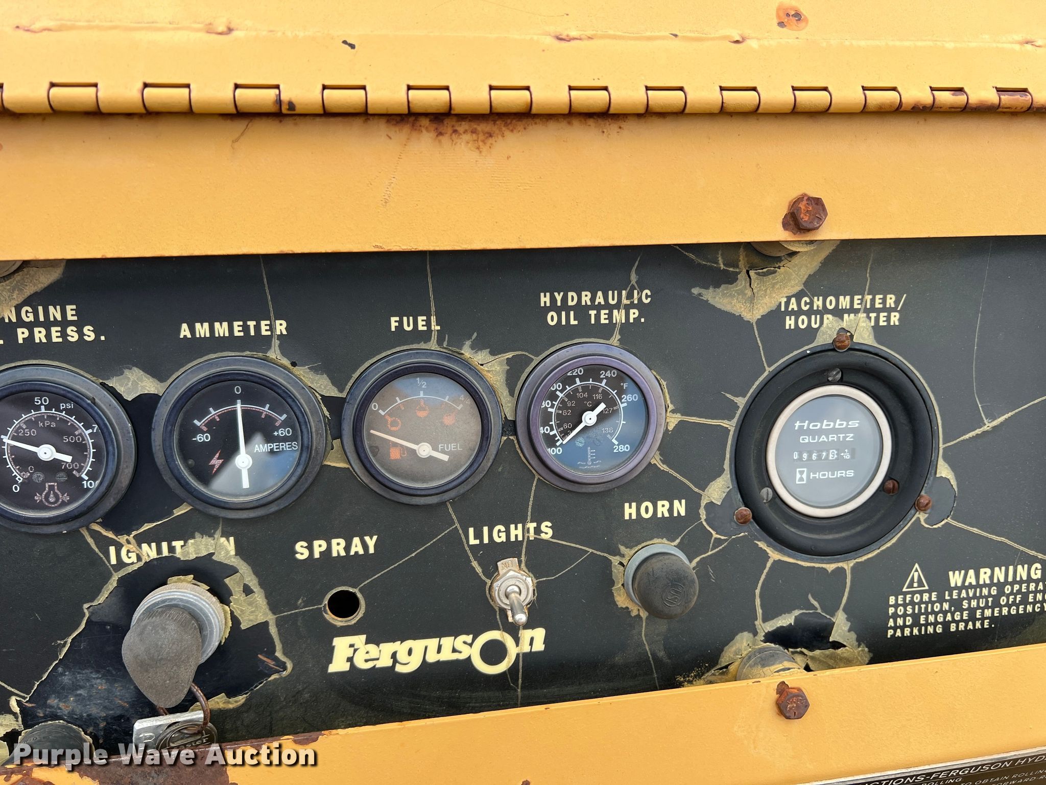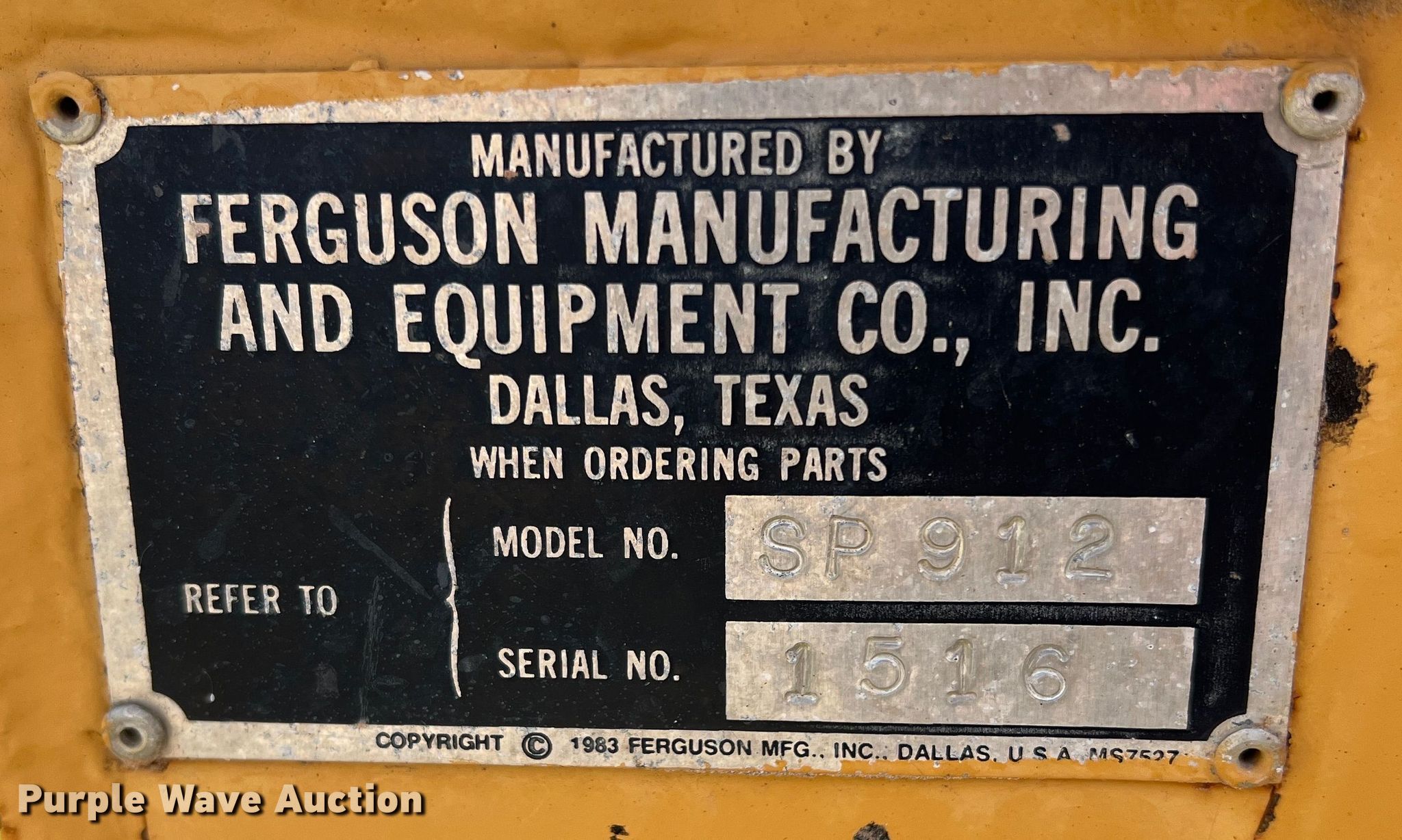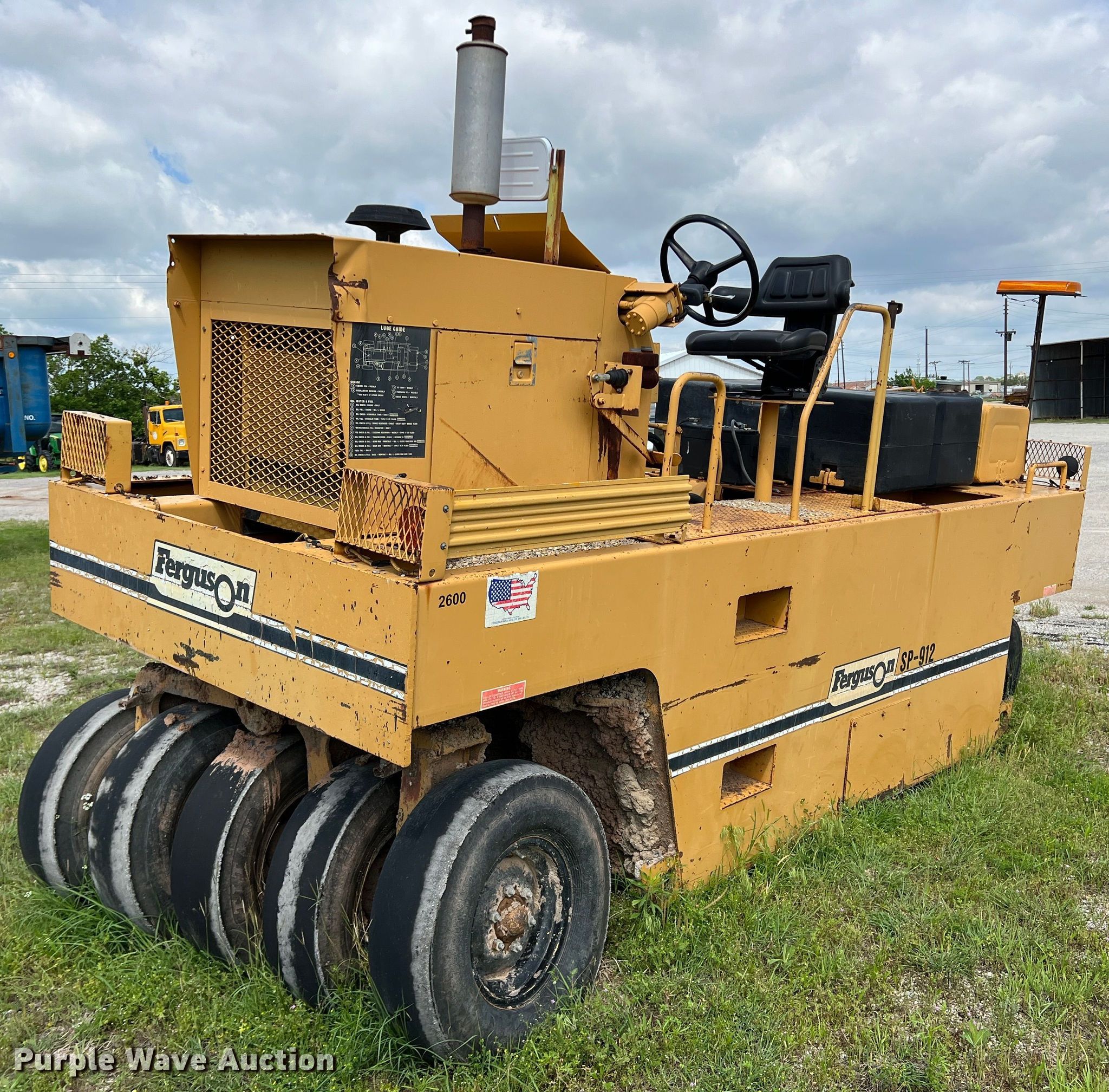 1999 Ferguson SP912 pneumatic roller. Hours: 968 on meter, Serial: 1516. Engine John Deere , Cylinders: 4, Fuel type: Diesel. Transmission Hydrostatic, 4F - 4R. Tires Size: 7.50-150, Quantity: 9. Notes Flat tire, Unknown operating condition. 102 West College Street. Burkburnett, TX 76354
